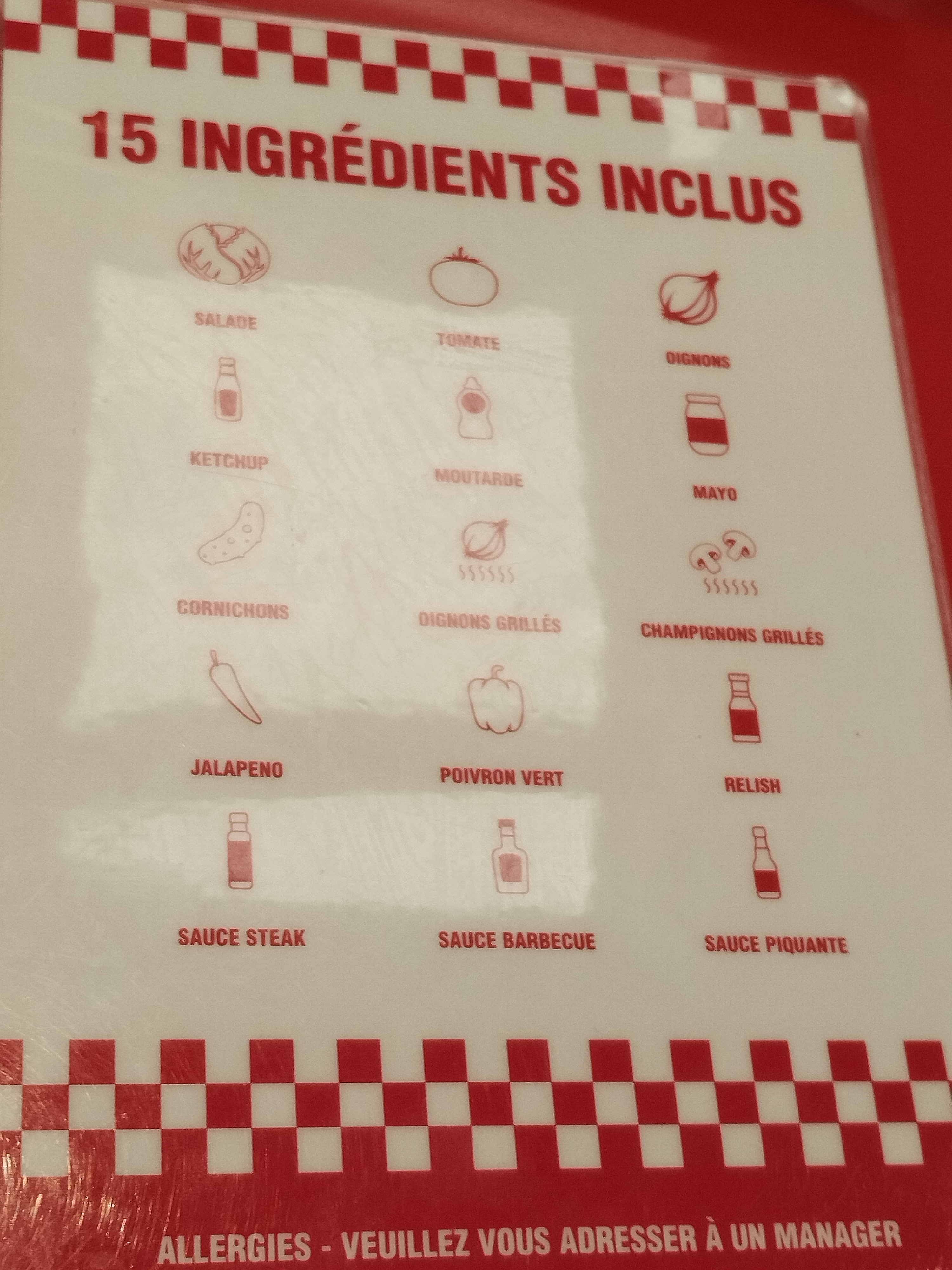 Très bon, mais légèrement cher pour un fast-food. Très grand choix de boissons, et lors de la commande, on doit choisir chaque ingrédient du burger.