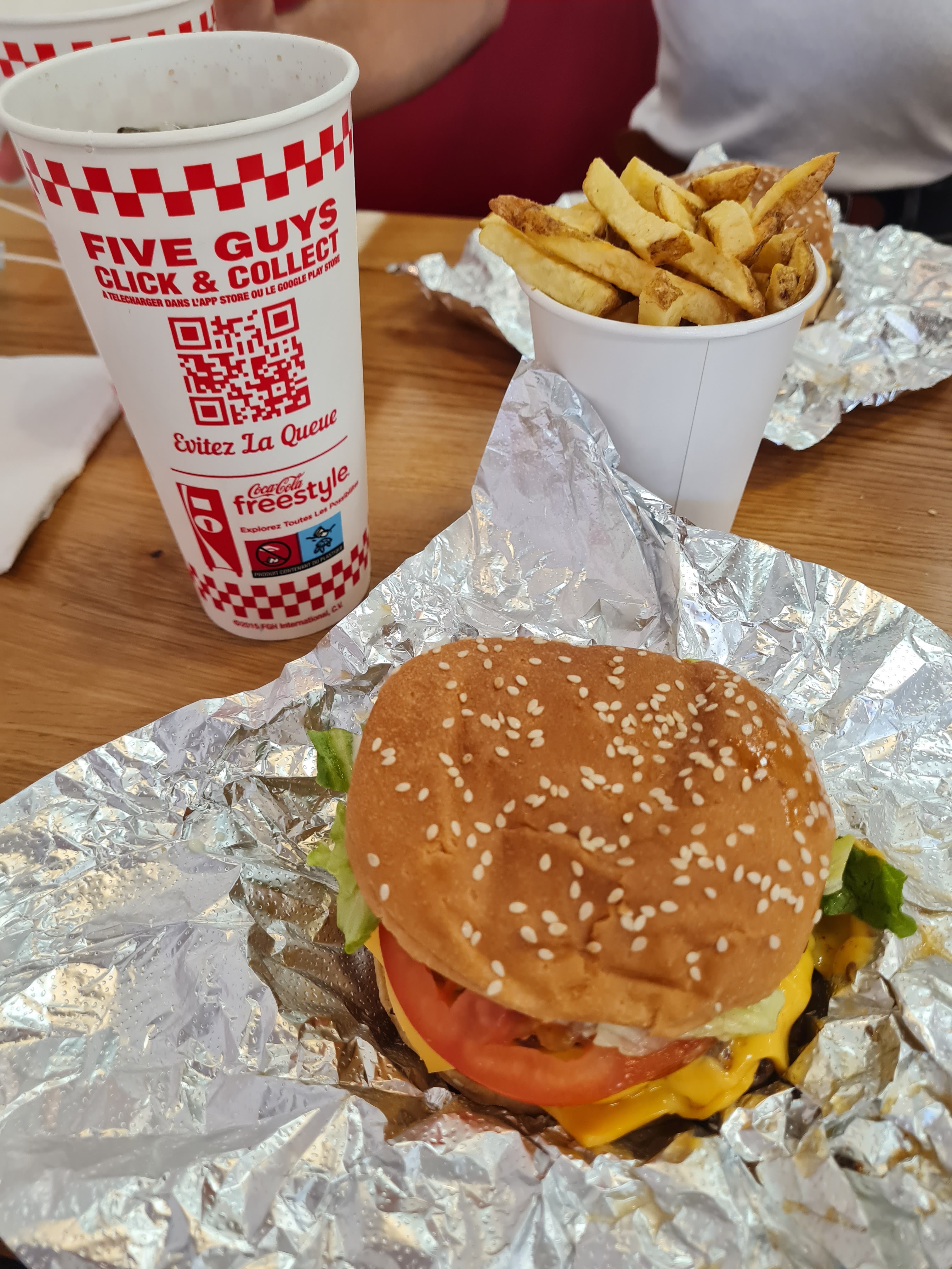 Première fois chez Five Guys. Rien que pour les frites ça valait le détour. Les burgers sont très bons aussi et le personnel très accueillant. Ça change.... Une bonne expérience !