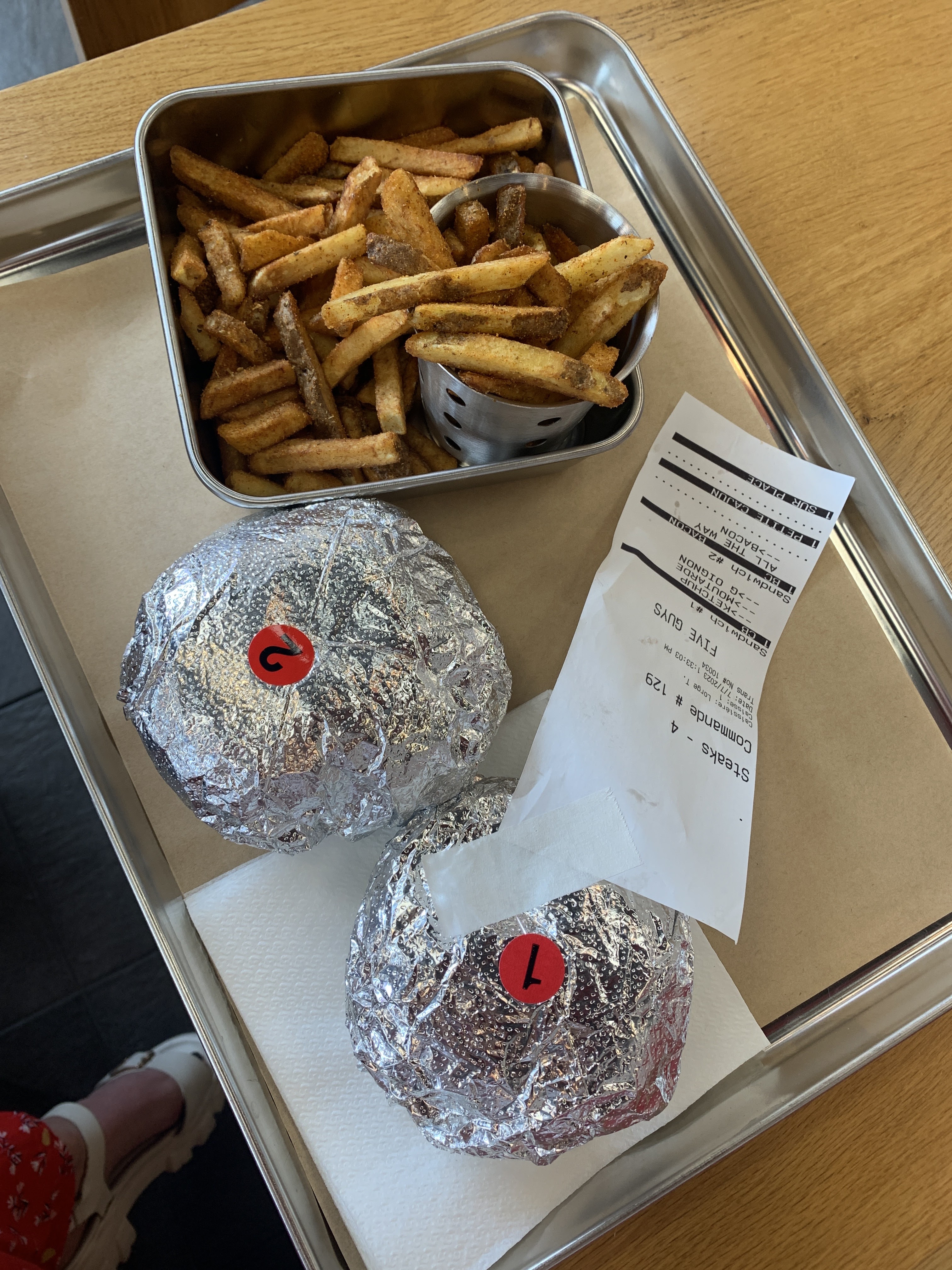 Première expérience dans ce restaurant Five guys. Bel accueil. Équipe sympathique. On est arrivés « tôt » (11h30). Les burgers étaient bien assemblés (ça donné envie) et très bons. J’aurai aimé beaucoup plus d’épices sur les frites parce que je les aime comme ça mais elles étaient très bonnes. Ce que j’ai apprécié : proposition de sauce si besoin (autre que le ketchup et mayonnaise en libre service) de la part du manager. Je reviendrai. 👍