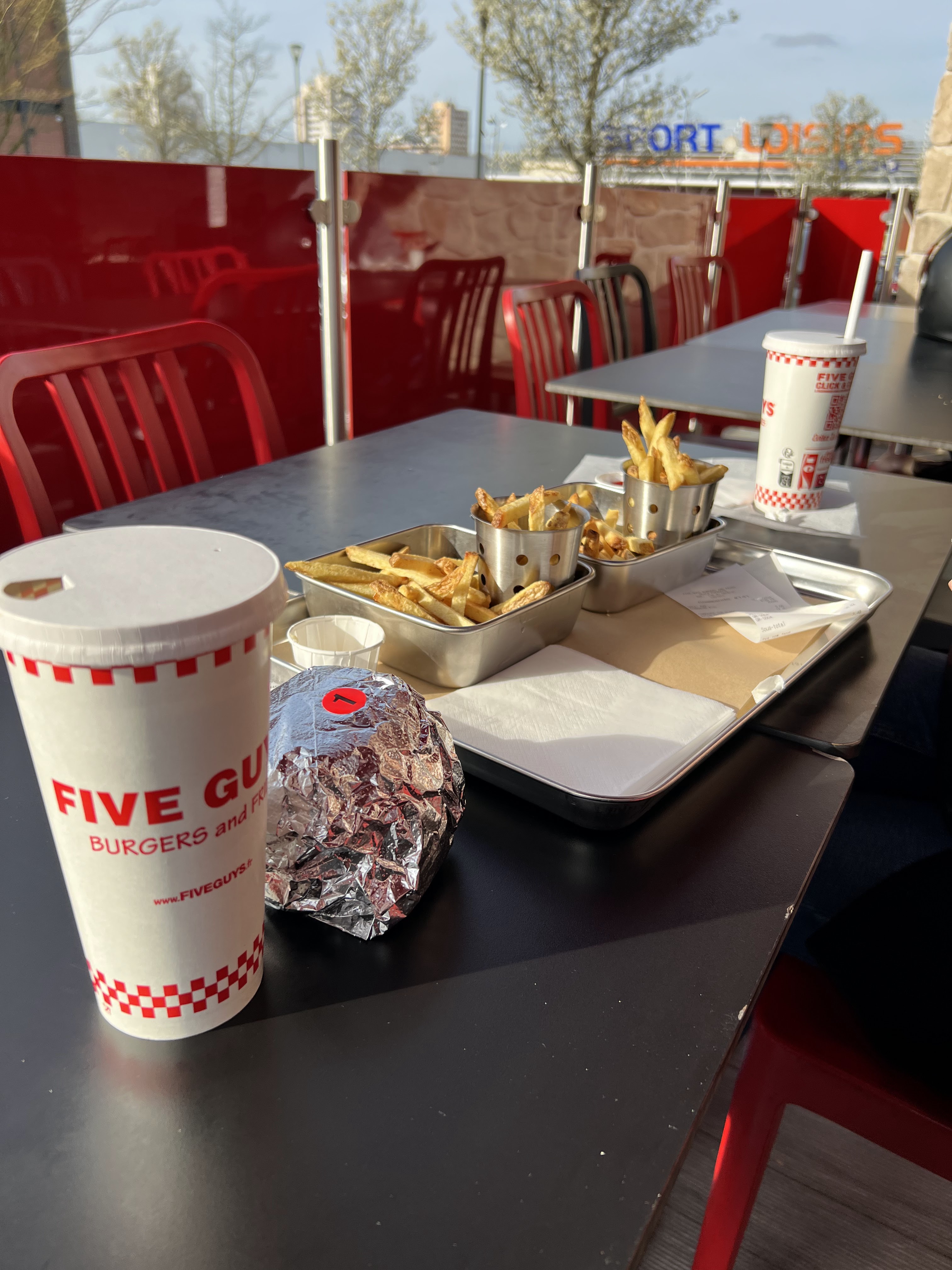 Five guys est de loin le meilleure fast food pour moi !! Tout est frais et absolument délicieux : du burger aux frites cajun (épicées) et même les milkshake si vous avez encore de la place. Les prix à première vue paraissent élevés mais on est calé avec un seul burger contrairement aux autres fast food.
