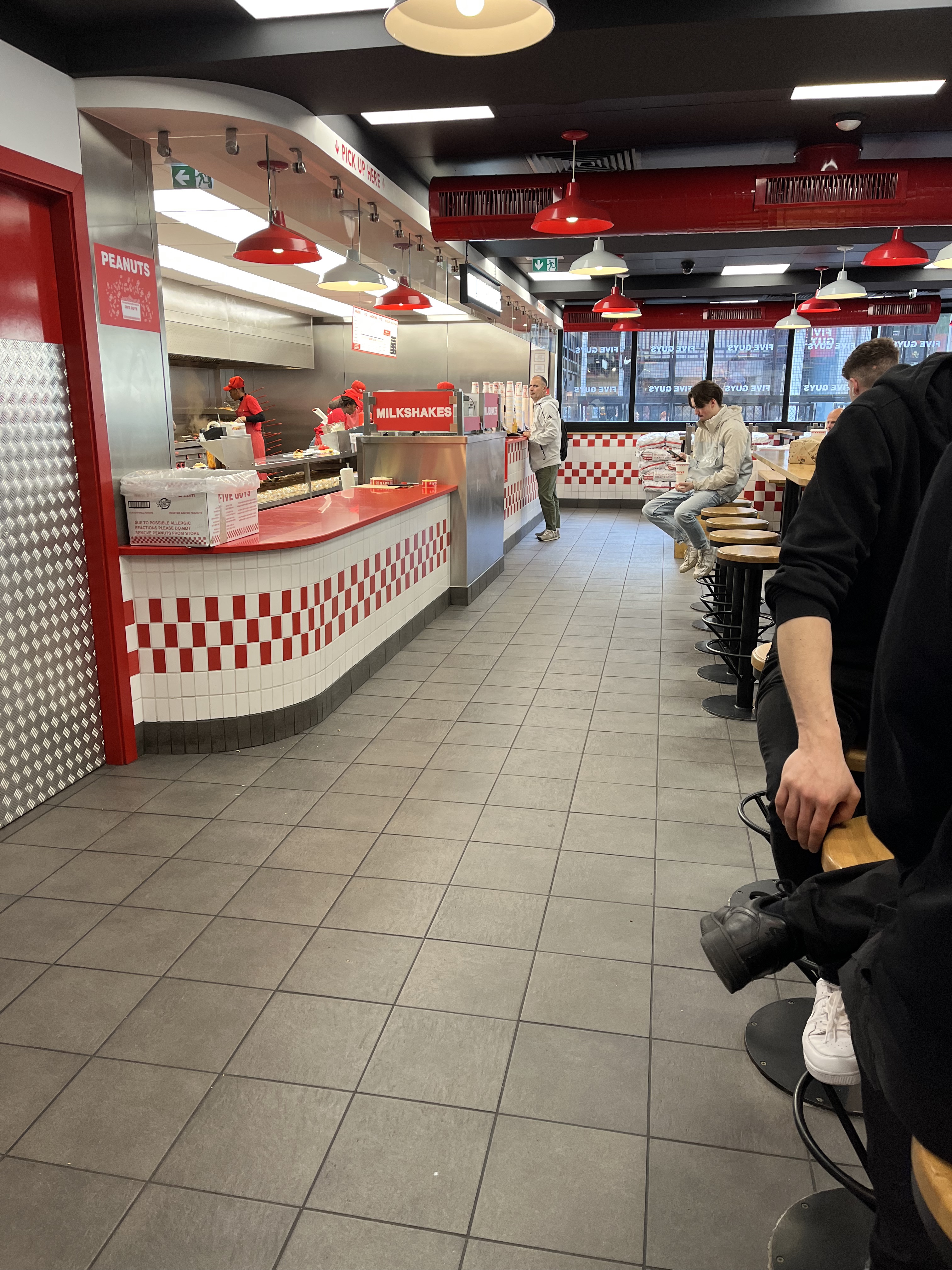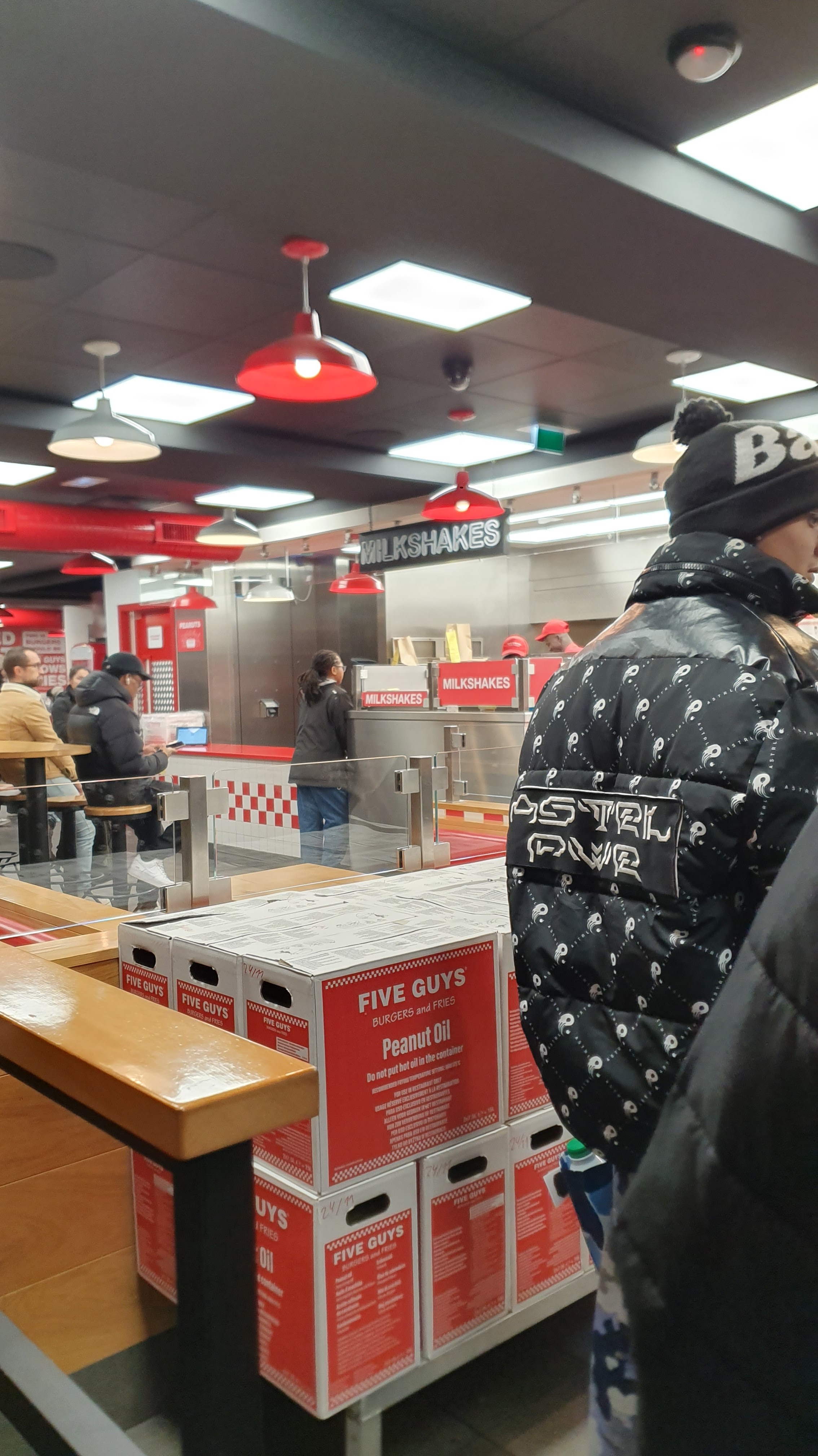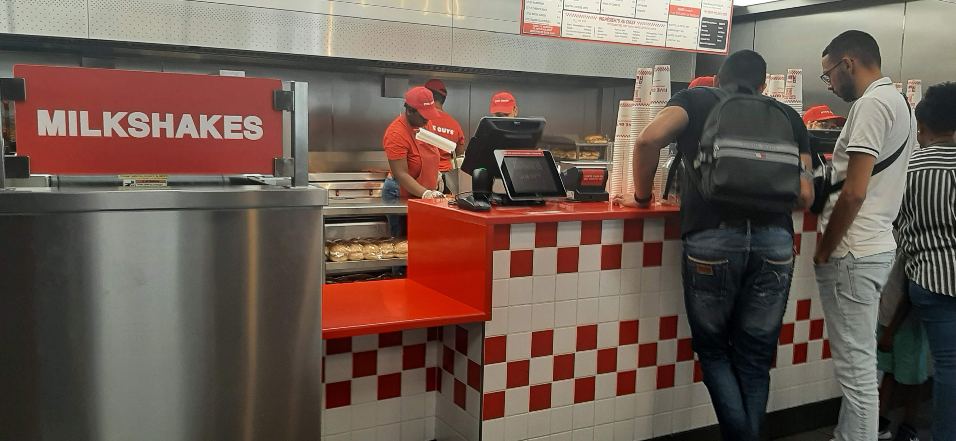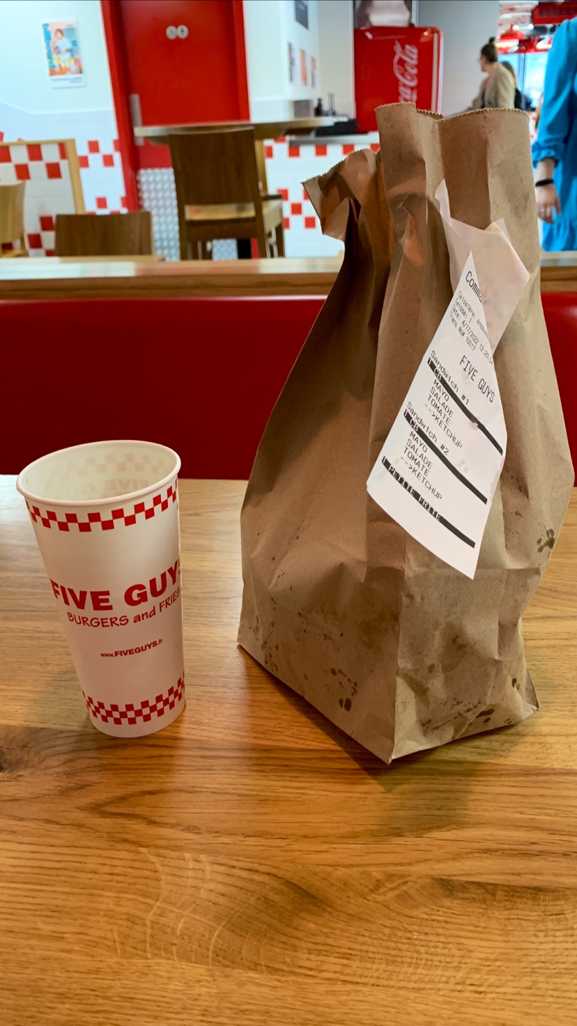 Ça grouille de monde les après-midi. Mon monsieur qui est un habitué a pris un milk-shake que Five Guys à composé avec les ingrédients qu'il a choisi. C'était pas mauvais avec la crème chantilly, mais j'ai trouvé mal dosé car c'était beaucoup trop sucré. Et puis c'était tellement épais qu'on avait du mal à le consommer avec la paille en carton. Pas très pratique... J'ai trouvé aussi un peu cher pour ce que c'était. Tout est cher...les burgers à plus de 10€👀. C'est pas très pratique aussi les serveurs qui hurlent les numéros de commande, dans le brouhaha des clients qui dépasse largement leur voix. On entend à peine. Pourquoi ne pas opter pour un panneau d'affichage des numéros de commande ? Ainsi, dès que notre numéro s'affiche, on se dirige vers le serveur 🤷🏽♀️ Par contre, c'est vraiment moyen les personnes qui balayent sur nos pieds et qui donnent des coups balaies alors qu'on est-ce à table😐. Laissez-nous au moins quitter pour faire cela.