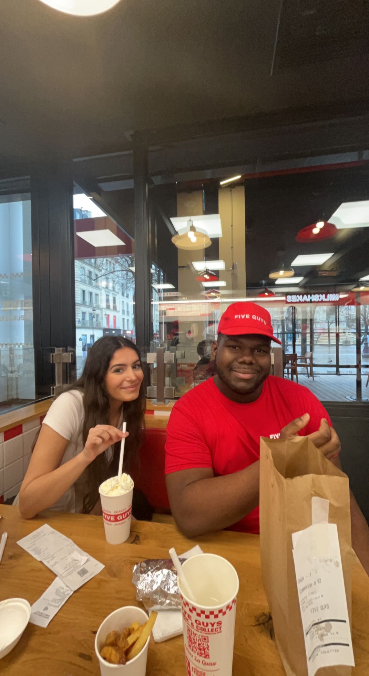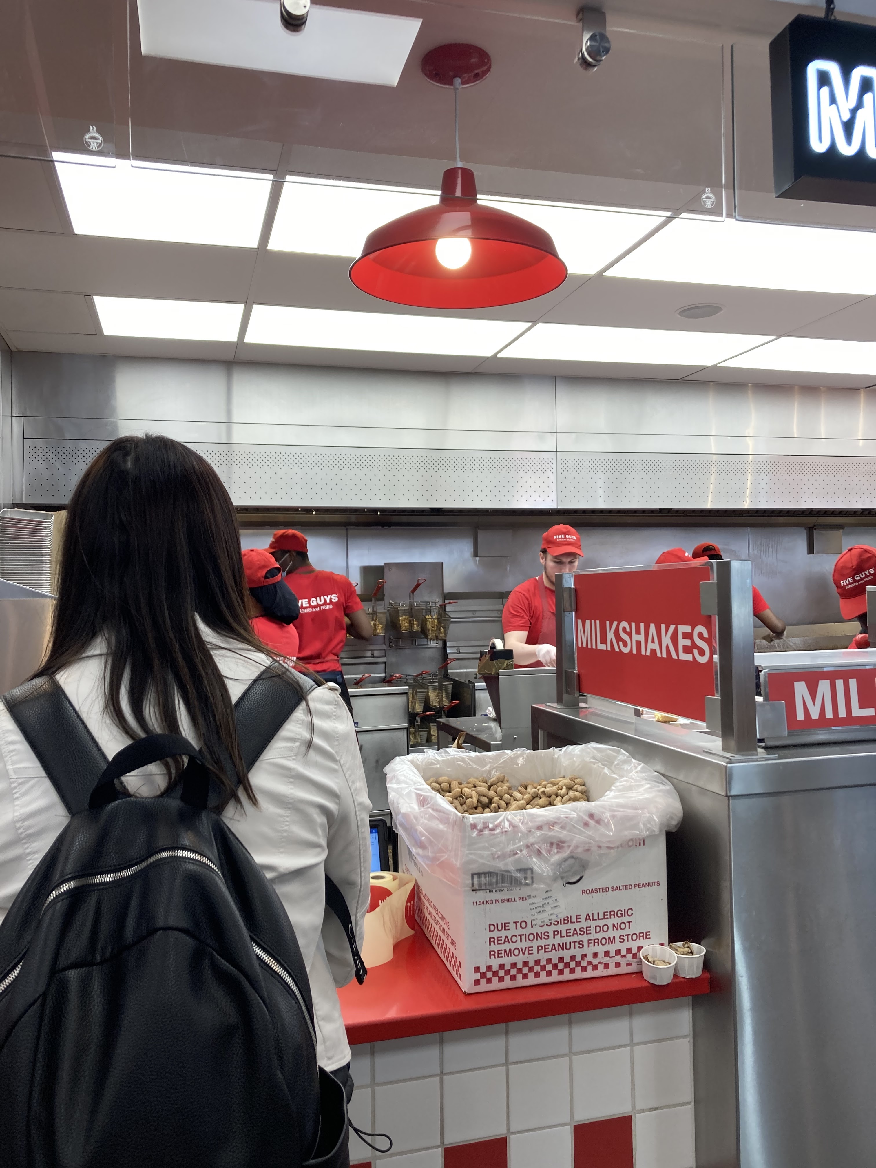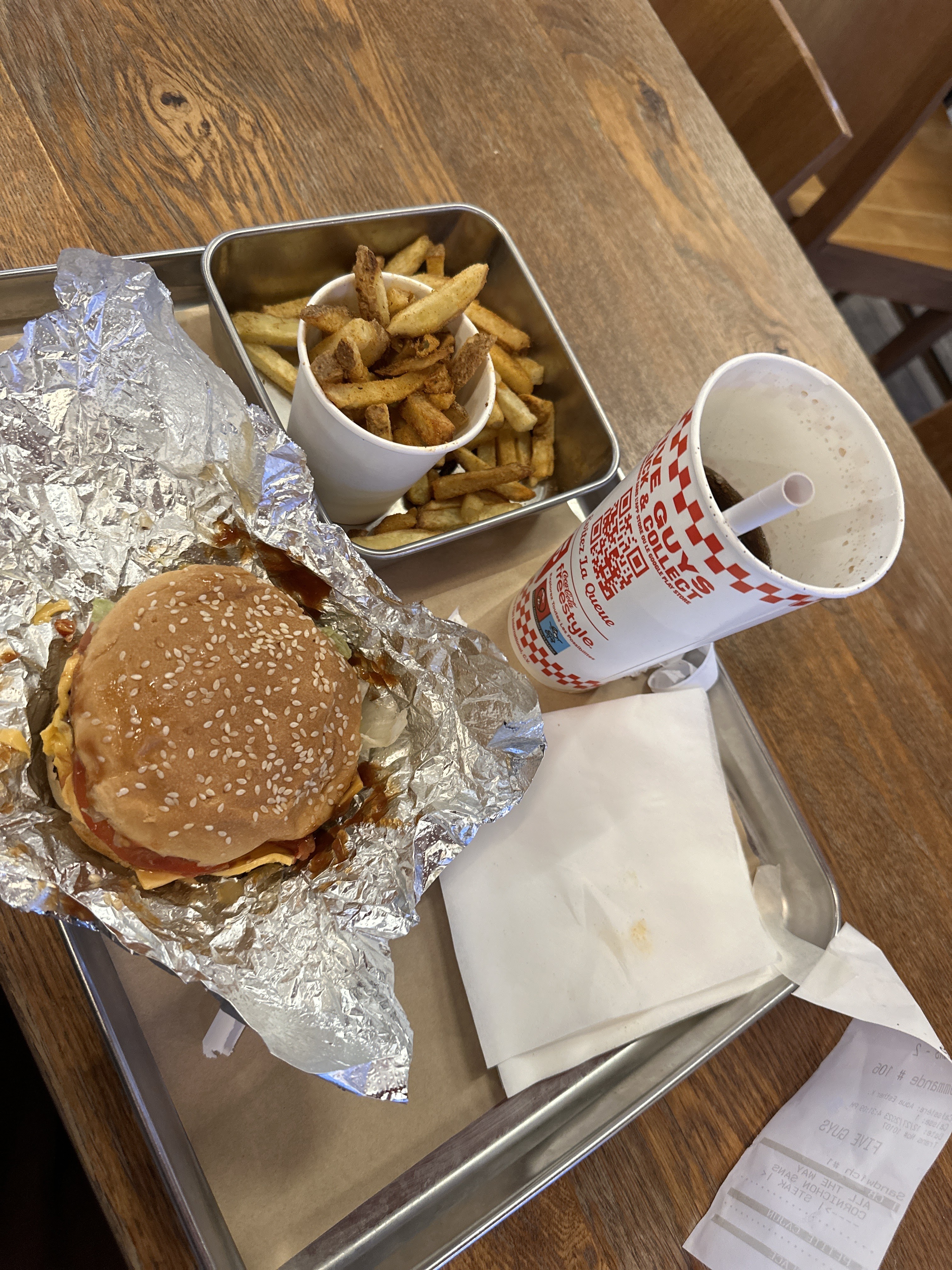 Ça grouille de monde les après-midi. Mon monsieur qui est un habitué a pris un milk-shake que Five Guys à composé avec les ingrédients qu'il a choisi. C'était pas mauvais avec la crème chantilly, mais j'ai trouvé mal dosé car c'était beaucoup trop sucré. Et puis c'était tellement épais qu'on avait du mal à le consommer avec la paille en carton. Pas très pratique... J'ai trouvé aussi un peu cher pour ce que c'était. Tout est cher...les burgers à plus de 10€👀. C'est pas très pratique aussi les serveurs qui hurlent les numéros de commande, dans le brouhaha des clients qui dépasse largement leur voix. On entend à peine. Pourquoi ne pas opter pour un panneau d'affichage des numéros de commande ? Ainsi, dès que notre numéro s'affiche, on se dirige vers le serveur 🤷🏽♀️ Par contre, c'est vraiment moyen les personnes qui balayent sur nos pieds et qui donnent des coups balaies alors qu'on est-ce à table😐. Laissez-nous au moins quitter pour faire cela.