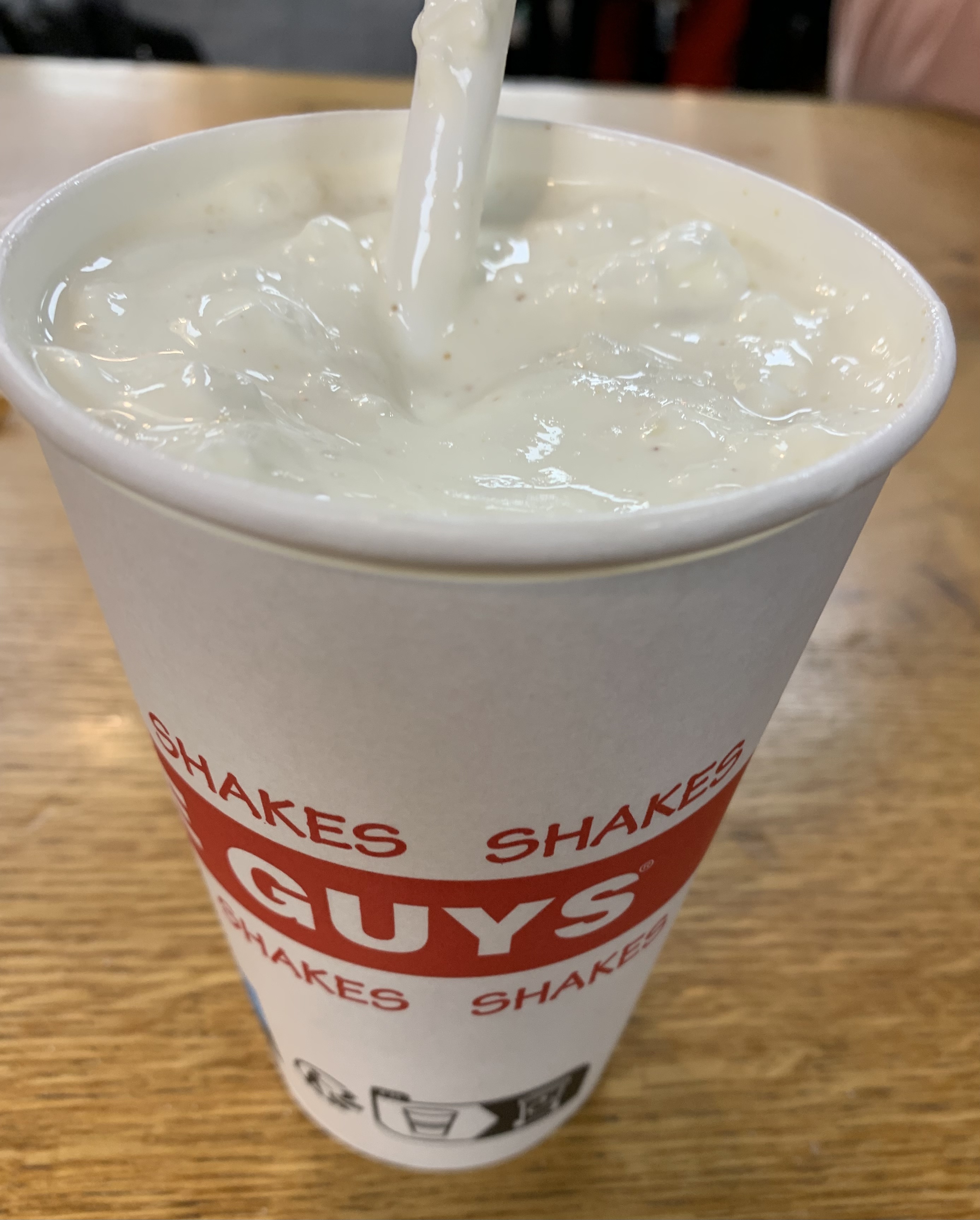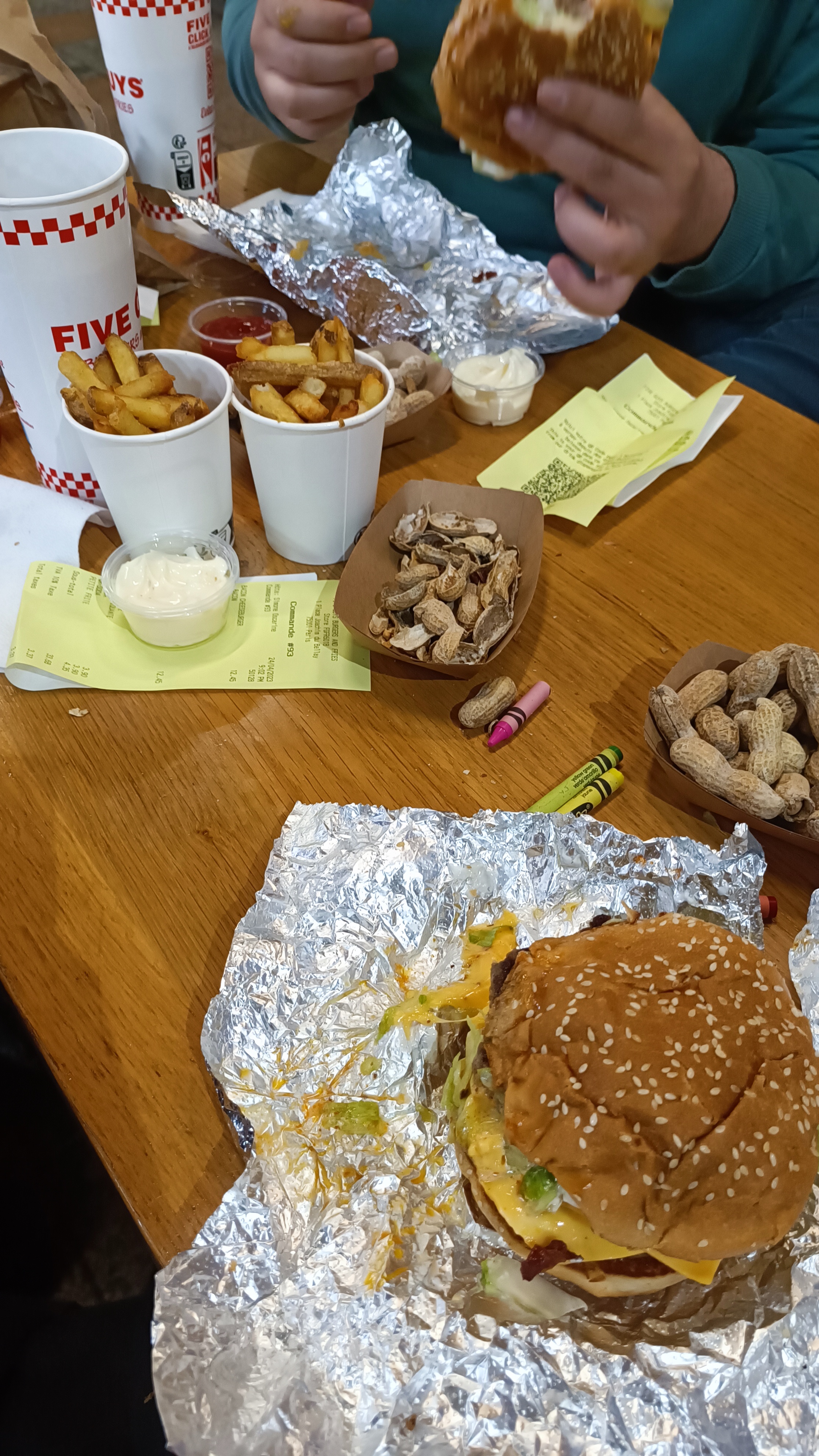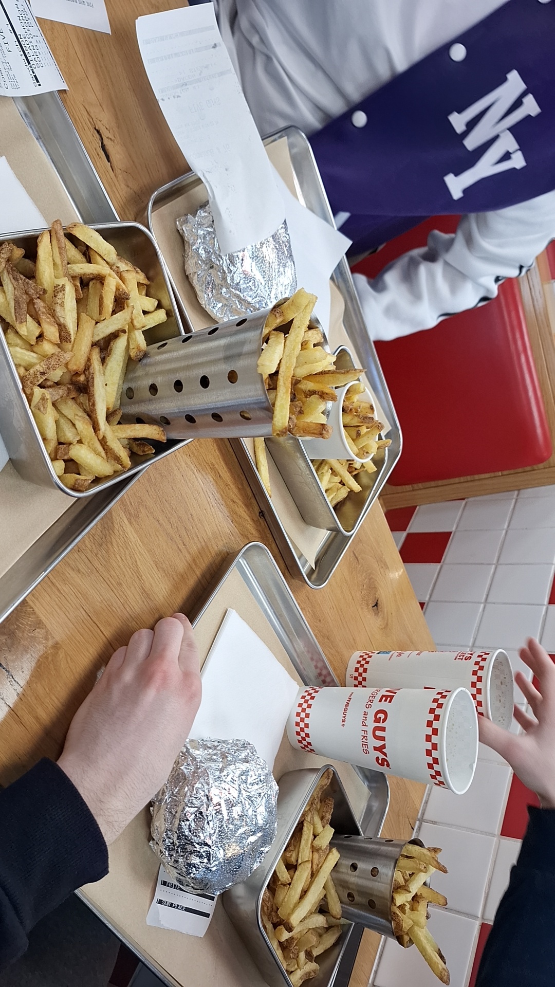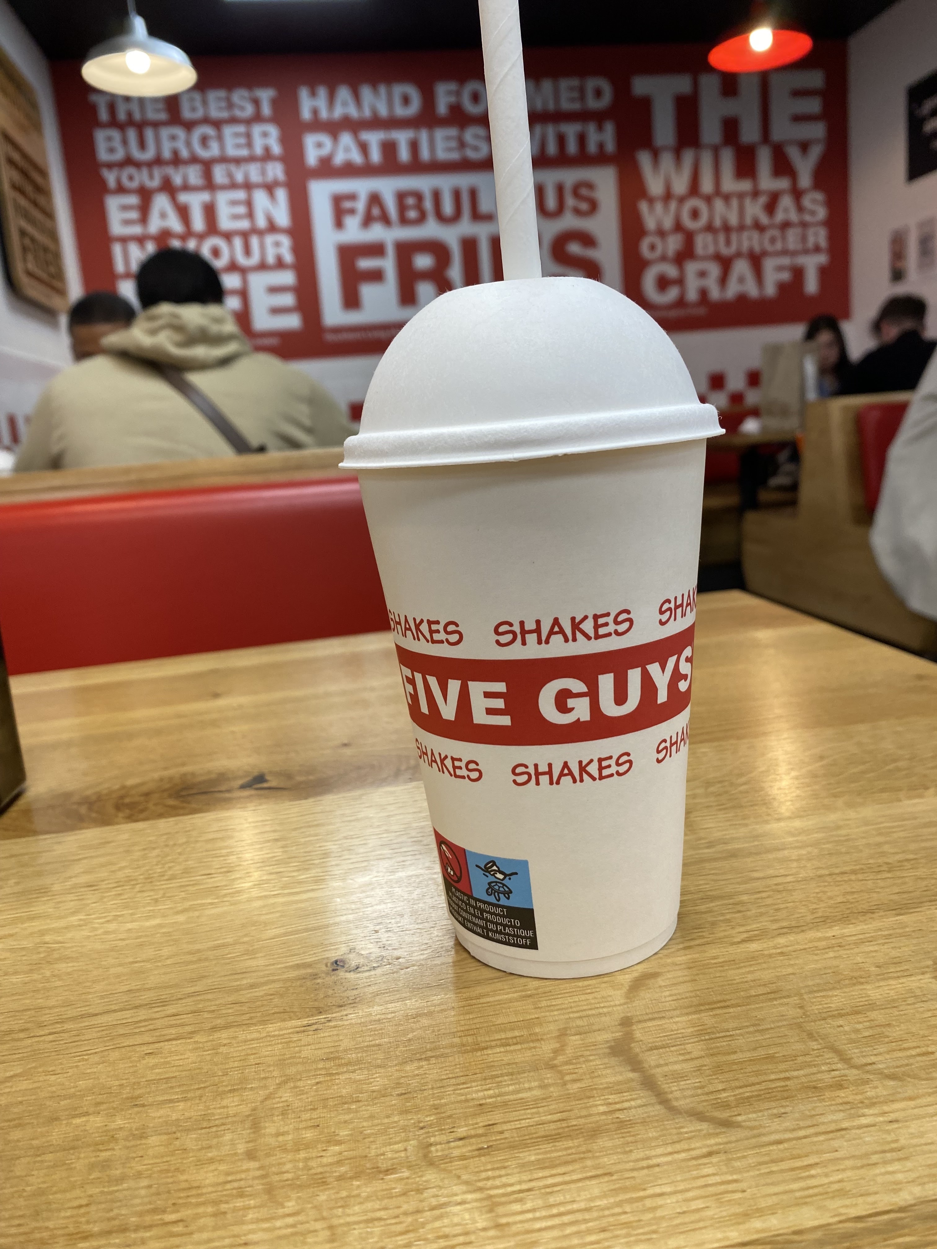 Ça grouille de monde les après-midi. Mon monsieur qui est un habitué a pris un milk-shake que Five Guys à composé avec les ingrédients qu'il a choisi. C'était pas mauvais avec la crème chantilly, mais j'ai trouvé mal dosé car c'était beaucoup trop sucré. Et puis c'était tellement épais qu'on avait du mal à le consommer avec la paille en carton. Pas très pratique... J'ai trouvé aussi un peu cher pour ce que c'était. Tout est cher...les burgers à plus de 10€👀. C'est pas très pratique aussi les serveurs qui hurlent les numéros de commande, dans le brouhaha des clients qui dépasse largement leur voix. On entend à peine. Pourquoi ne pas opter pour un panneau d'affichage des numéros de commande ? Ainsi, dès que notre numéro s'affiche, on se dirige vers le serveur 🤷🏽♀️ Par contre, c'est vraiment moyen les personnes qui balayent sur nos pieds et qui donnent des coups balaies alors qu'on est-ce à table😐. Laissez-nous au moins quitter pour faire cela.