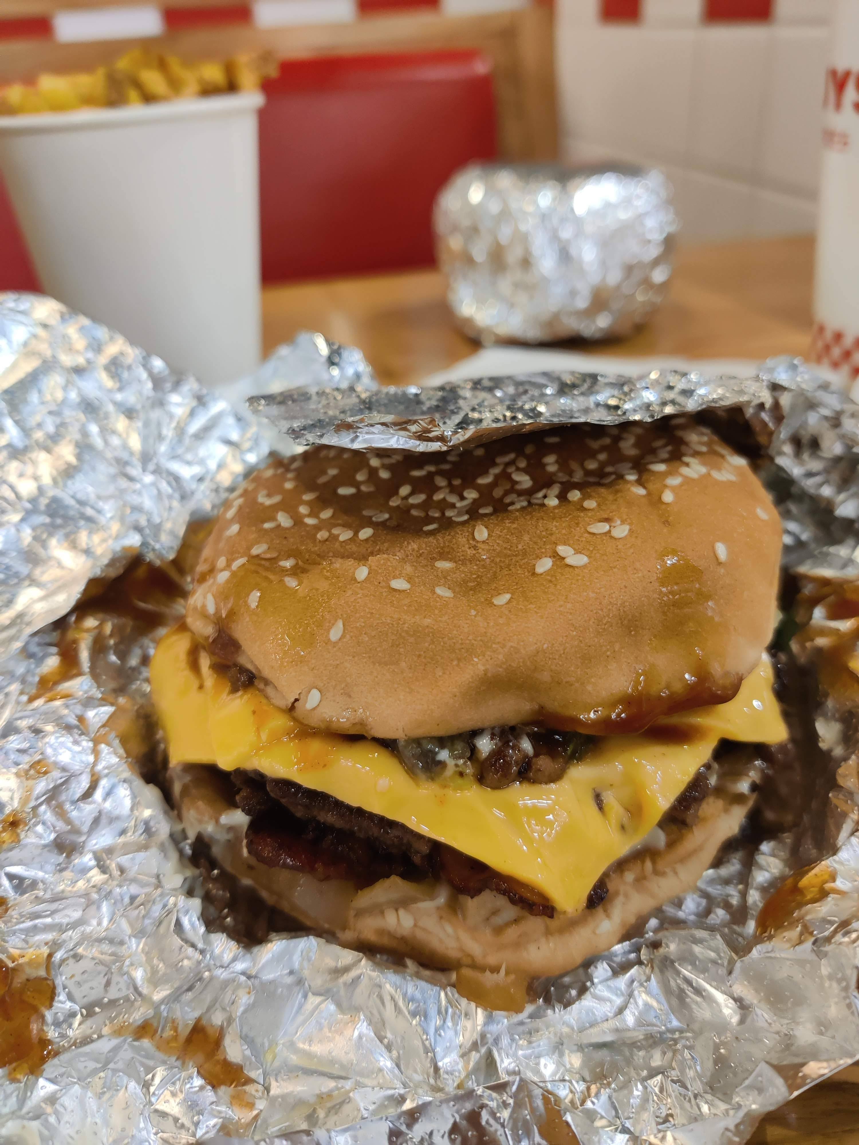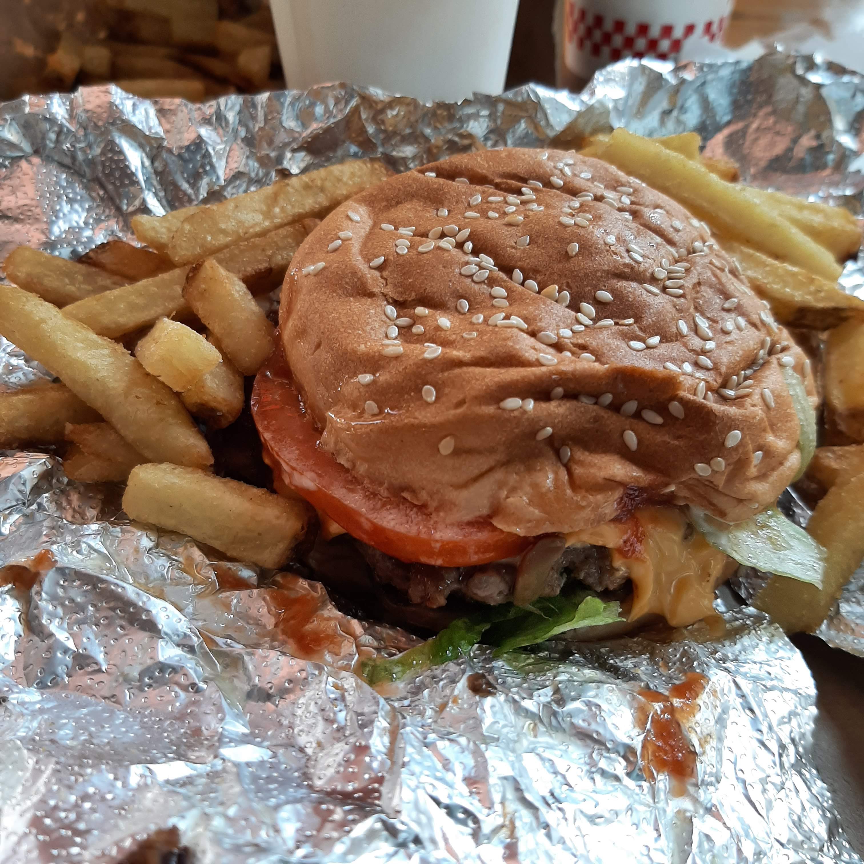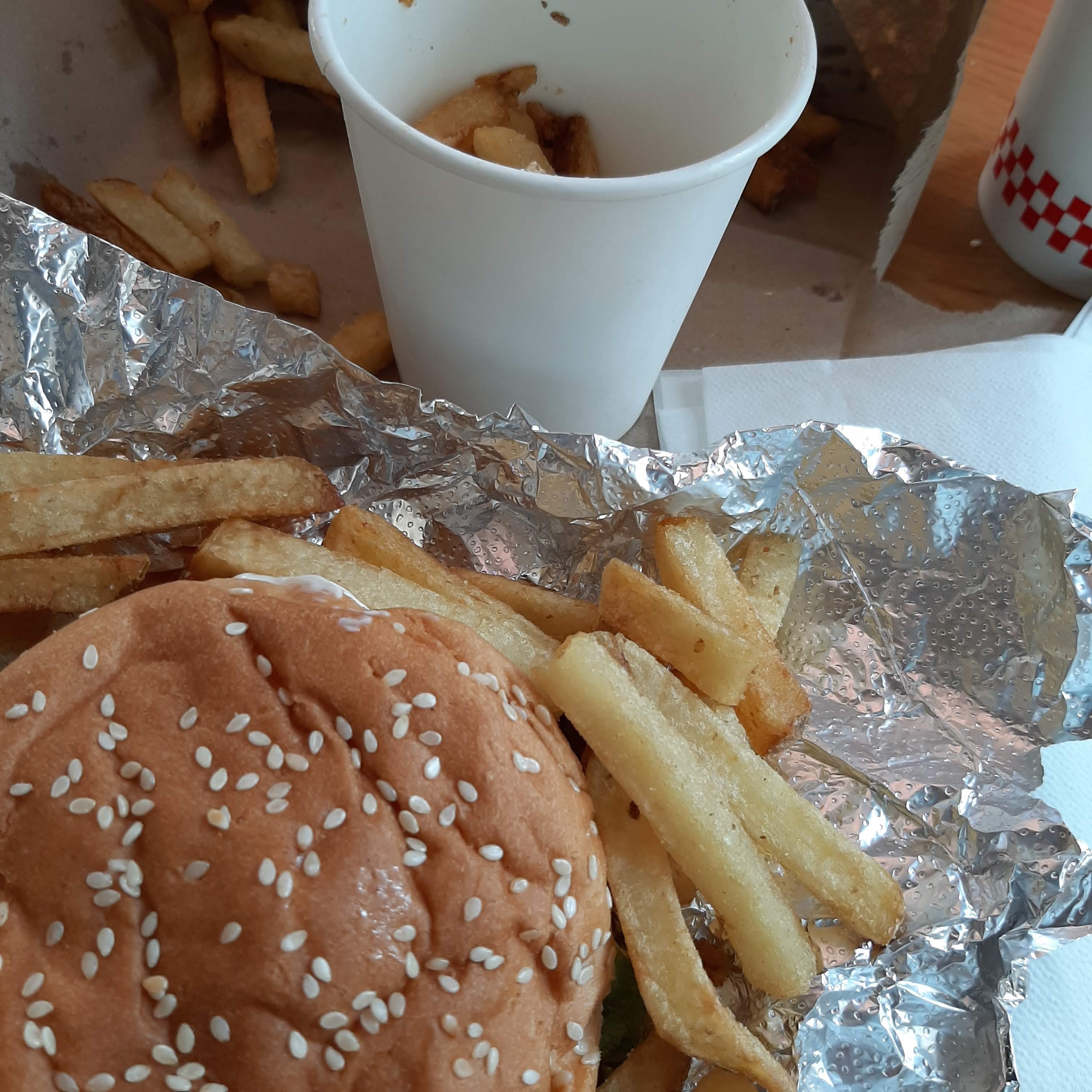 Non, Give Guys n'est pas le restaurant de hamburgers le moins cher du marché. Mais si vous voulez vous régaler du meilleur hamburger, vous pouvez toujours compter sur Five Guys. L'endroit était absolument plein de monde et malgré la foule, c'était propre, les toilettes l'étaient aussi et la qualité de la nourriture était excellente. J'irais toujours comme un pari gagnant et fiable. Désolé, ce n'était pas la meilleure photo que j'ai prise, mais je n'ai pas pu attendre... même si elle a toujours l'air délicieuse.