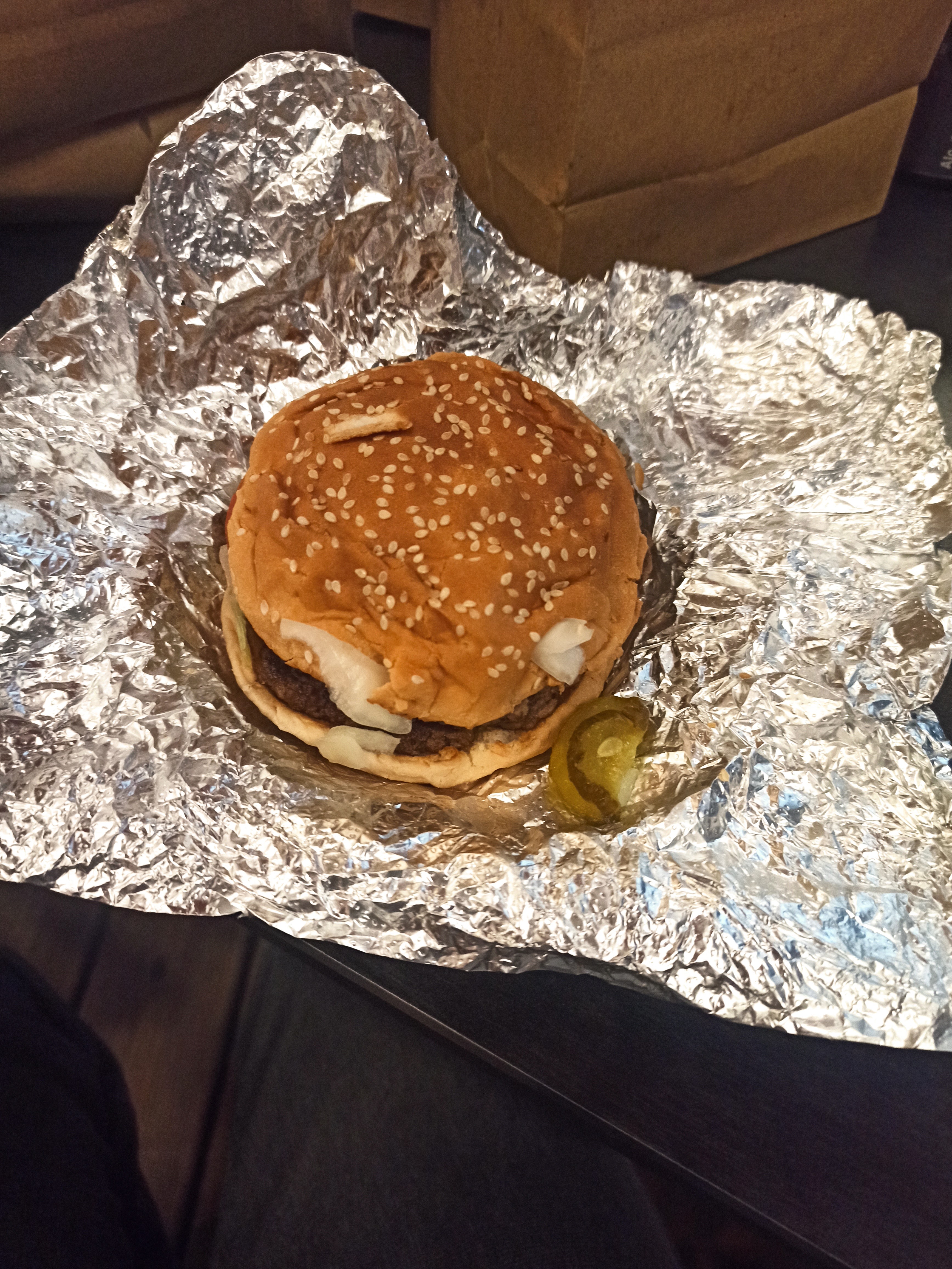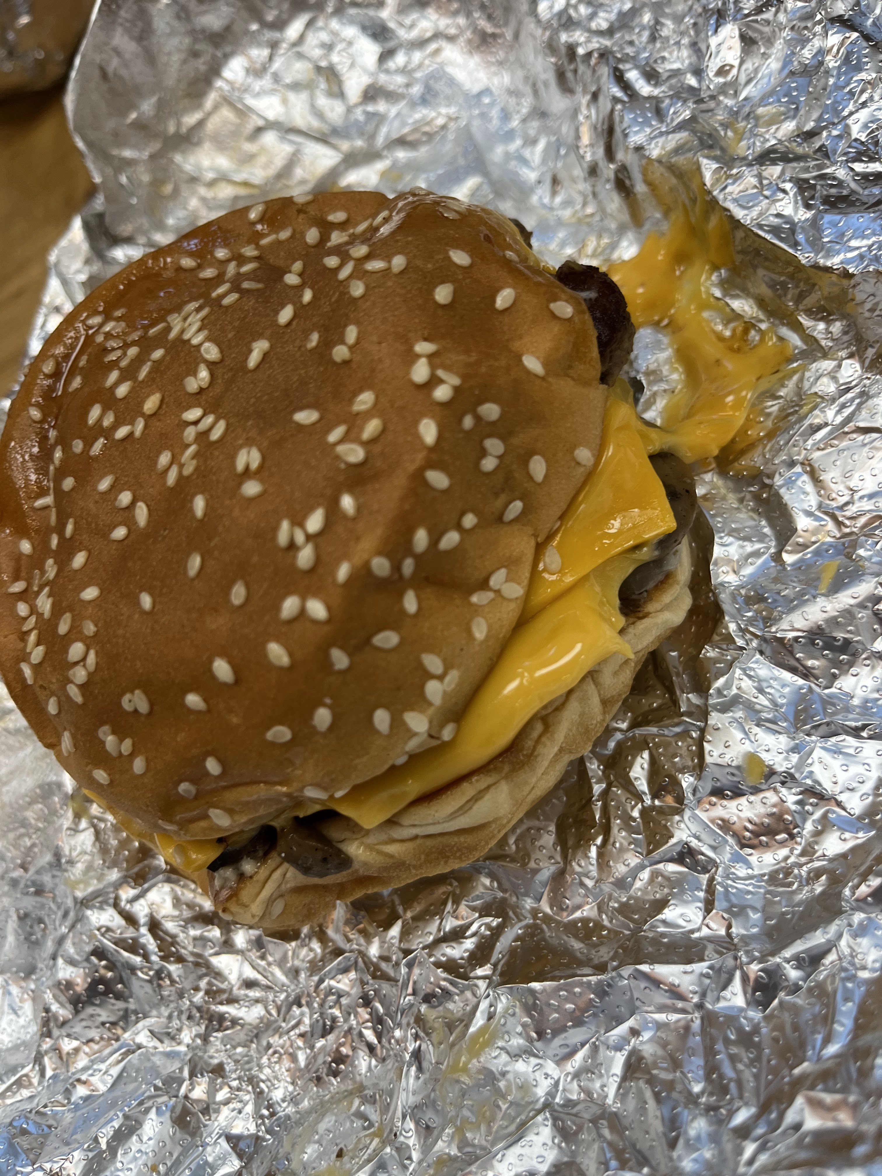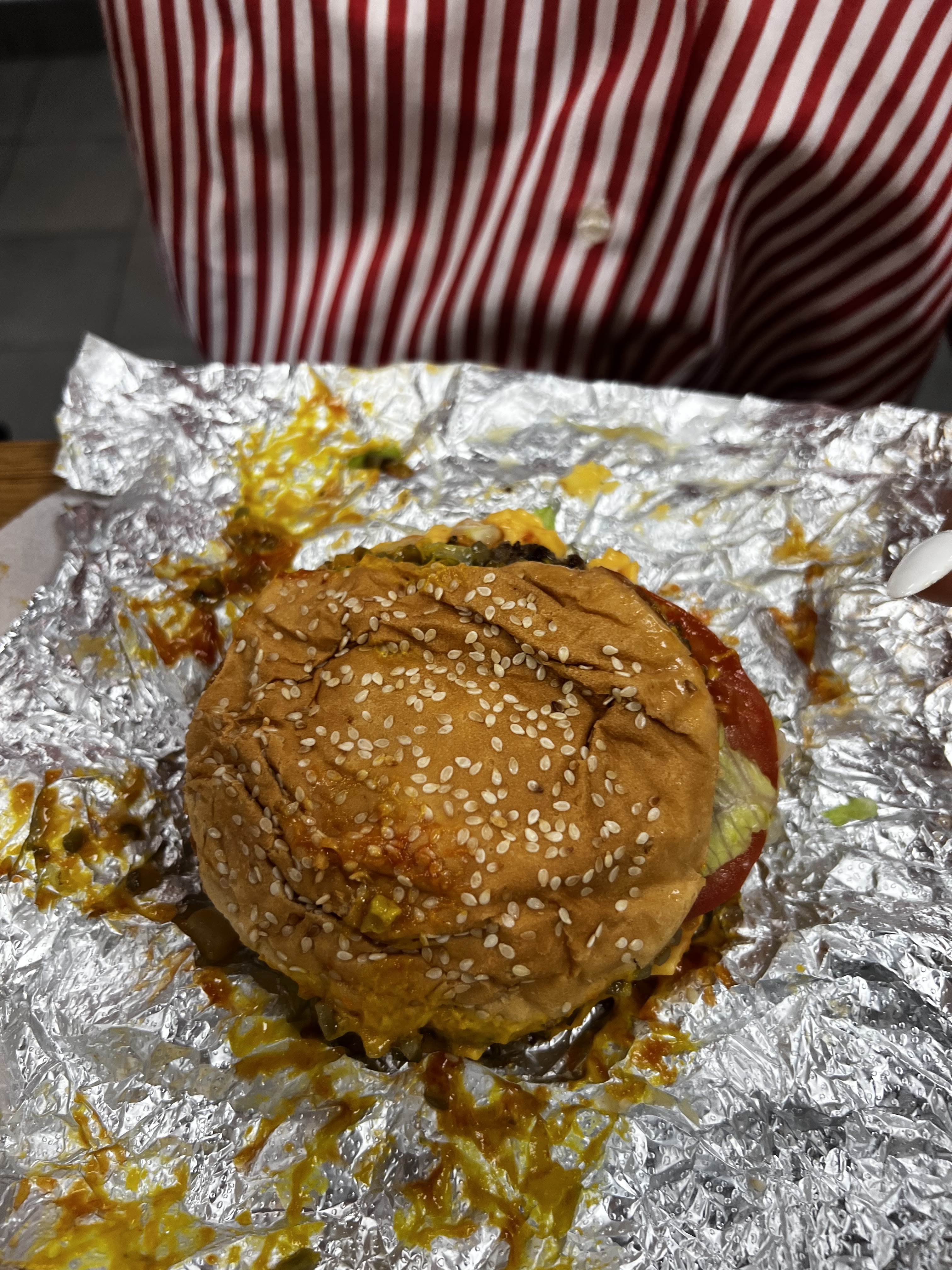 Non, Give Guys n'est pas le restaurant de hamburgers le moins cher du marché. Mais si vous voulez vous régaler du meilleur hamburger, vous pouvez toujours compter sur Five Guys. L'endroit était absolument plein de monde et malgré la foule, c'était propre, les toilettes l'étaient aussi et la qualité de la nourriture était excellente. J'irais toujours comme un pari gagnant et fiable. Désolé, ce n'était pas la meilleure photo que j'ai prise, mais je n'ai pas pu attendre... même si elle a toujours l'air délicieuse.