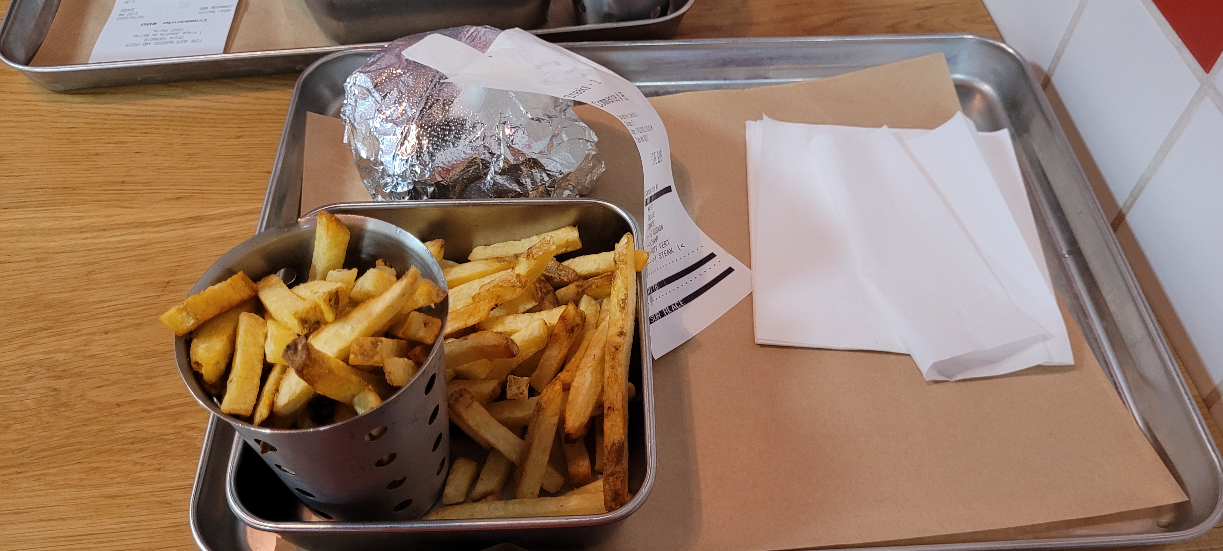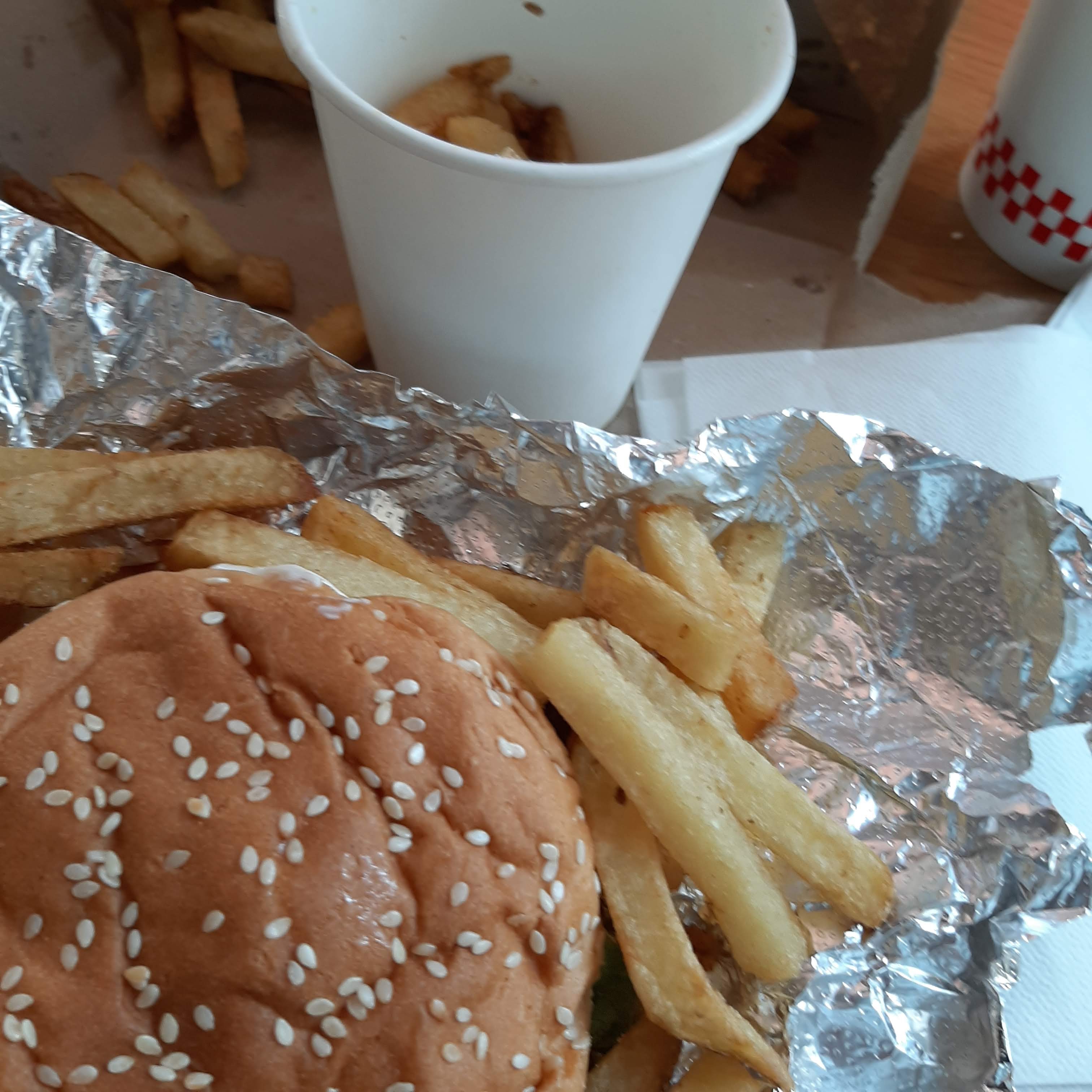 Deuxième fois dans un Five Guys (premier à New-York), et j'ai était un peu déçu des frites qui étaient bien meilleur dans mes souvenirs L'établissement à ce moment ne prenez que le paiement en espèces Sinon rien à dire, j'attends que ça arrive sur Bordeaux maintenant