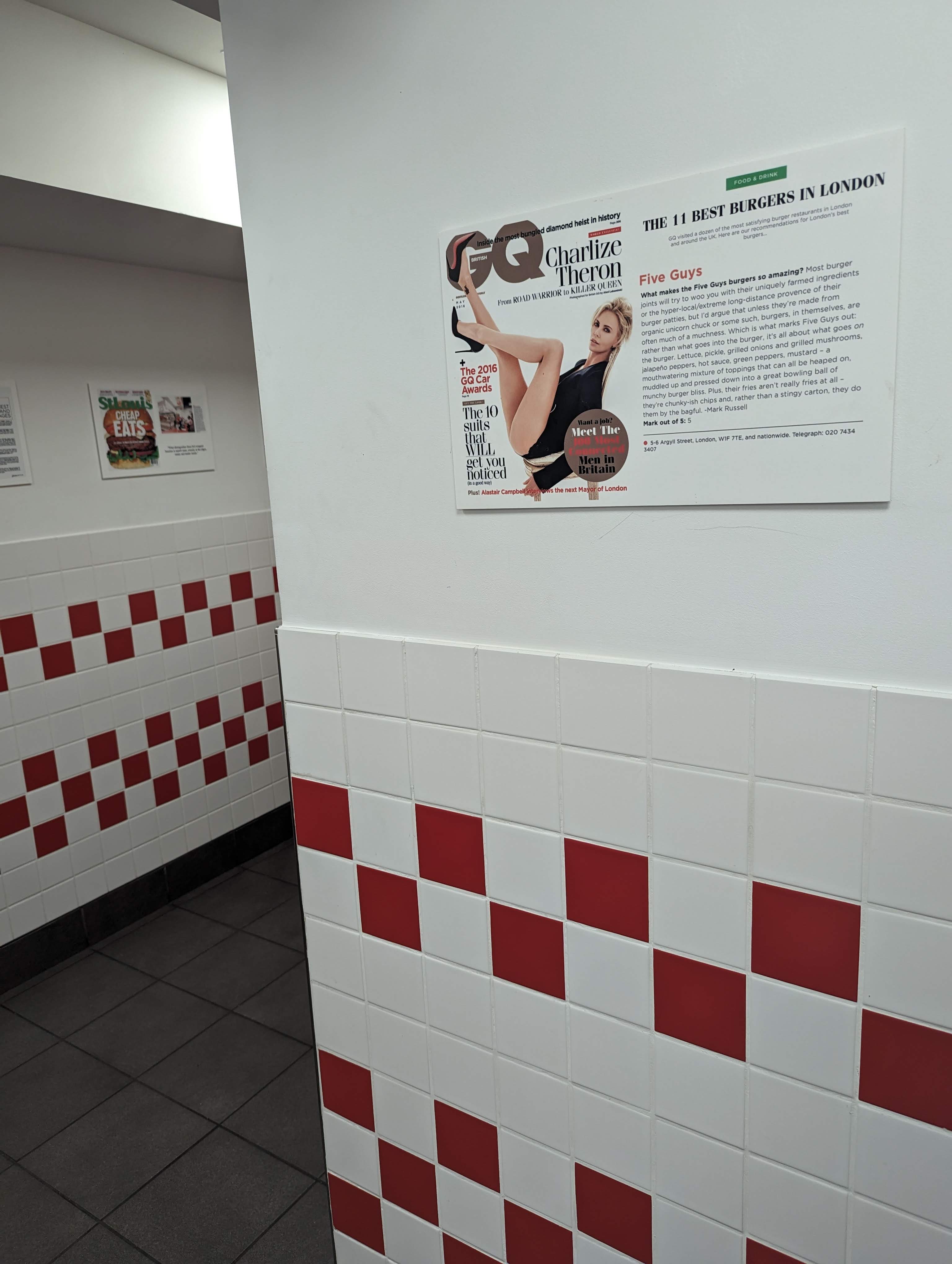 Mon ami Bready sur YouTube, ne voulais plus bouger du five Guys, pris par une diarrhée sans fin, il voulais juste rester dans ces magnifique toilette. D’après lui les toilettes sont de qualité supérieur, pour y être rester quelque temps, c’est juste des supers toilette. D’où les 5 étoiles. Sinon la bouffe étais bonne et le service aussi. La chose la plus importante à retenir c’est la qualité incroyable des toilettes.