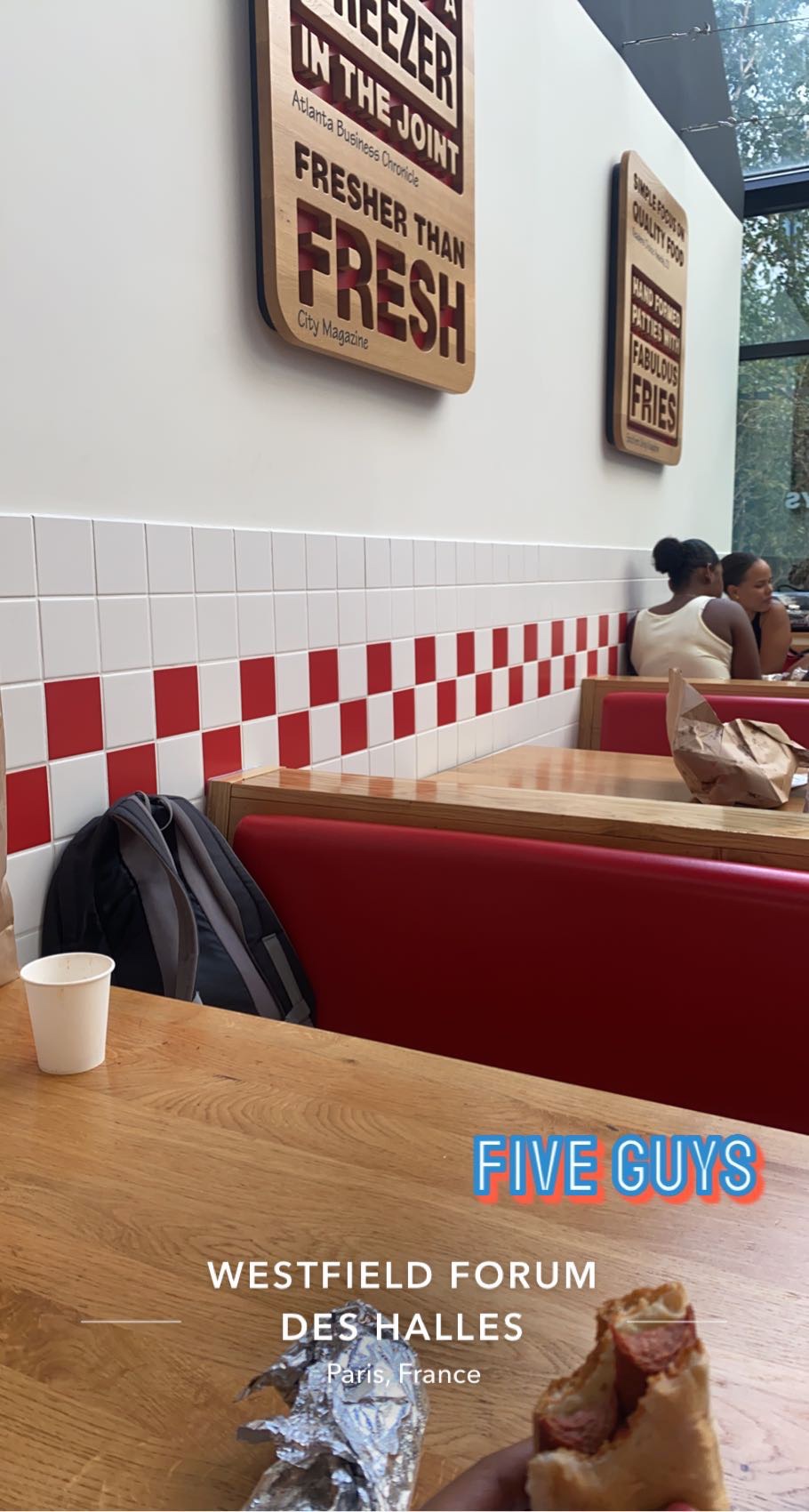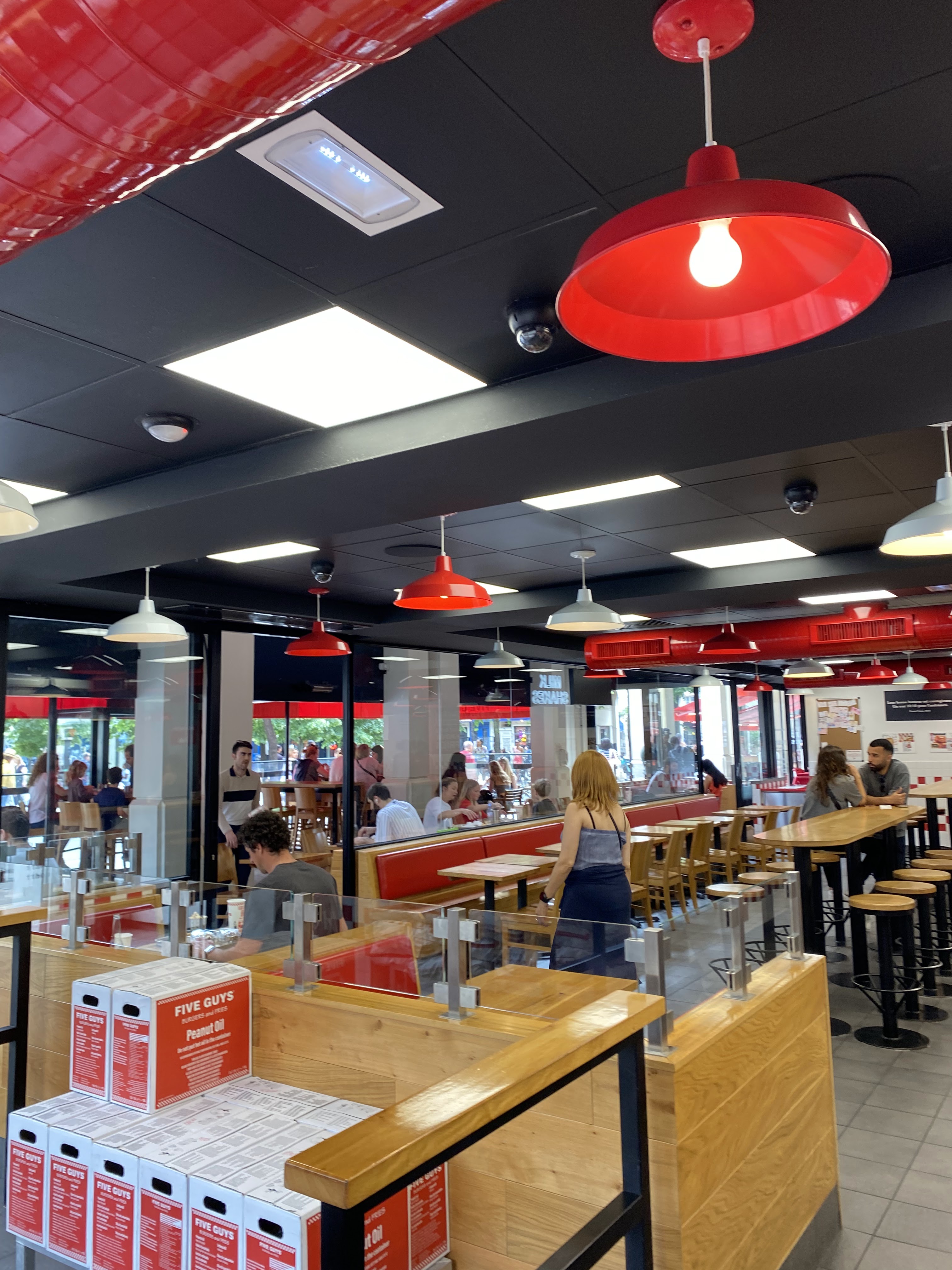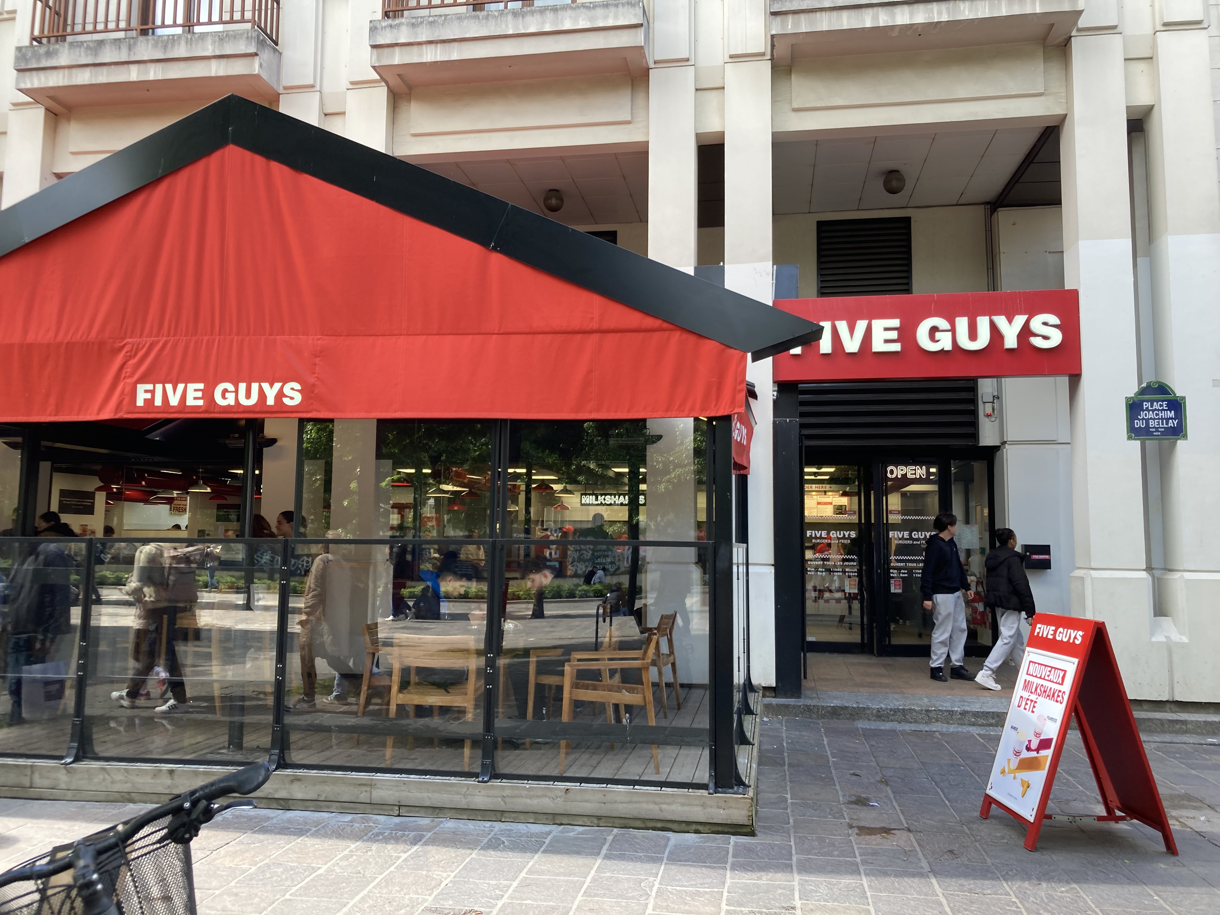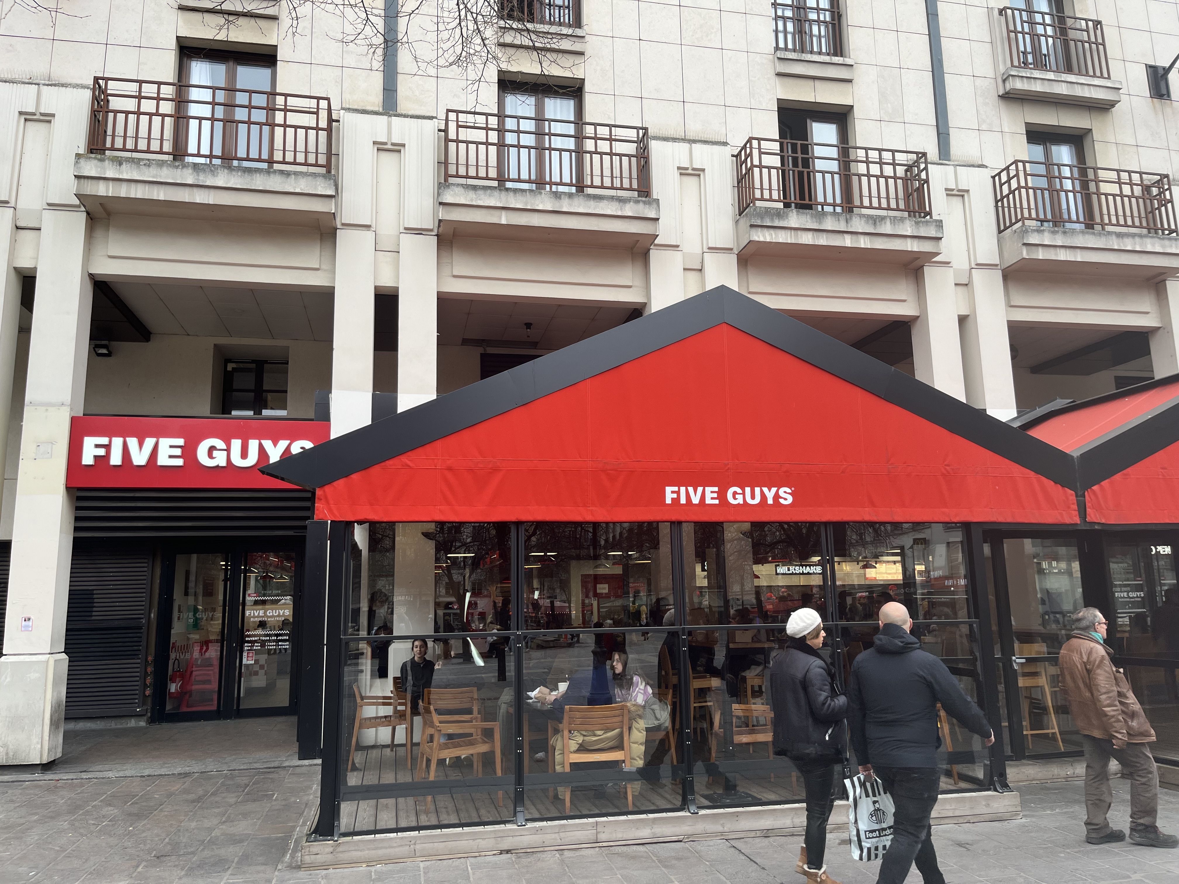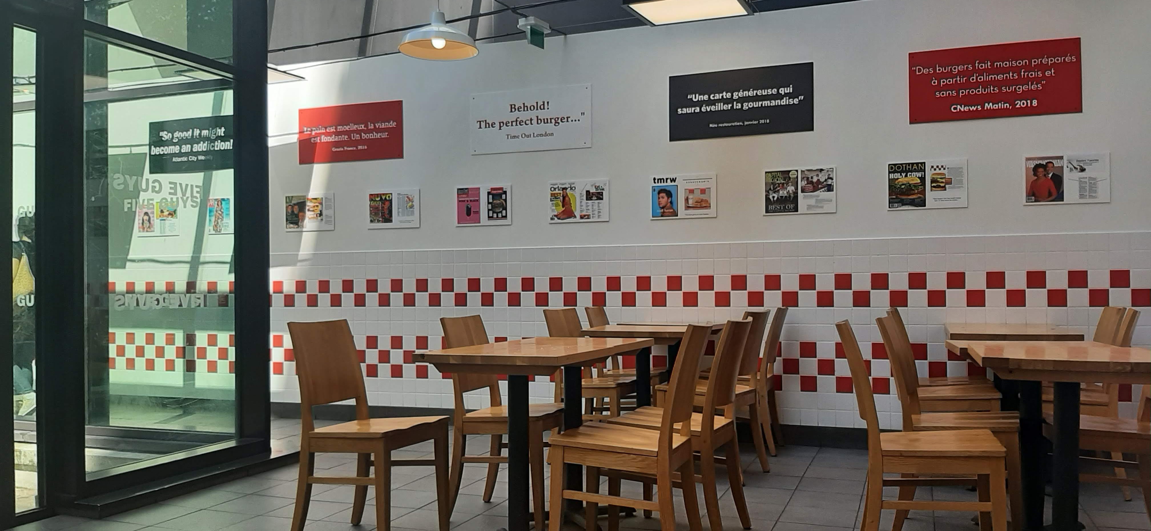 Même en France, le style, le mobilier et le menu sont exactement les mêmes que dans les autres pays. Heureusement, Five Guys a traduit le menu et la couleur est restée la même. Naturellement, après le COVID, il n’y a plus de cacahuètes disponibles. Le fast-food dispose de nombreux sièges disponibles et il y a une véranda avec des murs en verre et vous pouvez voir la place extérieure. La nourriture était délicieuse mais malheureusement la livraison était lente. Le pire, ce sont les boissons : vous ne bénéficiez pas de recharges gratuites comme dans d'autres pays.