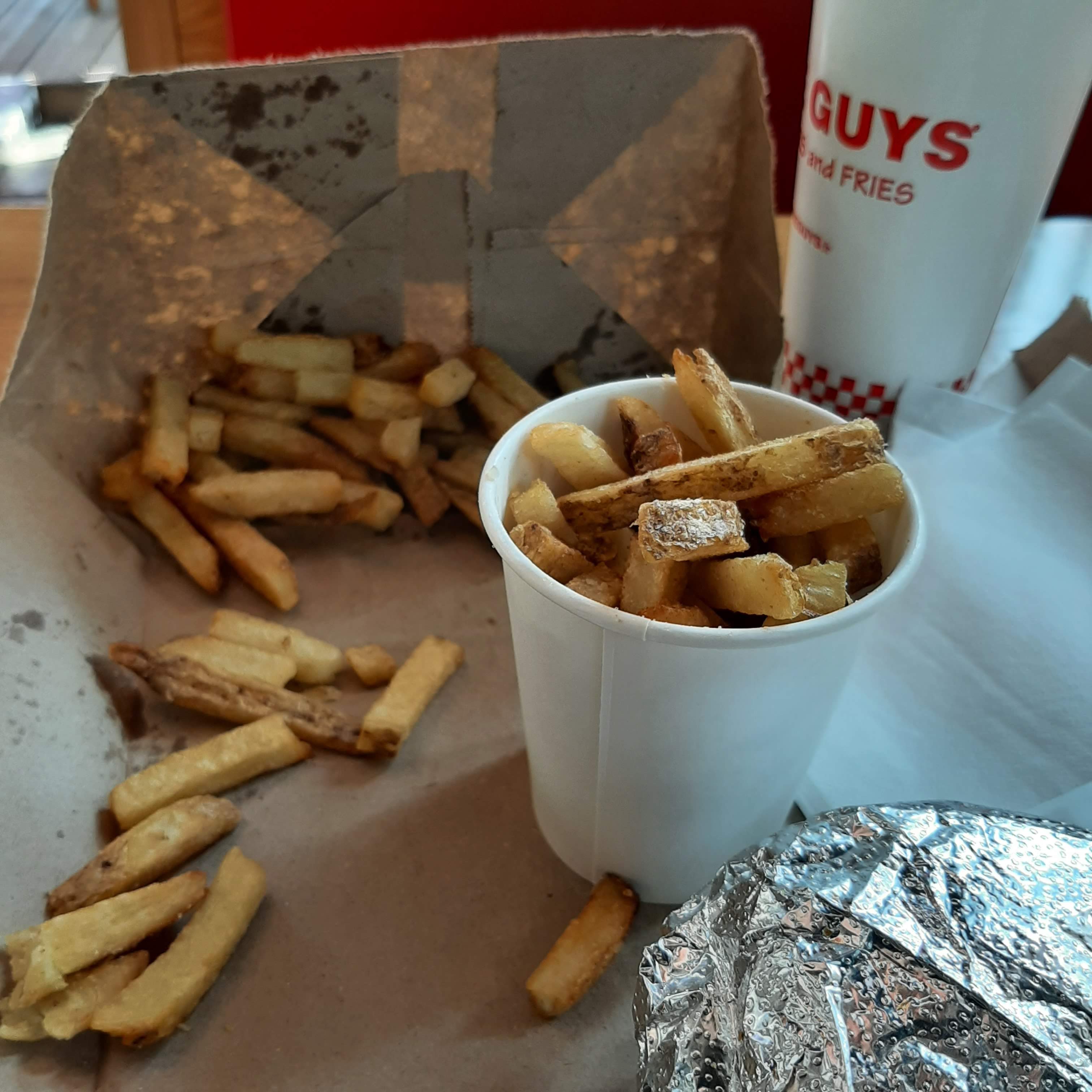L'EXPÉRIENCE FIVE GUYS EST INCROYABLE LES FRITES SONT DÉLICIEUSE ET DELIVRÉ EN GRANDE QUANTITÉ LE FAIT QU'ON PUISSENT CHOISIR PARMIS LES 15 INGRÉDIENTS C'EST VRAIMENT INCROYABLE
