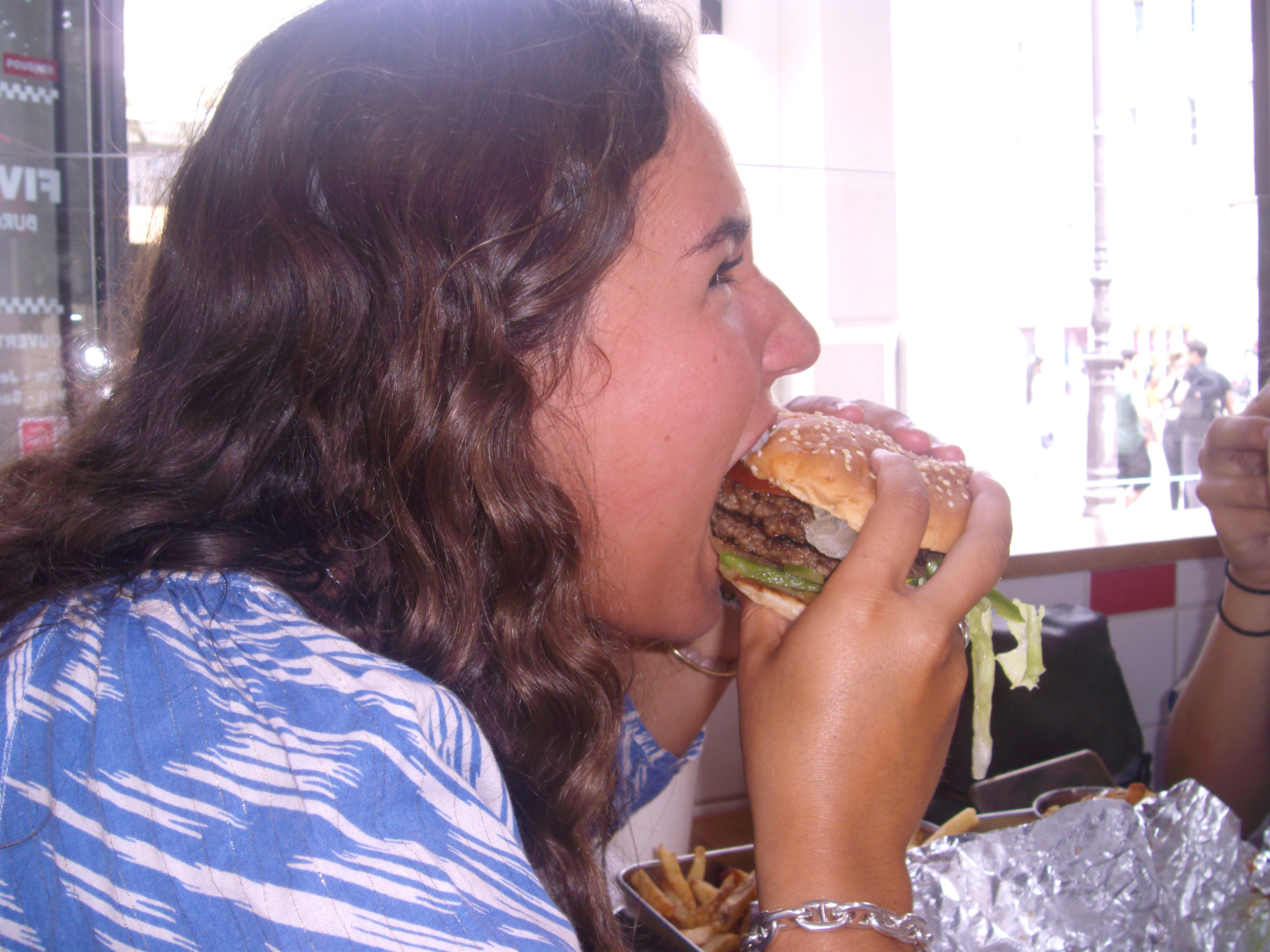 Venez chez Five Guys si vous voulez manger un burger frais et chaud et manger beaucoup de frites (1 grande frite sur la photo pour trois personnes) et goûter des sodas classiques avec des parfums originaux