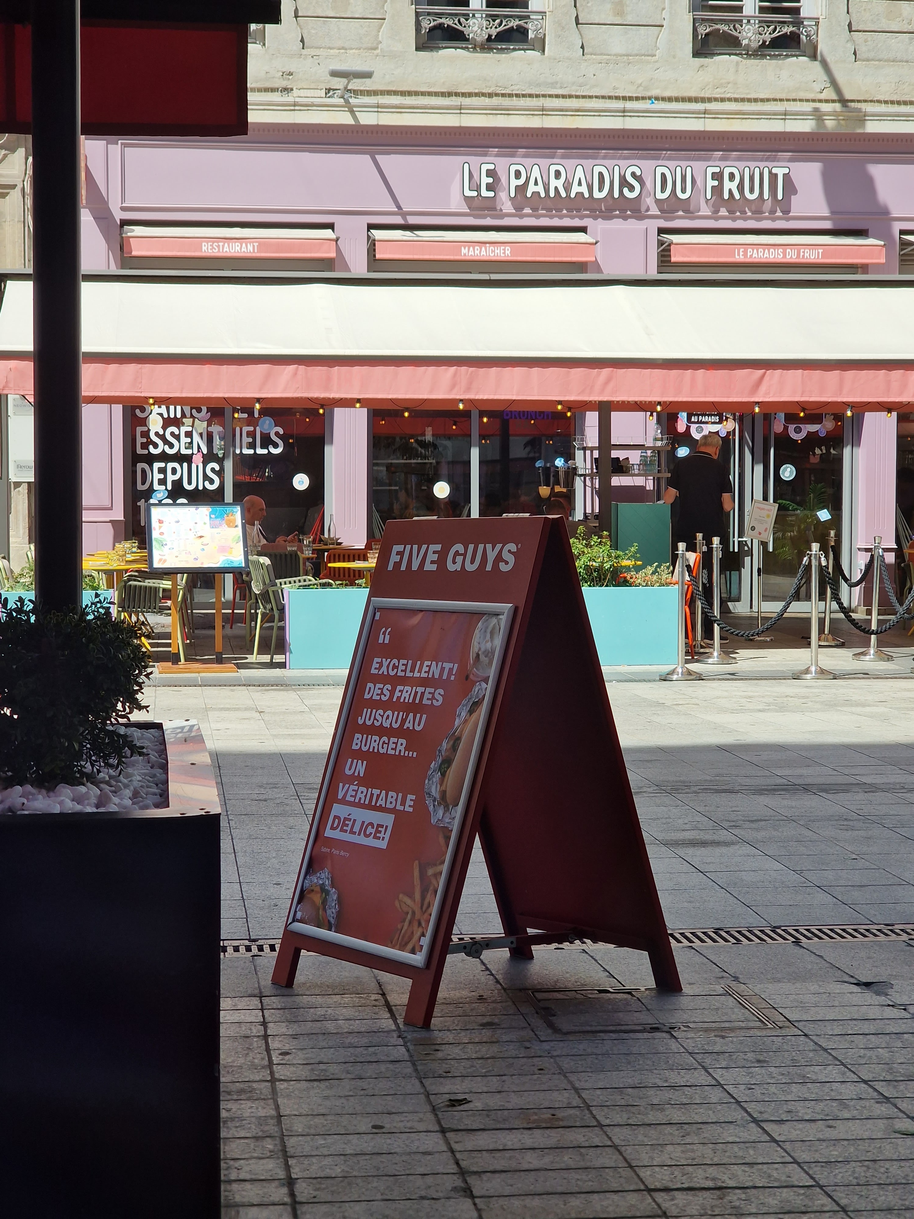 Le Five Guys débarque enfin sur Lyon ! J’avais hâte de tester et je ne suis pas déçu : les burgers sont vraiment très bons pour un fast food. Niveau quantité, prenez un little burger car les classiques sont beaucoup trop gros. Les portions de petites frites sont très généreuses aussi (du gâchis même) mais apparemment c’est la politique de la maison… Petit bémol : beaucoup de bruit à l’intérieur, on a l’impression d’être à l’usine. Attendre qu’on crie sa commande est un peu stressant. Mieux vaut manger dehors tranquille !