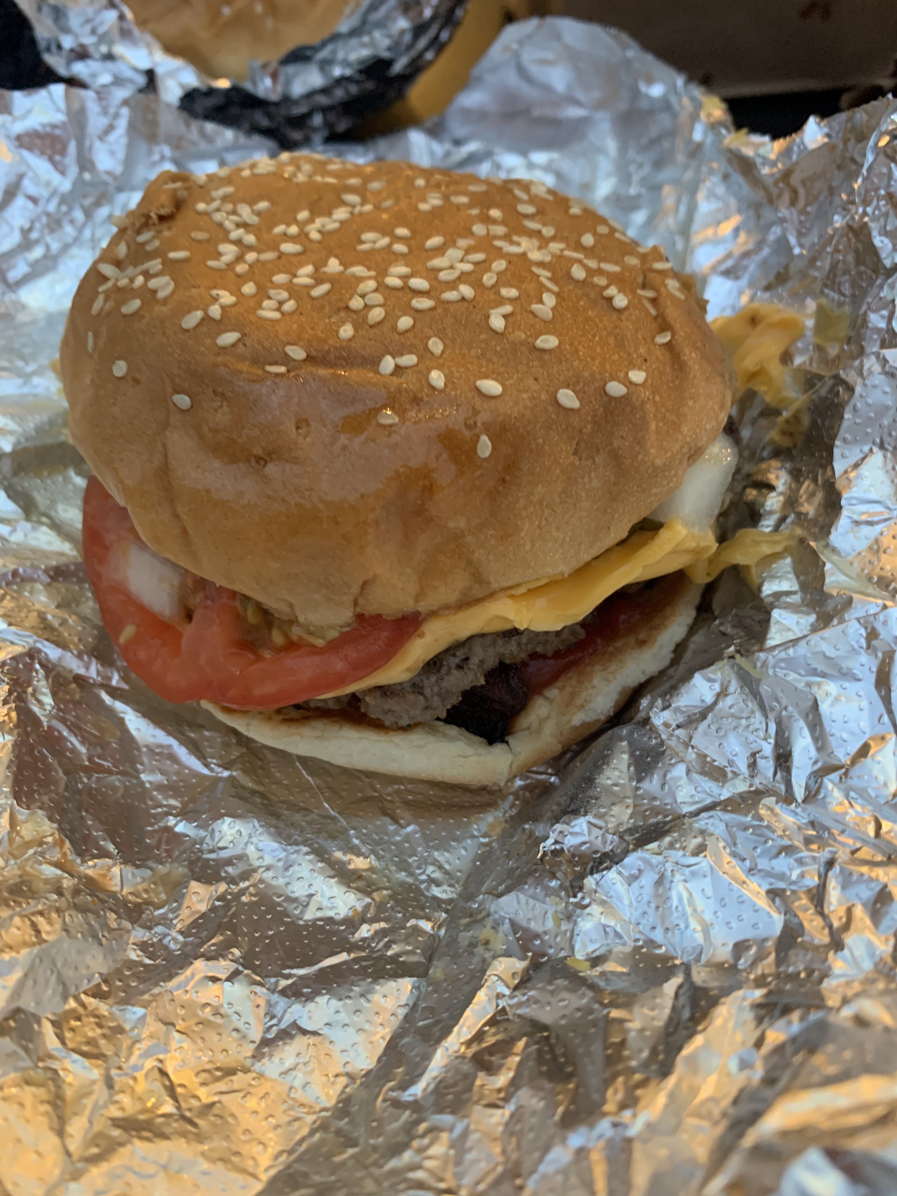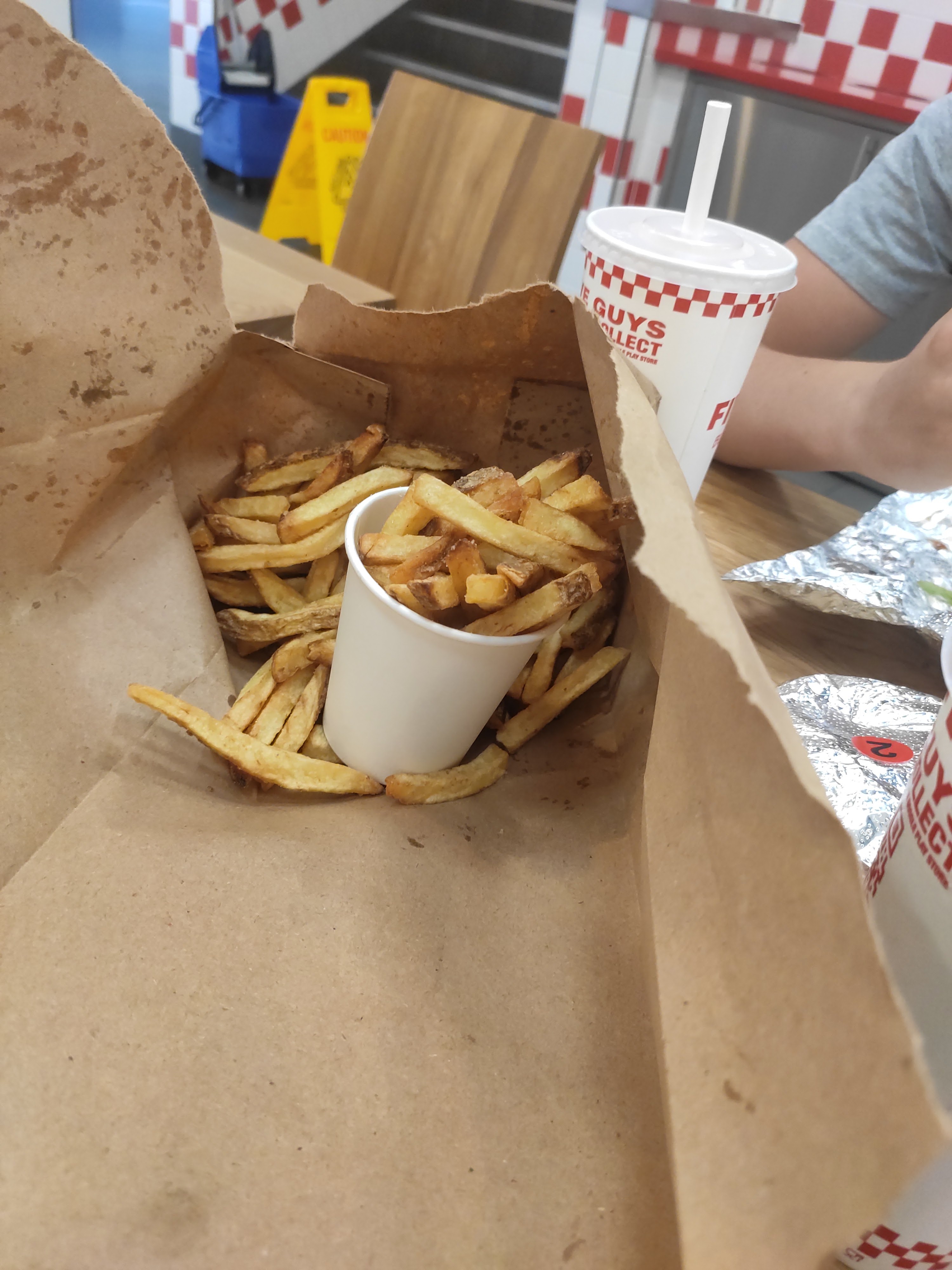 J'entendais parler de five guys comme étant LE fast food de cette catégorie. Et ben c'est juste extrêmement surcoté. C'est ultra cher ( comptez quasi 20€ pour un menu complet ), c est pas ouf en goût. Le pain dans le papier d alu fait très défraîchis au déballage. Franchement au prix, y a largement mieux sur Lyon ( Bibi's burger, King Marcel ou bien le top du top si vous êtes du côté de limonest le midi en semaine chez Will Burger ). J ai voulu essayer, c est fait. J y retournerai? Non