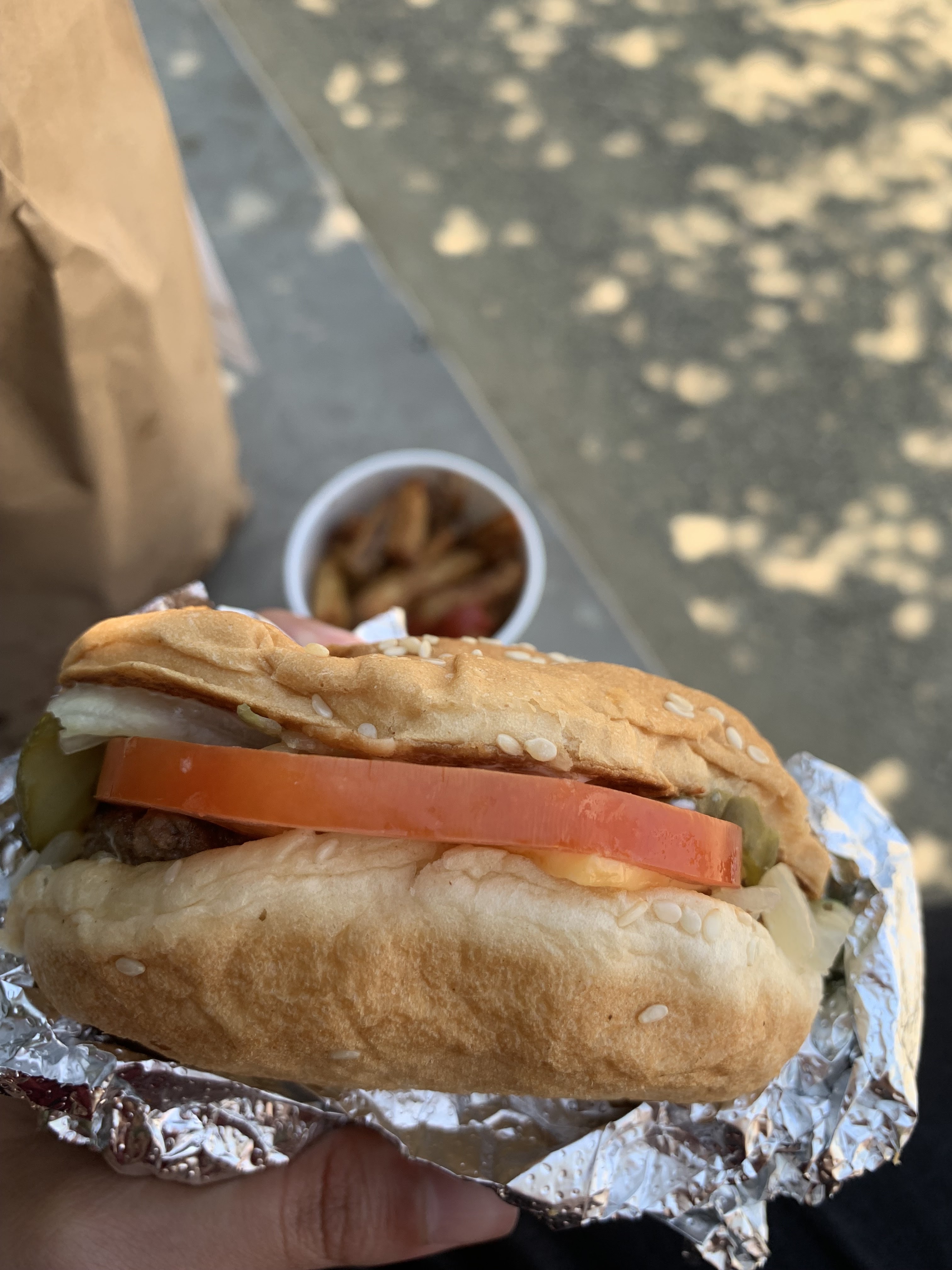 Le pire burger et les pires frites que j’ai mangé chez five guys jusqu’à maintenant. Le burger tout débordant même l’aluminium autour était sale. Les frites étaient toutes molles, on dirait qu’elles avaient été réchauffées au microonde. Aucun effet croustillant. Pour vous dire, même mon chien qui est très gourmant n’a pas mangé les frites. De plus aucune sauce livrée malgré la demande lors de la commande.