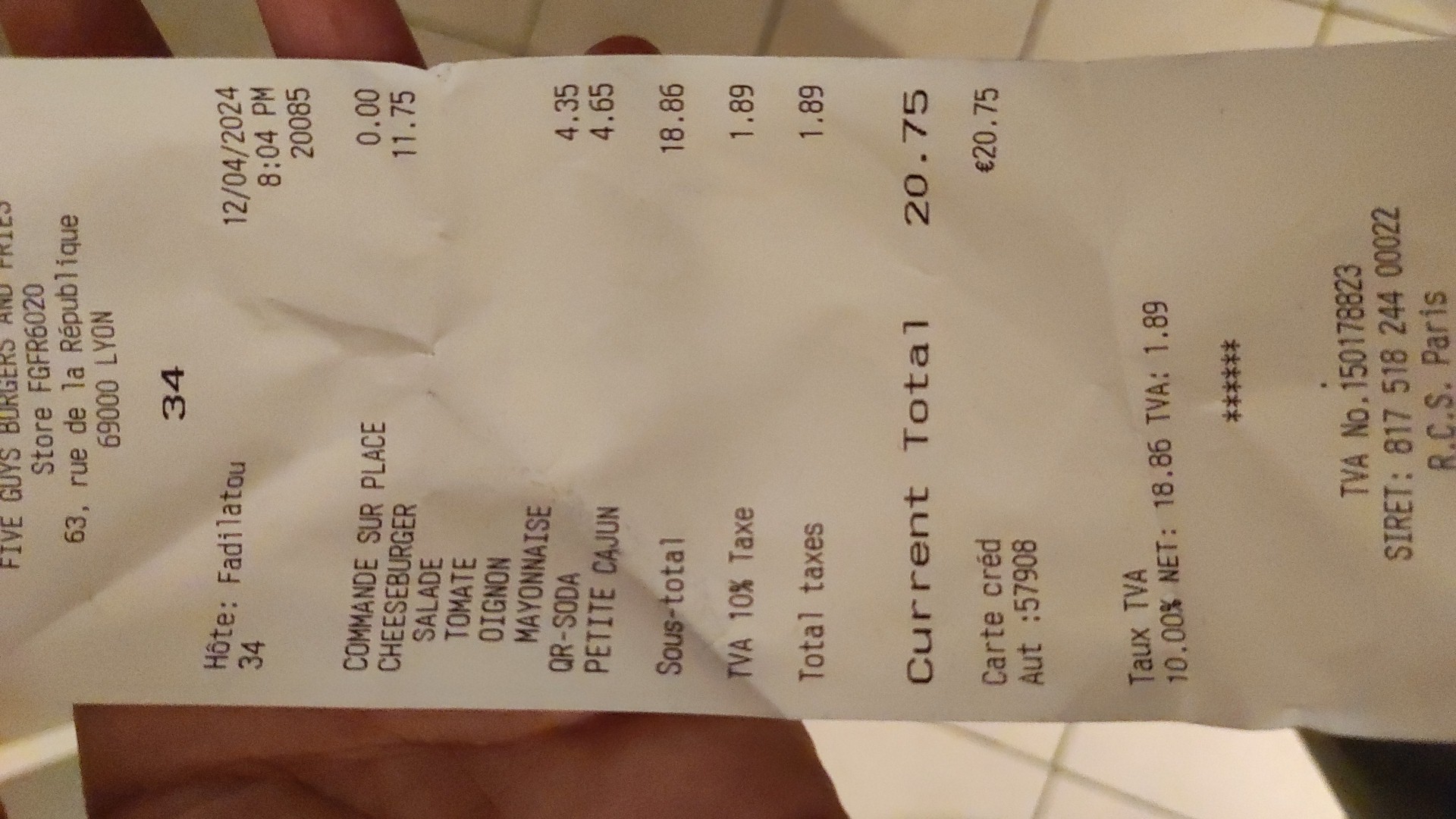 Le personnel etait vraiment sympa, rien à dire. Pour 2 personnes, nous avions 2 burgers, 1 hot-dog, 2 boissons et 1 grande frite. L'addition(47€) est salé mais les portions semblent au norme américaine (la grande frite, le sac remplie + frite dans le gobelet, voir photo). Les burgers ne sont pas ouf, le pain est rendu molle lors du déballage mais cela doit être la signature du fast food. Les coups de cœurs se portent sur le hot dog (bonne surprise) et les frites qui étaient bonnes. Note 3/5, car c'est cher pour ce que c'est. En effet, five guy se veut prenium avec ce tarif n'est alors qu'un big fernand, burger de papa, kaffe Berlin ou un King Marcel font des burgers bien au dessus de leur niveau. Mm les burgers mcdo/bk ont plus de goût. Bref. Je recommande d'essayer 1 fois car c'est nouveau sur Lyon.