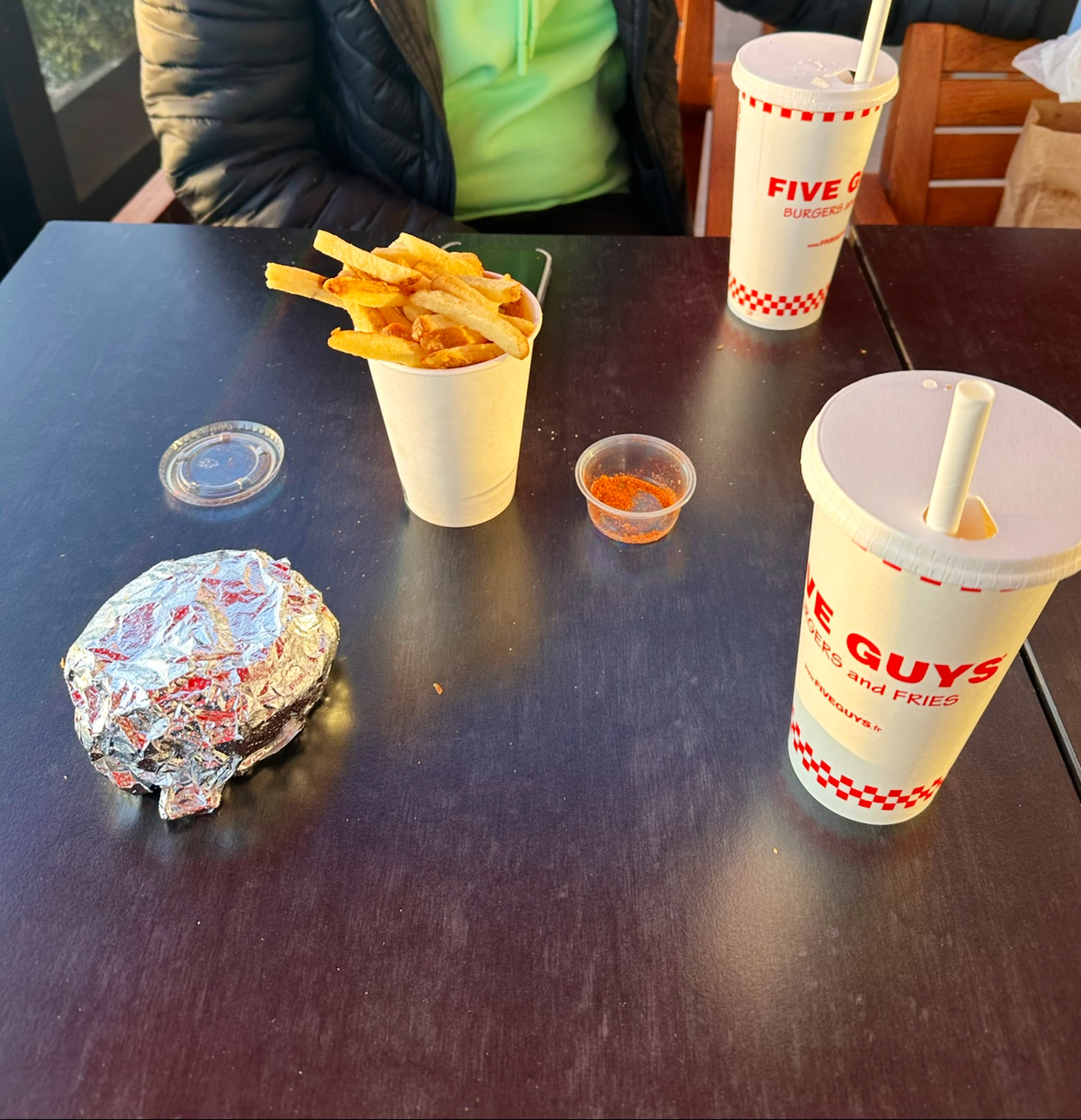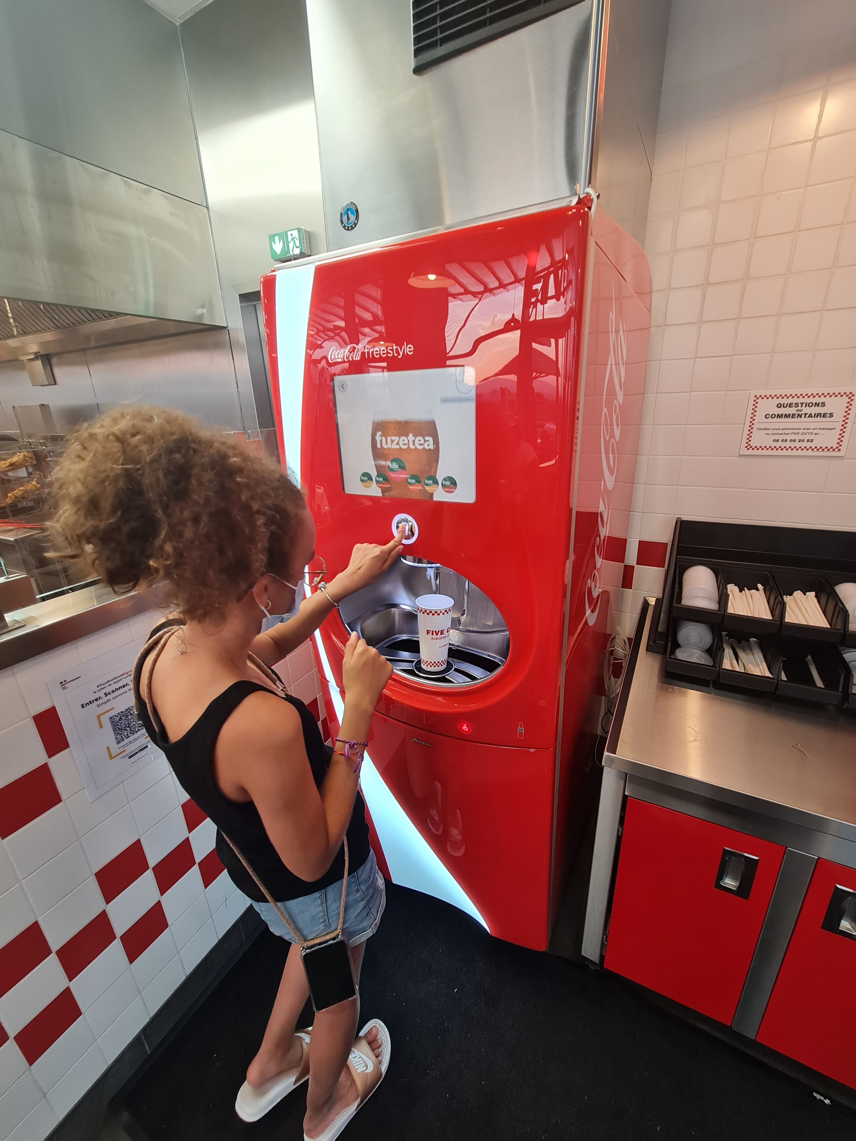 On se sent toujours a la maison dans un Five Guys, Rien à signaler de particulier, les lois françaises un peu pénible sur la consommation de boisson à volonté peinent un peu le client puisque la seule envie est de retourner se servir. Attention cependant, le mélange mayo/tchup est à consommer avec modération ! Une barquette de sauce complète sera comme équipée de bottes de sept lieues et n’hésitera pas à bondir de vos mains pour tâcher vos vêtements ! Les boissons transpirent un peu, elles restent donc légèrement glissantes également. Munissez vous d’un grip efficace ! Bon appétit au passage Bonne journée mon kid 🥤