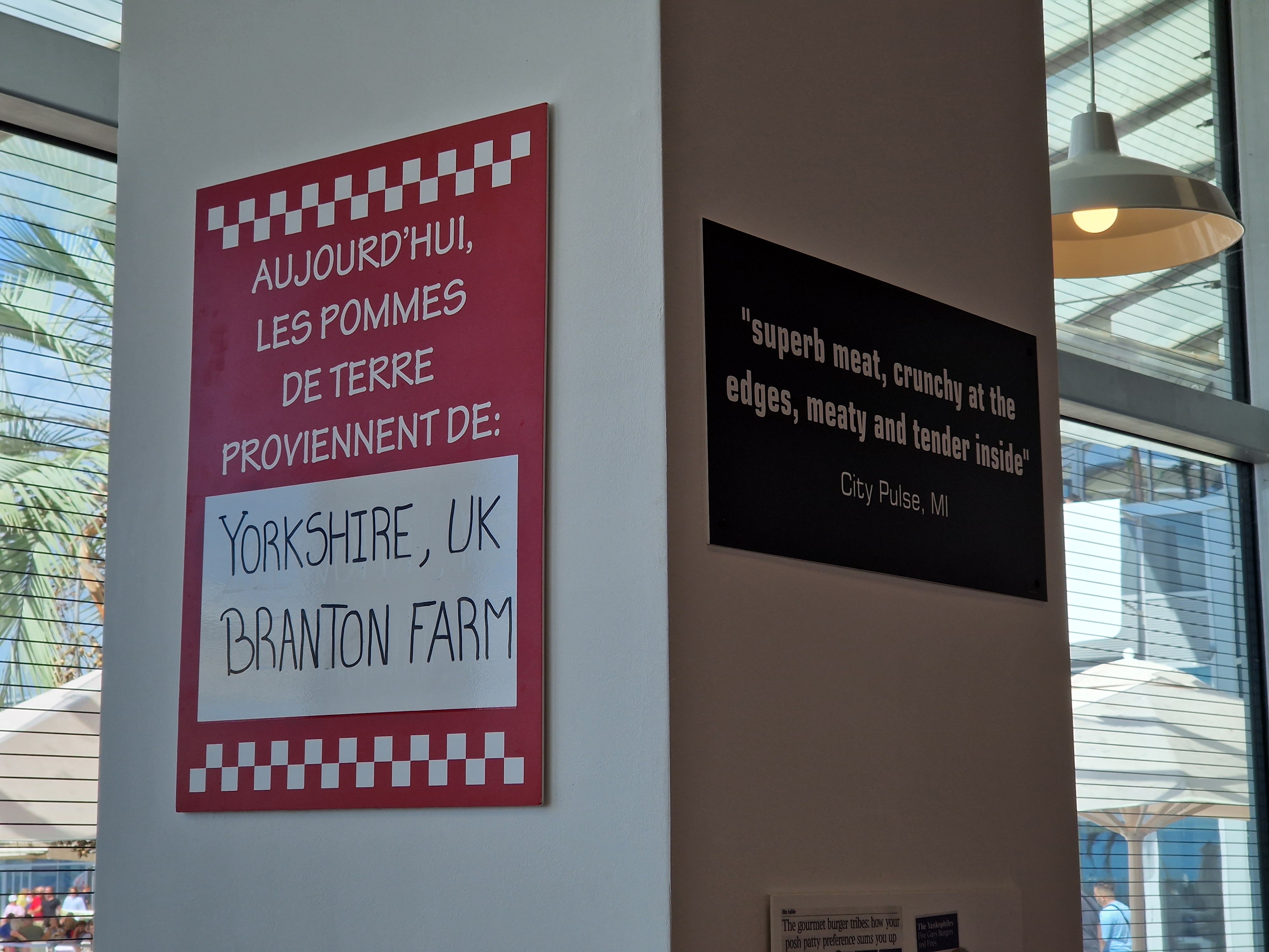 Mangé sur place ,Bon le prix excessif . Les frites dans des gobelets a eau. Pas de plateau mais des sac papiers . Pas de vaisselle réutilisable pour les gens qui mangent sur place d'un point de vue écologique et commercial et culinaire c'est un zéro pointé Vu les prix pratiqués ils doivent faire des marges bien juteuses qu'on ne retrouve pas dans le service.