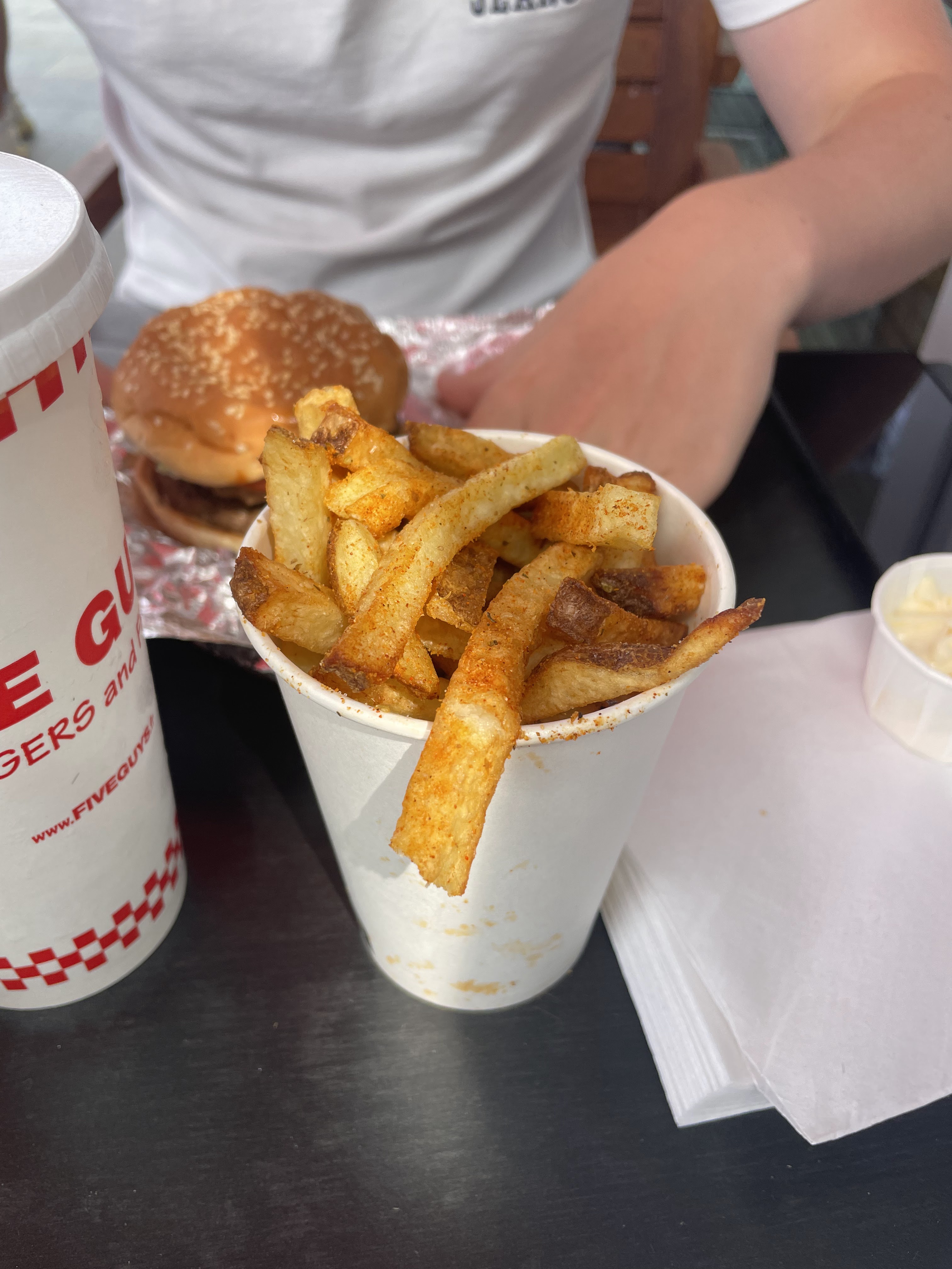 Five Guys, les burgers a l'américaine ! Malgré un prix légèrement élevé pour certains produits, on parle de frites qui débordent avec un super goût, d'un burger gourmand et de milkshakes super originaux ! C'est tout ce qu'on aime quand on veux manger un bon gros burger. On repart d'ici sans avoir faim .