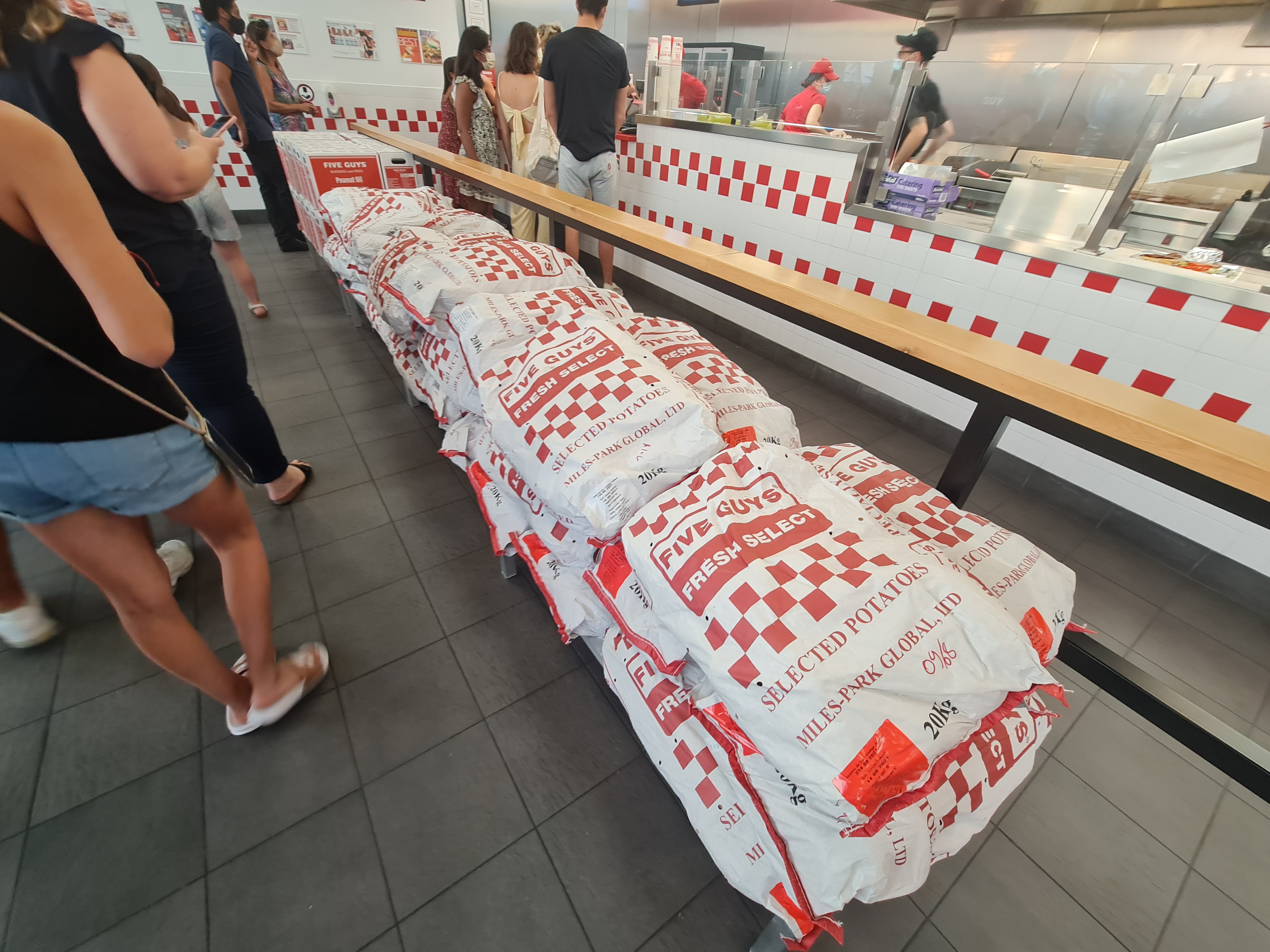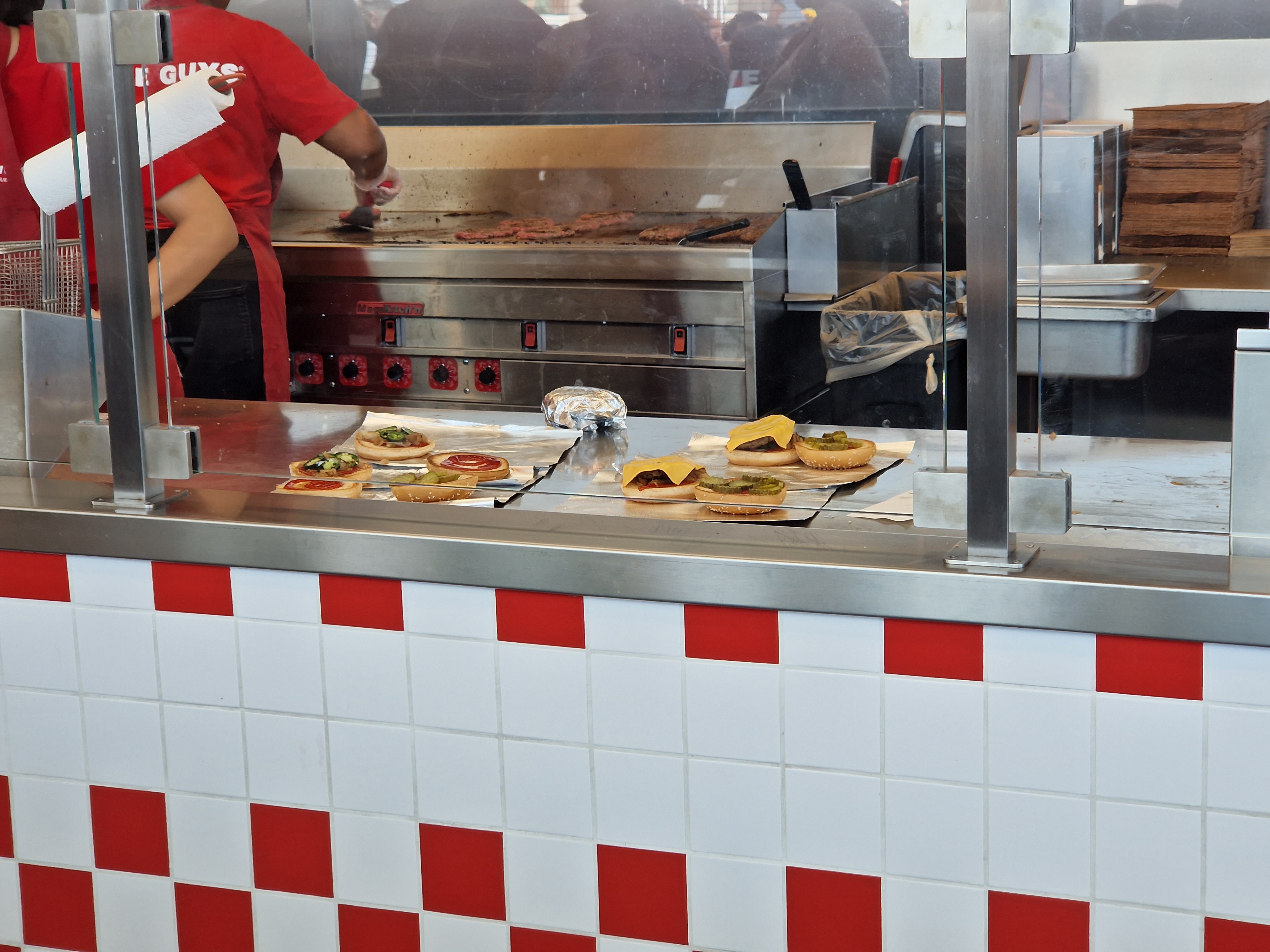 Déçu par rapport à mes expérience des five guys Paris et Luxembourg. On retrouve bien les mème produits mais pas la qualité ni l’attention au standard. Commande 2 burger Attente de 17 minutes alors qu’un des deux burger était ok l’autre mis de côté et donc froid. Les frittes préparer à l’avance dans un gobelet mais après 15 minutes d’attente forcément molle et caoutchouc. Rigueur et régularité à revoir.