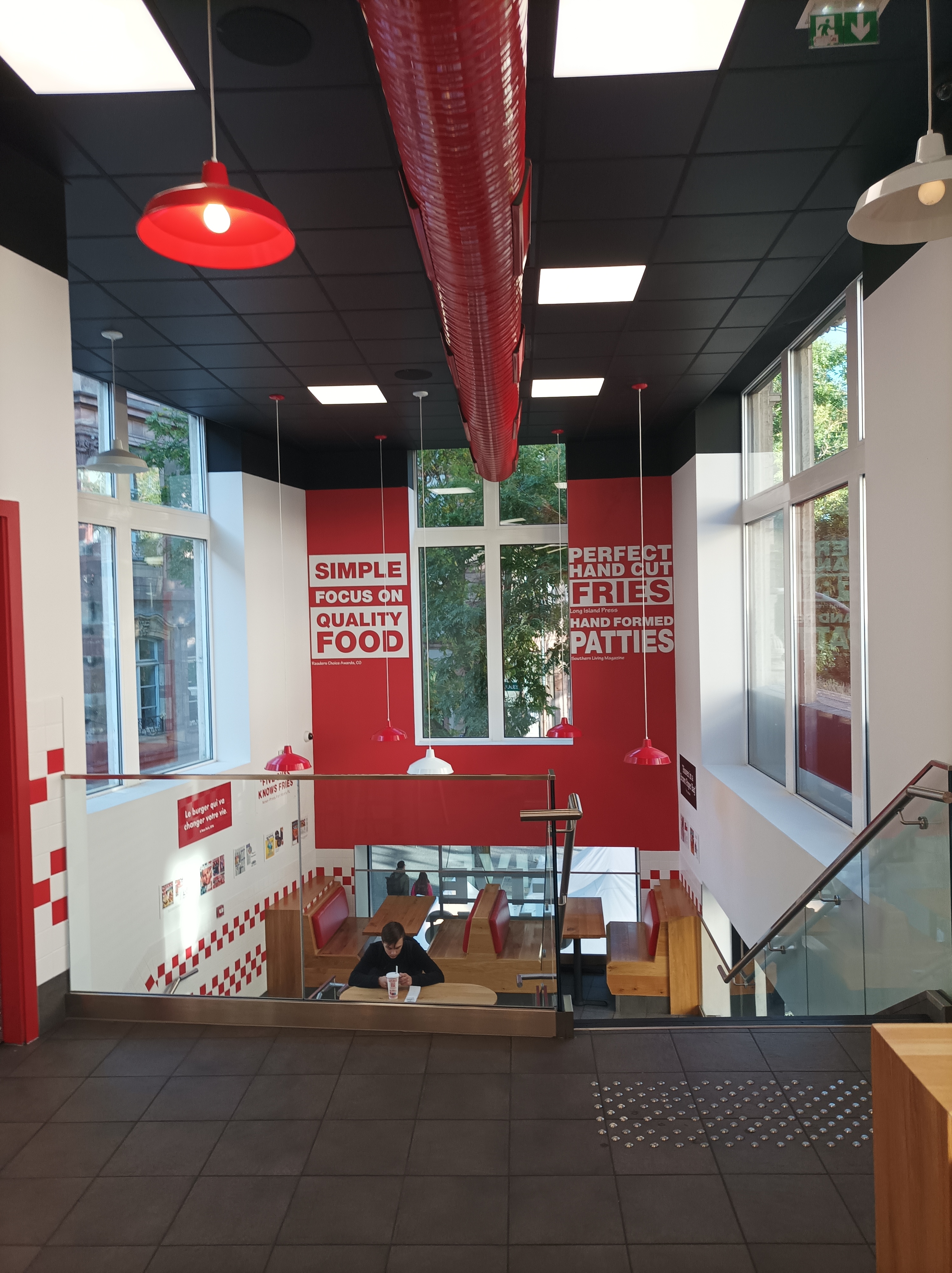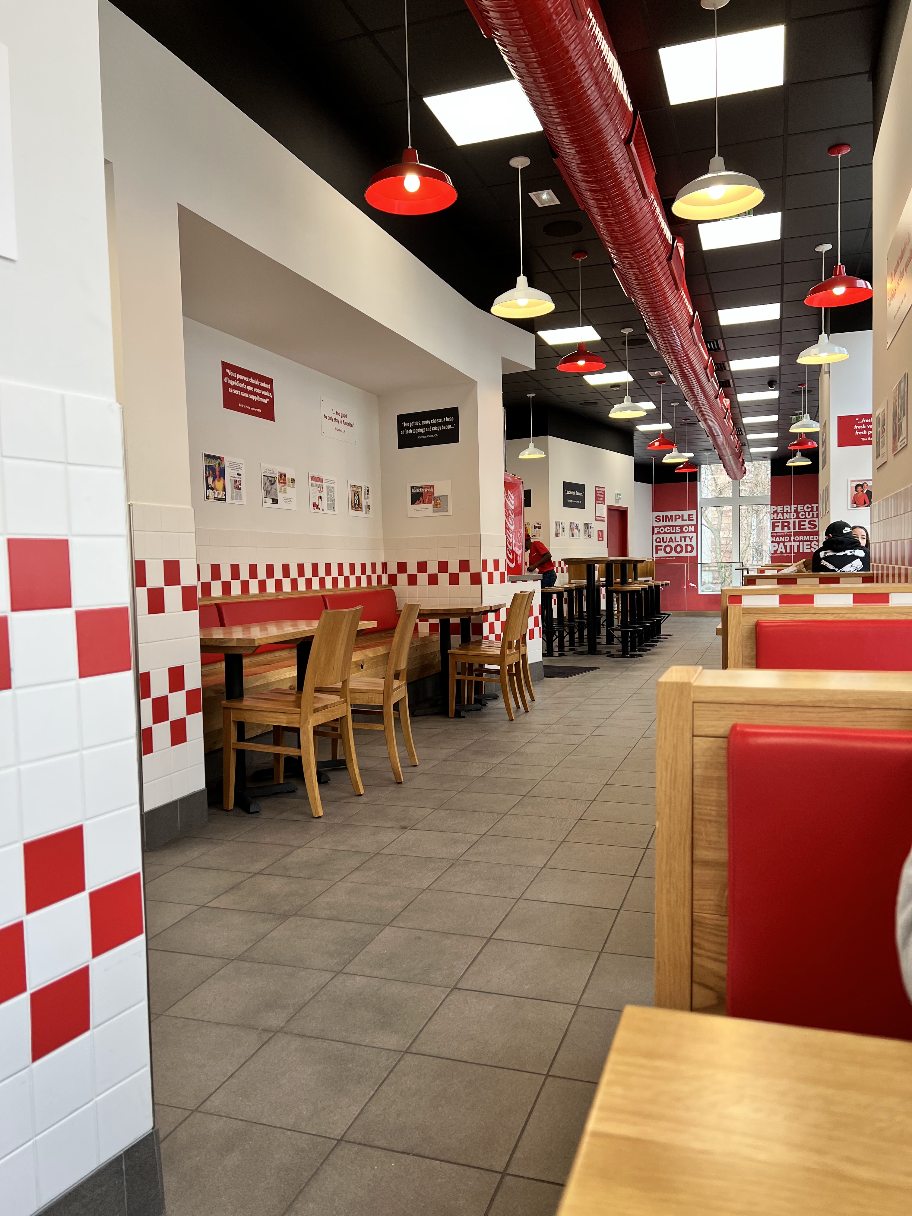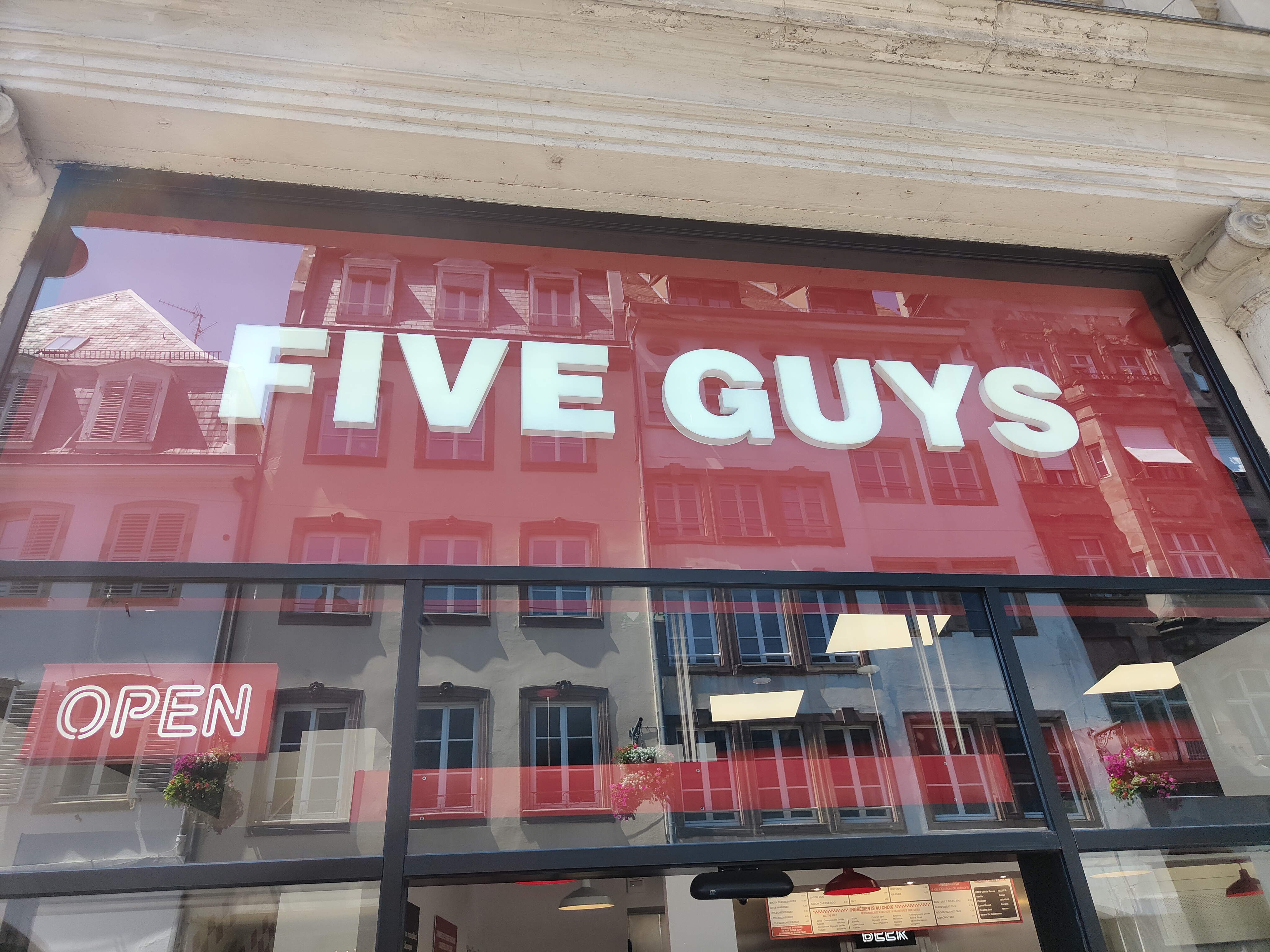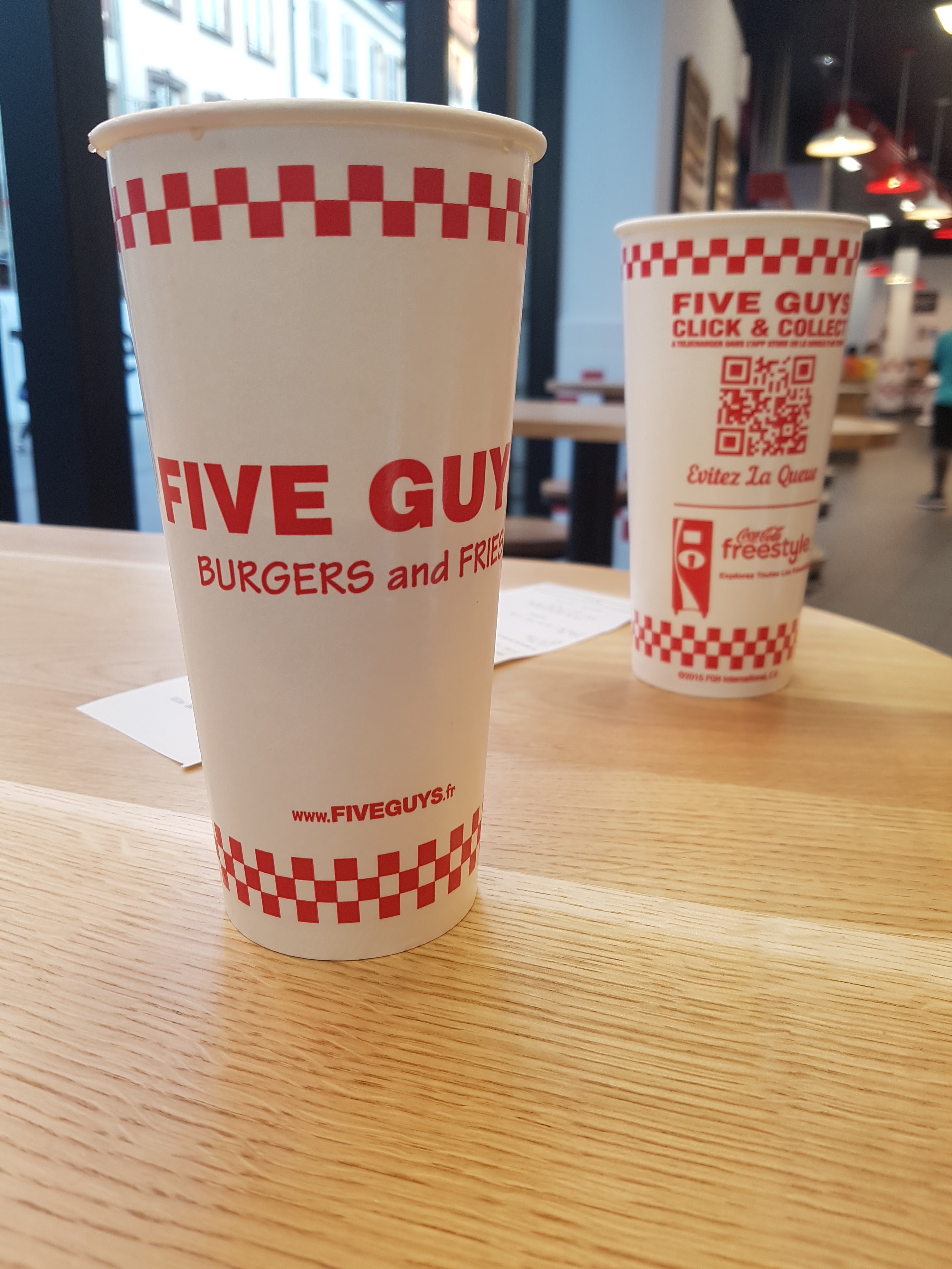 Première fois dans un five guys, nous y sommes allés car nous n’en avons pas à Mulhouse. C’est très cher pour ce que c’est, il n’y a pas de menu, il faut prendre burger / frites / boisson à part ce qui ramène l’addition à environ 20€. J’ai néanmoins trouvé les burgers très bons, le concept est intéressant : on choisit son burger puis on ajoute autant d’accompagnements qu’on veut parmi une sélection de 15 (cornichons, champignons, oignons, tomates, etc etc..) Conclusion c’est à faire si vous n’avez jamais goûté. Personnellement nous n’y retournerons pas, nous avons testé, aimé mais préférons tout de même la concurrence 😊