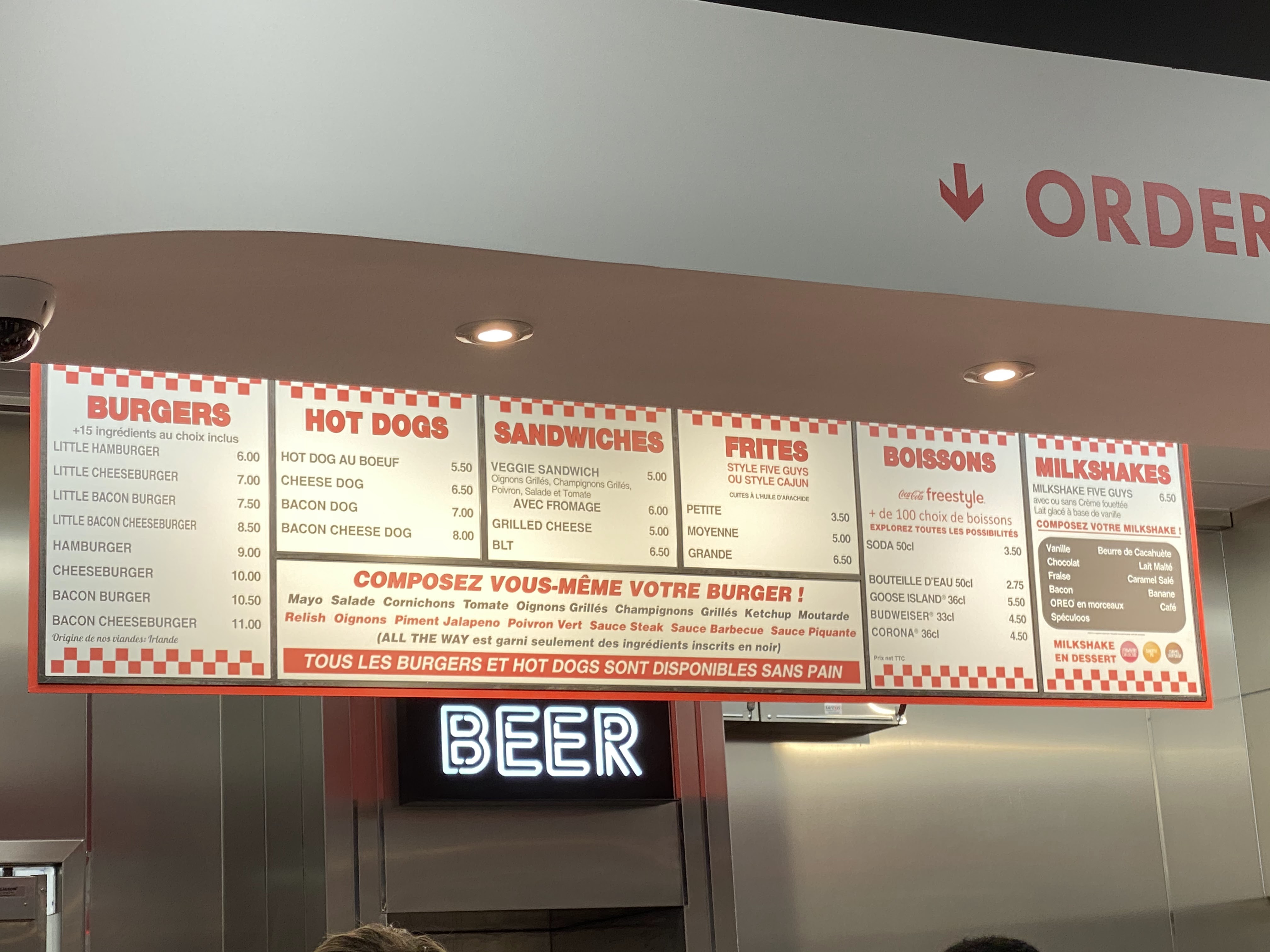 Pas de menu a la carte, un choix restreint pour assurer la rapidité du service. Accueil en caisse excellent, le souci de la satisfaction client est présente. les burgers sont bons, bien meilleur qu au Mac Do ou burger king. Contrairement à ses habitudes mon fils de 8 ans a dévoré le sien qui était pourtant de bonne taille pour son âge. Les frites sont également fort sympathiques quoi que très salées. Reste que l addition aussi est salé, 40€ pour 2 burgers, une(très) grande frites, 2 boissons et un milk-shake. A ce tarif j'aime autant allé a starling burger avec du pain maison, sauce maison et un burger encore un cran au dessus pour un prix légèrement moindre. Par contre a choisir entre Five guys, Burger King et Mac Do il n' y a pas photos,la qualité et largement supérieure a Five Guys.