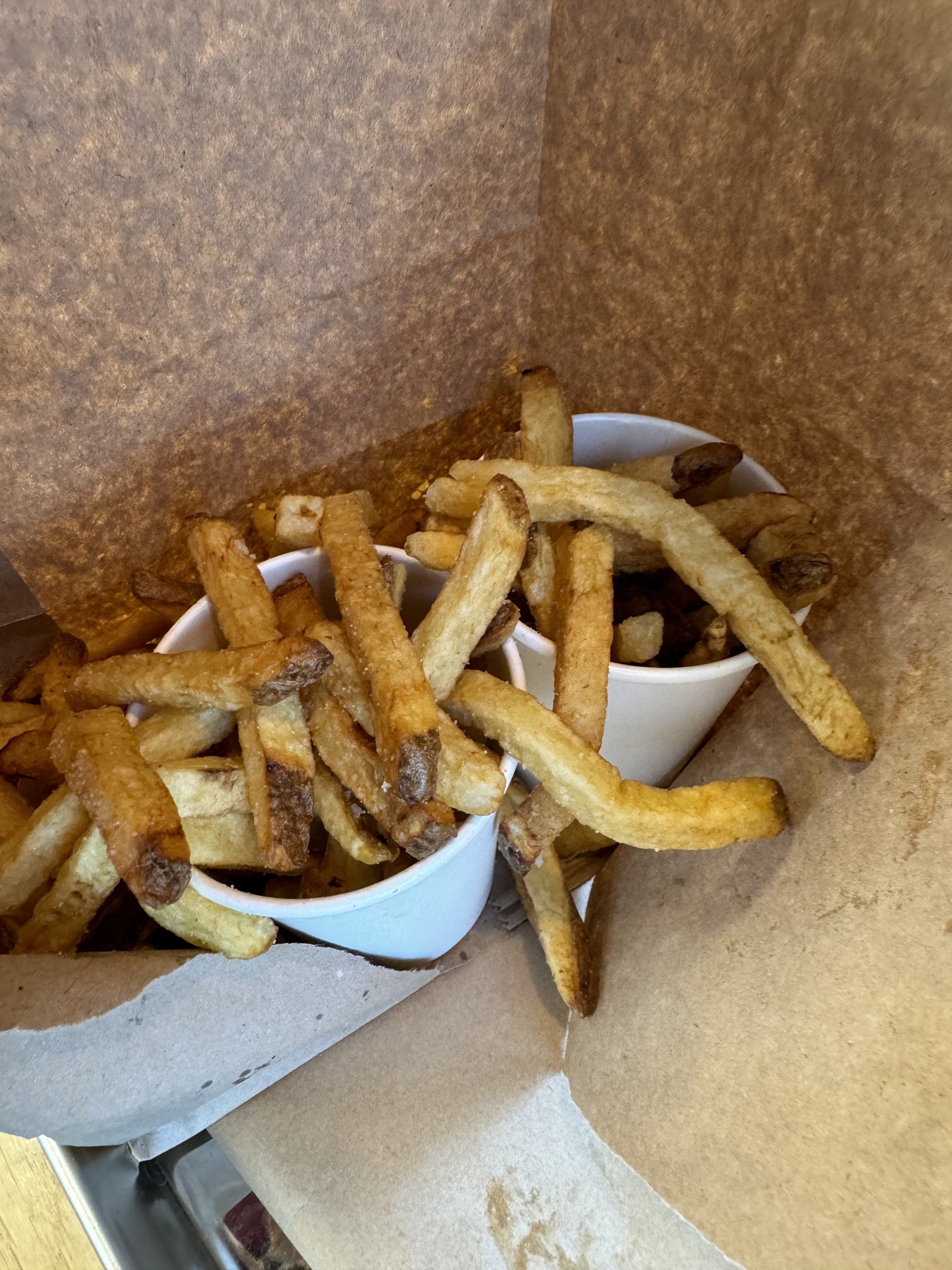 Frittes très bonnes et portion généreuse, burger bon, je tiens a parler de Sonia, l’hôte qui nous a aidé à choisir ce qu’on désirait à la caisse, adorable, elle a pris de son temps pour nous expliquer le concept, très souriante, elle est même revenu pendant notre repas pour nous demander ce qu’on en pensait, l’expérience a été très positive grâce à elle