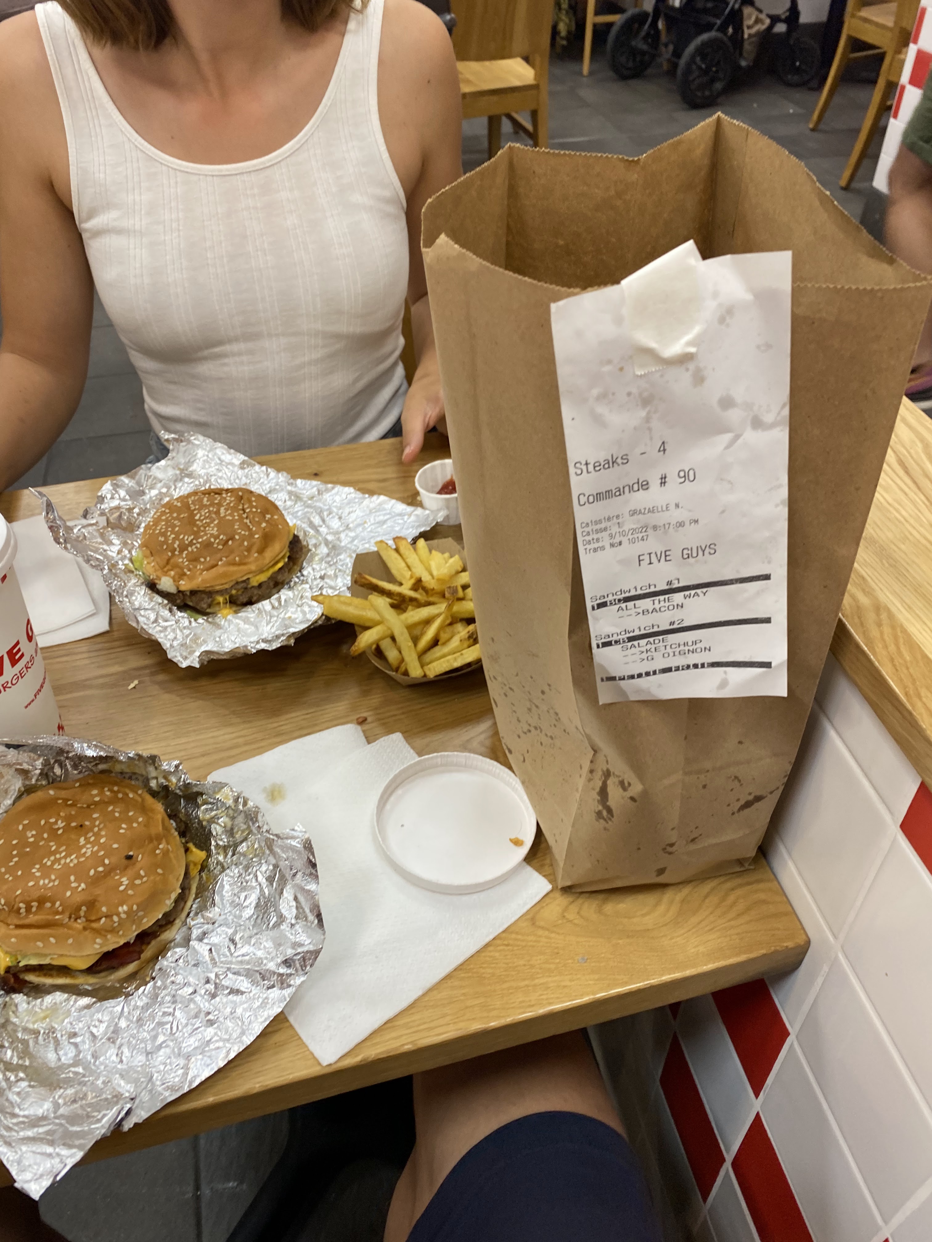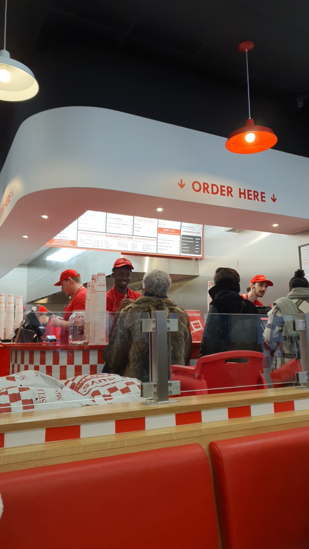 Une très bonne expérience pour mon premier Five Guys. Ambiance américaine assez atypique qui est très appréciable pour la franchise avec une marque de fabrique qui ne se retrouve nulle part. Des ingrédients en supplément.. sans supplément, boisson au choix et papier en aluminium. Tout ce qui fait l’identité de Five Guys qui ne ressemble à aucun autre fast food, et ce qui fait qu’on l’aime tant !