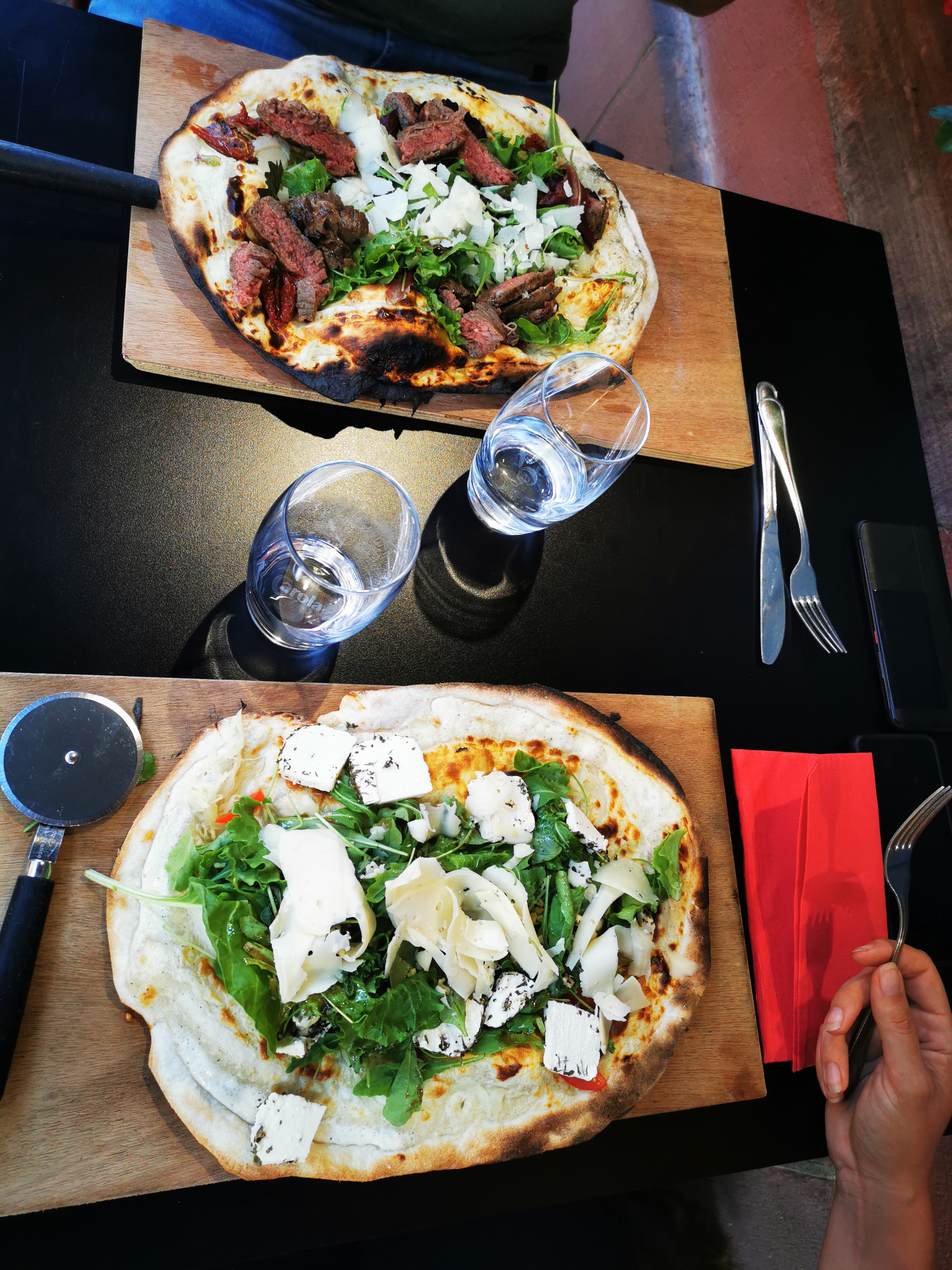 Mmmmh... une des meilleures tartes flambées jamais mangées ! 1) Chèvre, miel poivré, salade verte, noix et 2) Tomates confites, mesclun aux herbes fraîches du jardin et copeaux de parmesan. (Du vrai parmeggiano reggiano affiné 24 mois !) N’hésitez pas à vous asseoir à cette table en plein milieu de la zone piétonne dans la vieille ville de Kaysersberg, car le service aussi est sympa et poli.