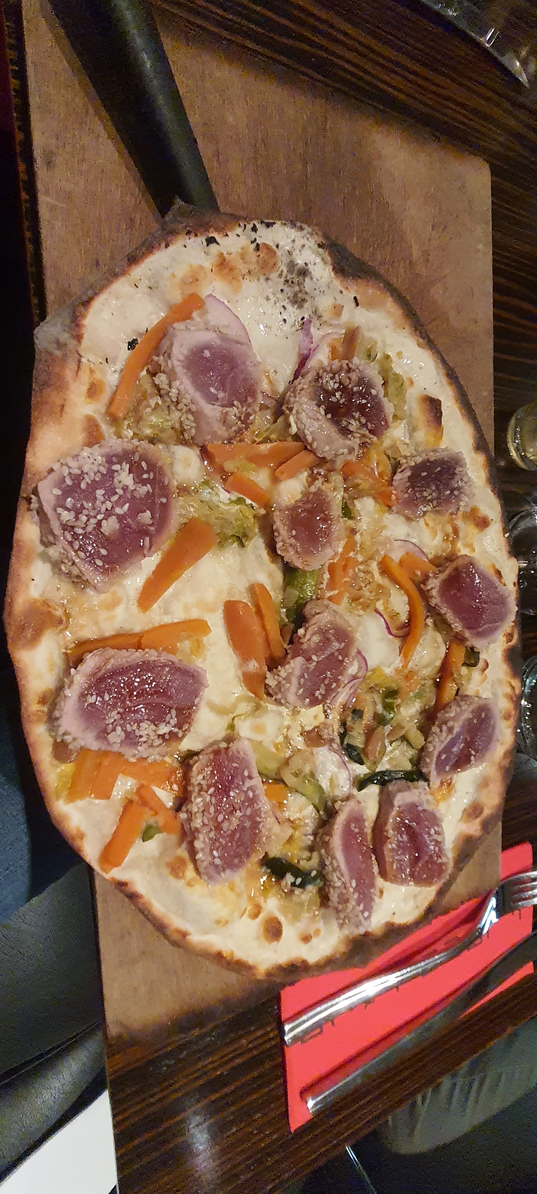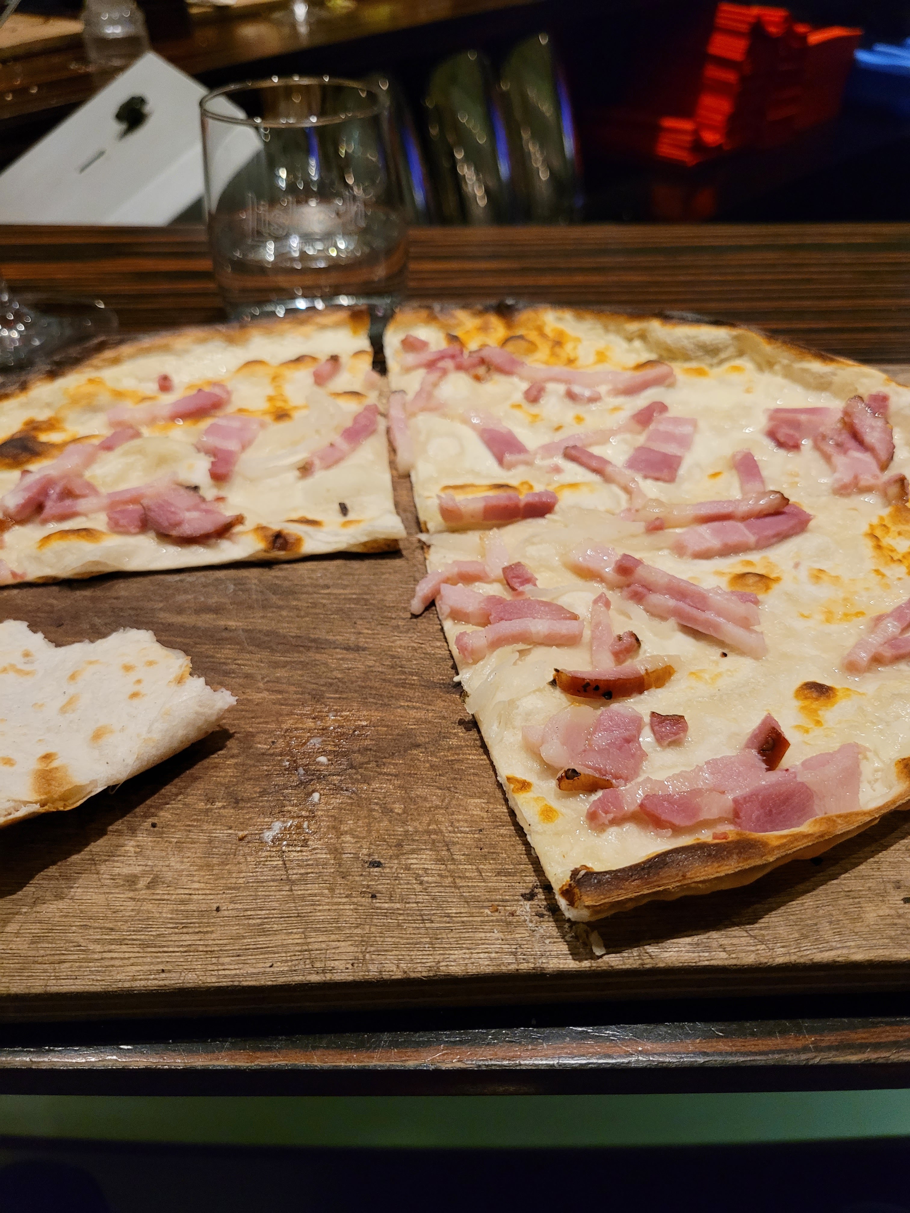 Les tartes flambées étaient correctes. Un peu chères pour la quantité (notamment celles avec viande et poisson où quelques morceaux de plus seraient appréciables). Les croûtons tout-faits ajoutés n'étaient pour moi pas utiles. On a entendu parler de ce restaurant il y a plusieurs années, mais c'est peut-être plutôt devenu un endroit adapté aux touristes. Rien à redire sur le service, assuré avec sourire et enthousiasme. Le petit amuse-bouche pour patienter était très bon.