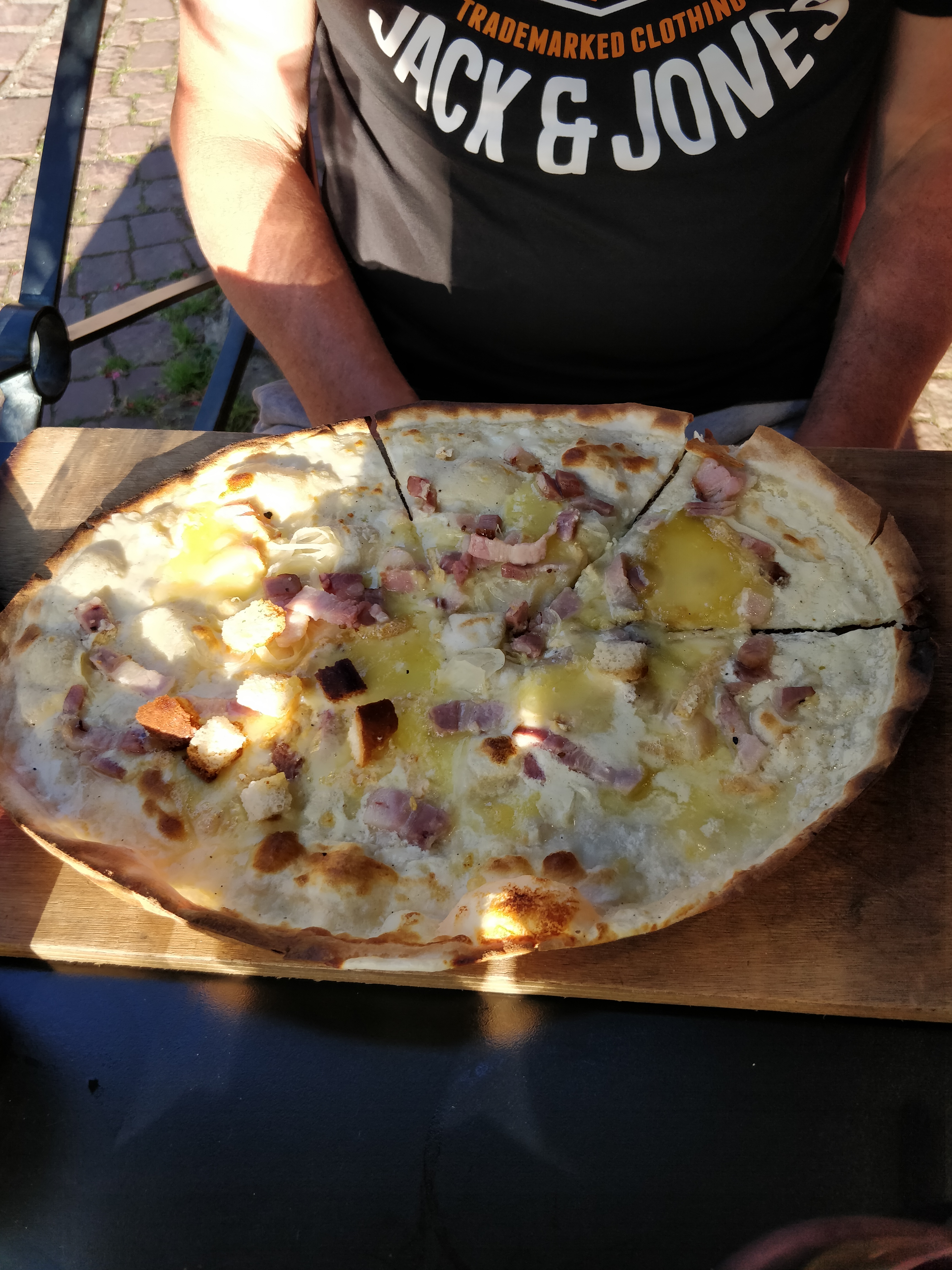 Excellente flammenkuch mais cela fait 2 fois qu'on nous sert les apéritifs en même temps que les flammenkuch et nous aurions préféré comme dans tous les restaurants avoir les 2 l'un après l'autre. Comme nous avions également commandé du vin pour accompagner les flammenkuch nous avions tout à boire en même temps...très désagréables.
