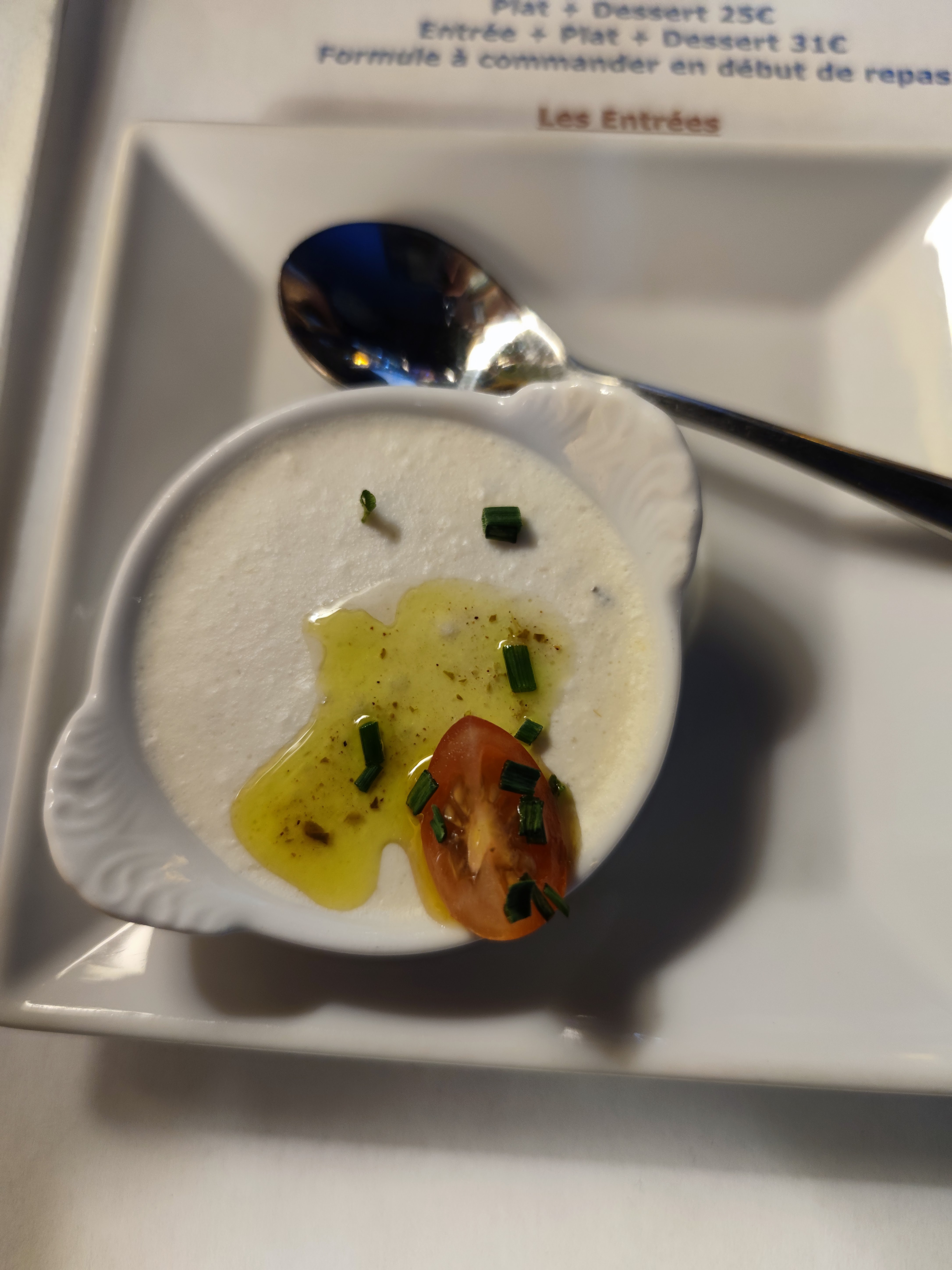 Le dîner était bon, mention particulière pour le dessert Toutefois attention au tarif… 9€ la bouteille d’eau cela me laisse perplexe…