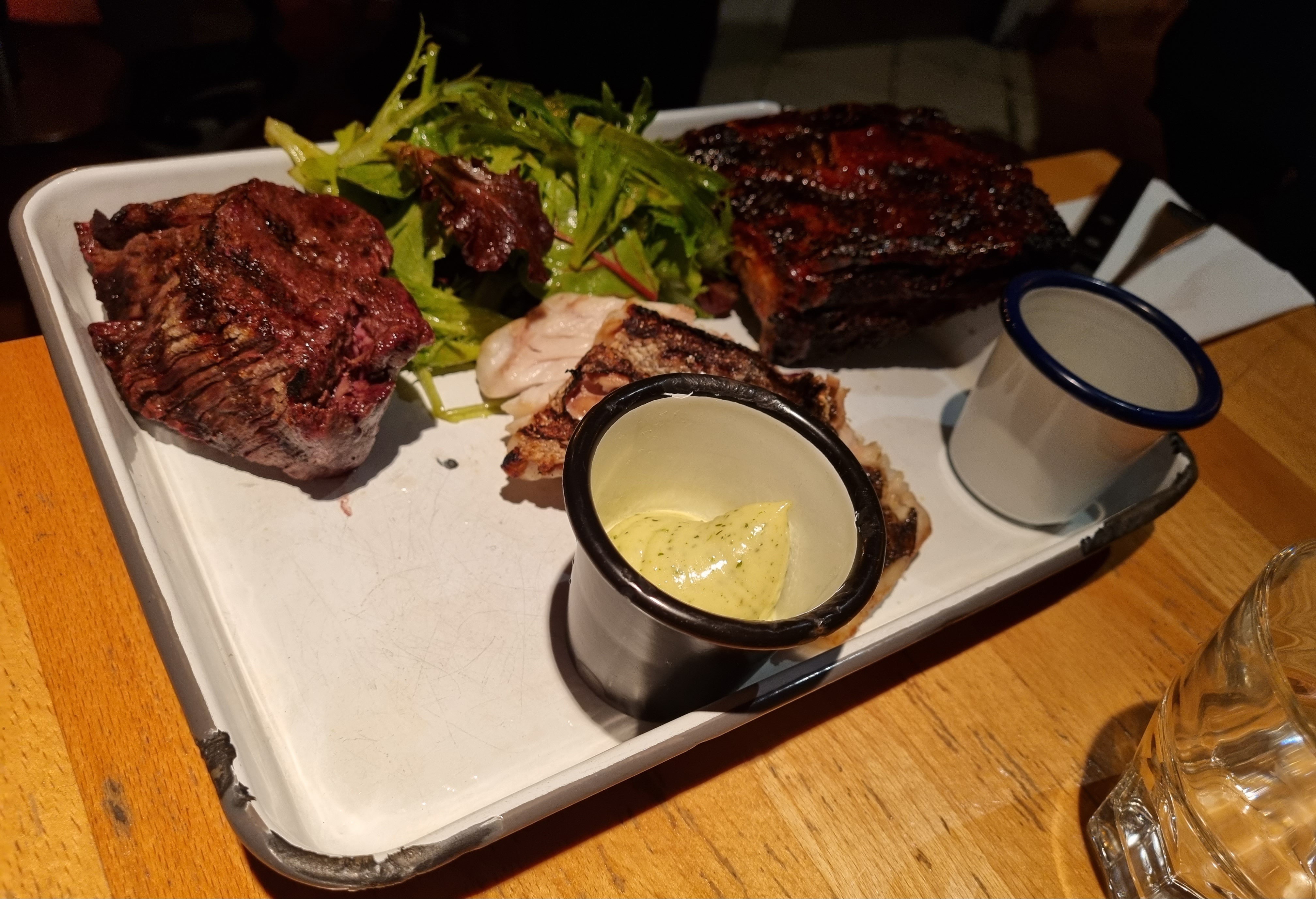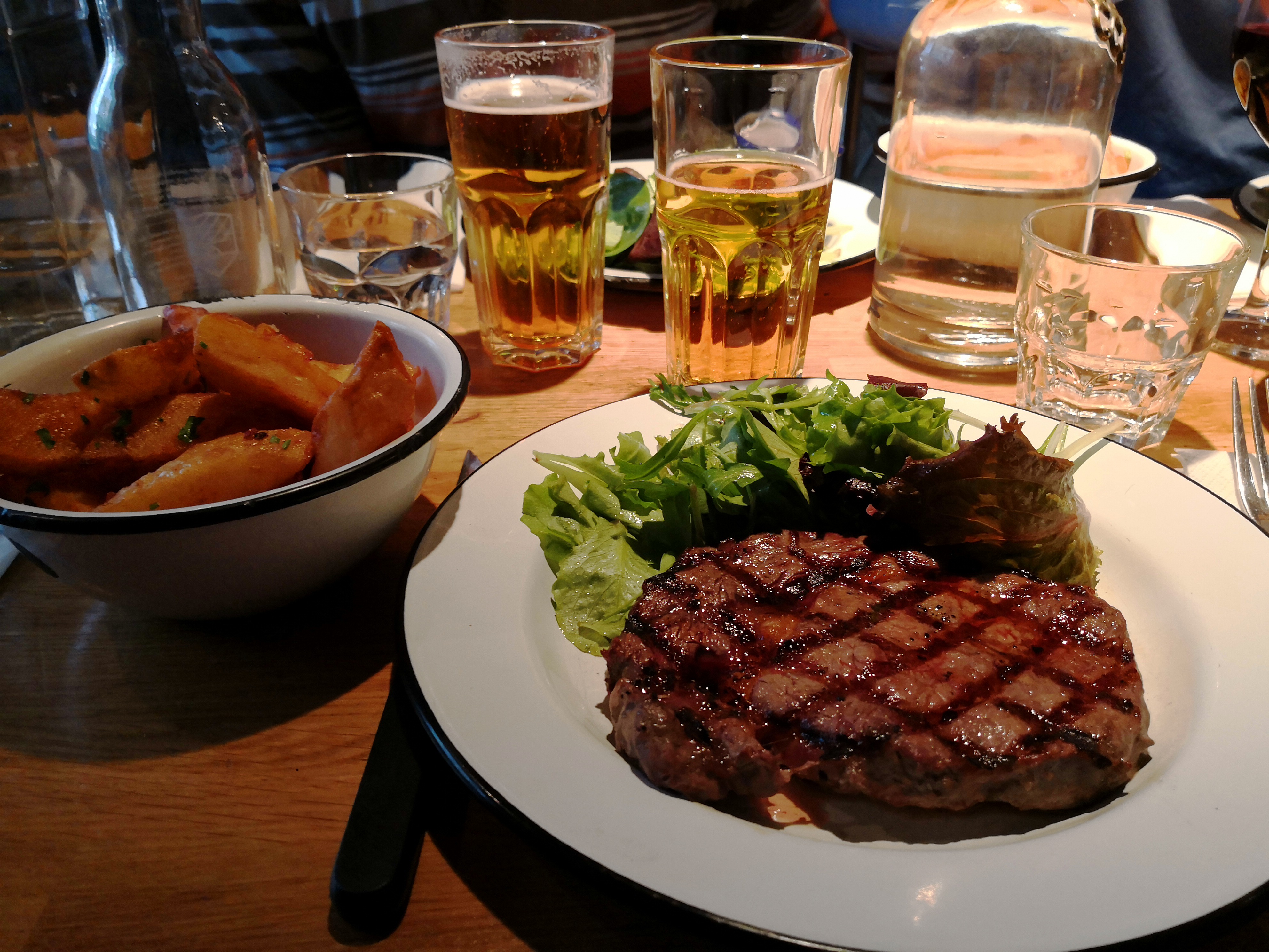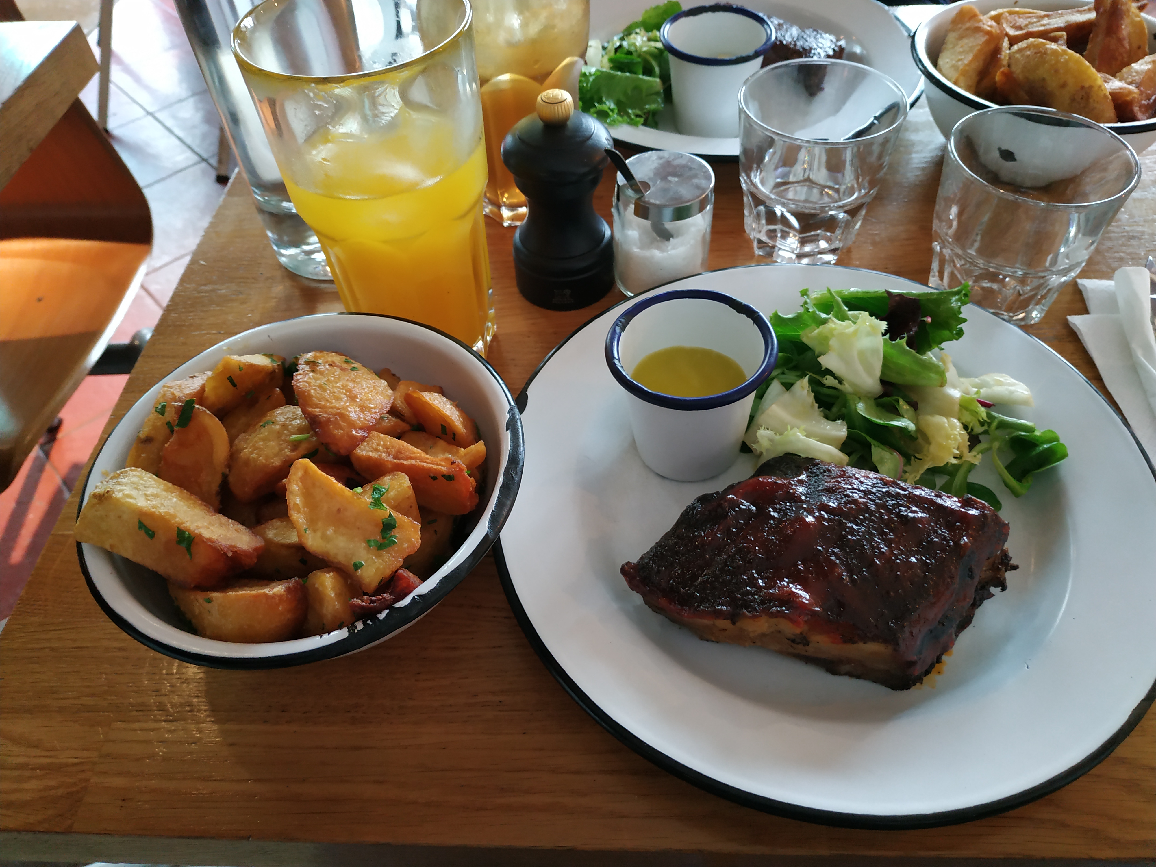 Les ribs sont excellents, les frites maison, le pavé de bœuf est très bon malgré un à point un peu trop bleu.. Je trouve que les prix sont un poil élevés, 6€ l'accompagnement qui n'est pas compris dans le plat.