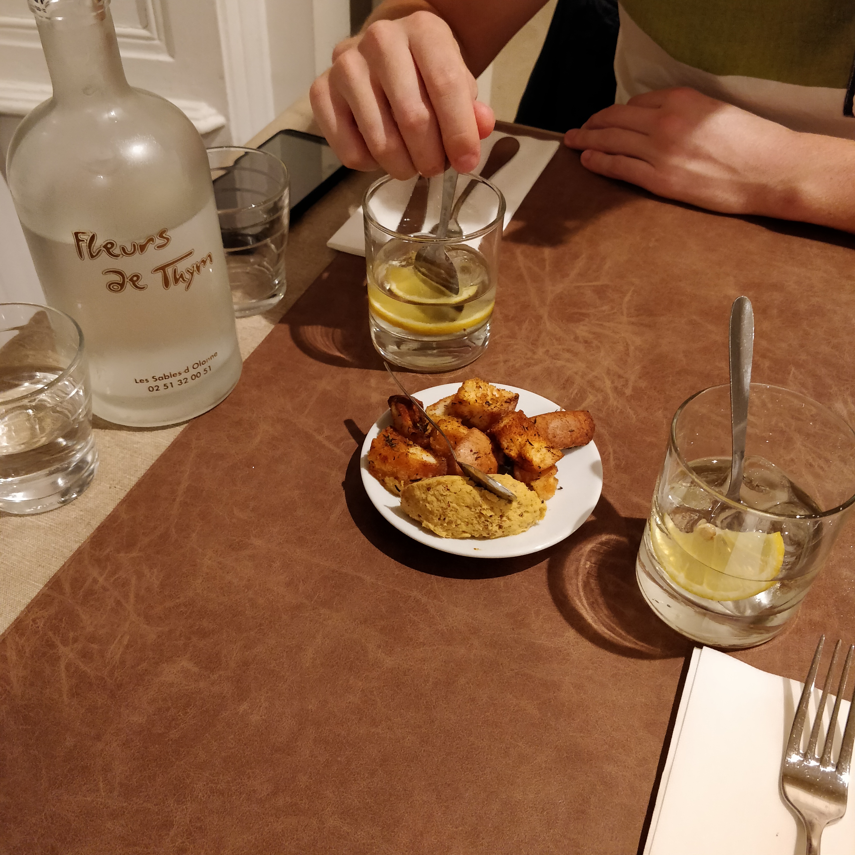 Super découverte ! Restaurant choisi au hasard de notre promenade sur le port des Sables, nous n’avons pas été du tout déçu. Menu abordable et délicieux et les chiens y sont acceptés. Au menu: assiette de fruits de mer, magret de canard aux fruits et gâteau nantais pour terminer (31€/personne)