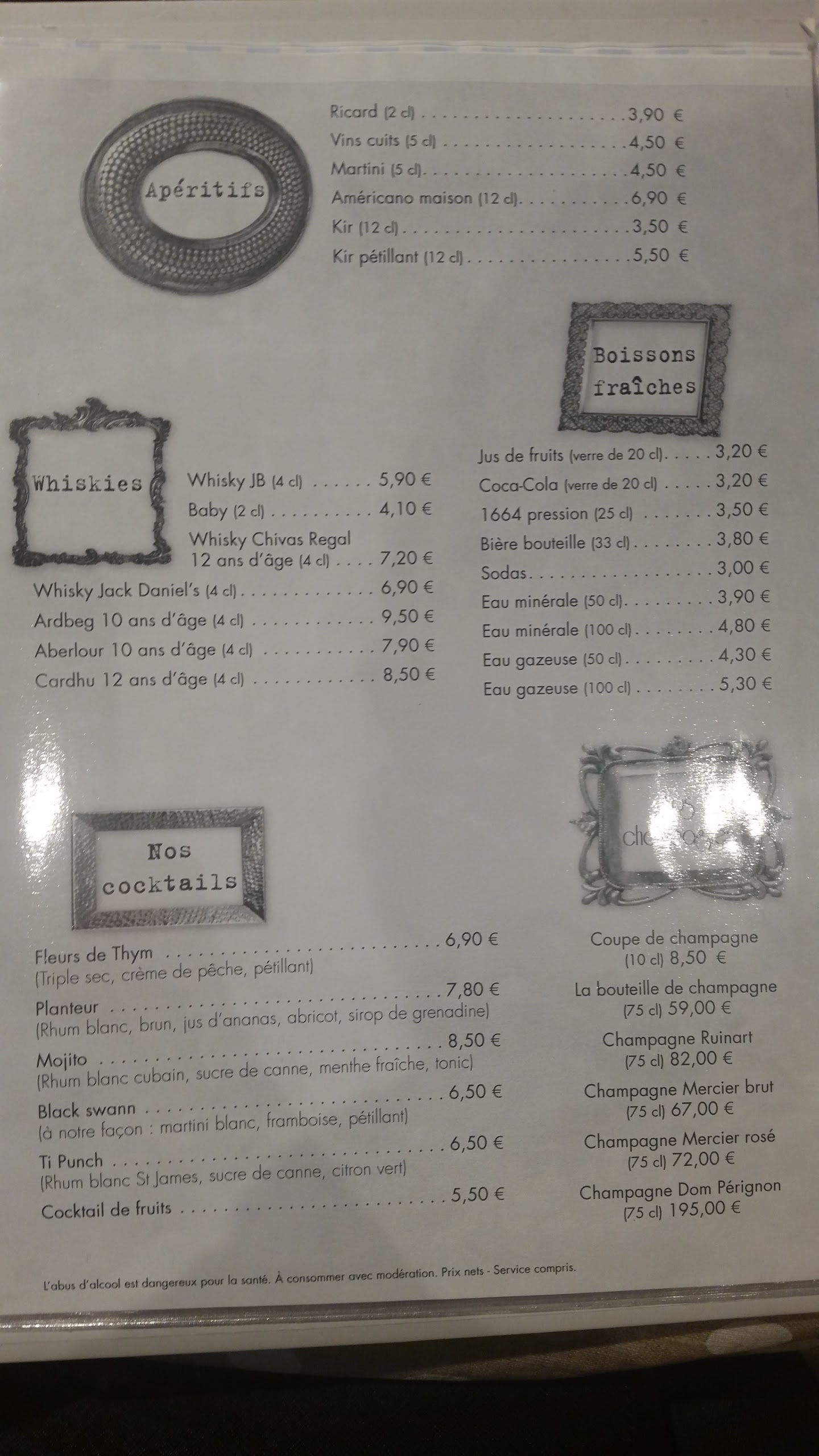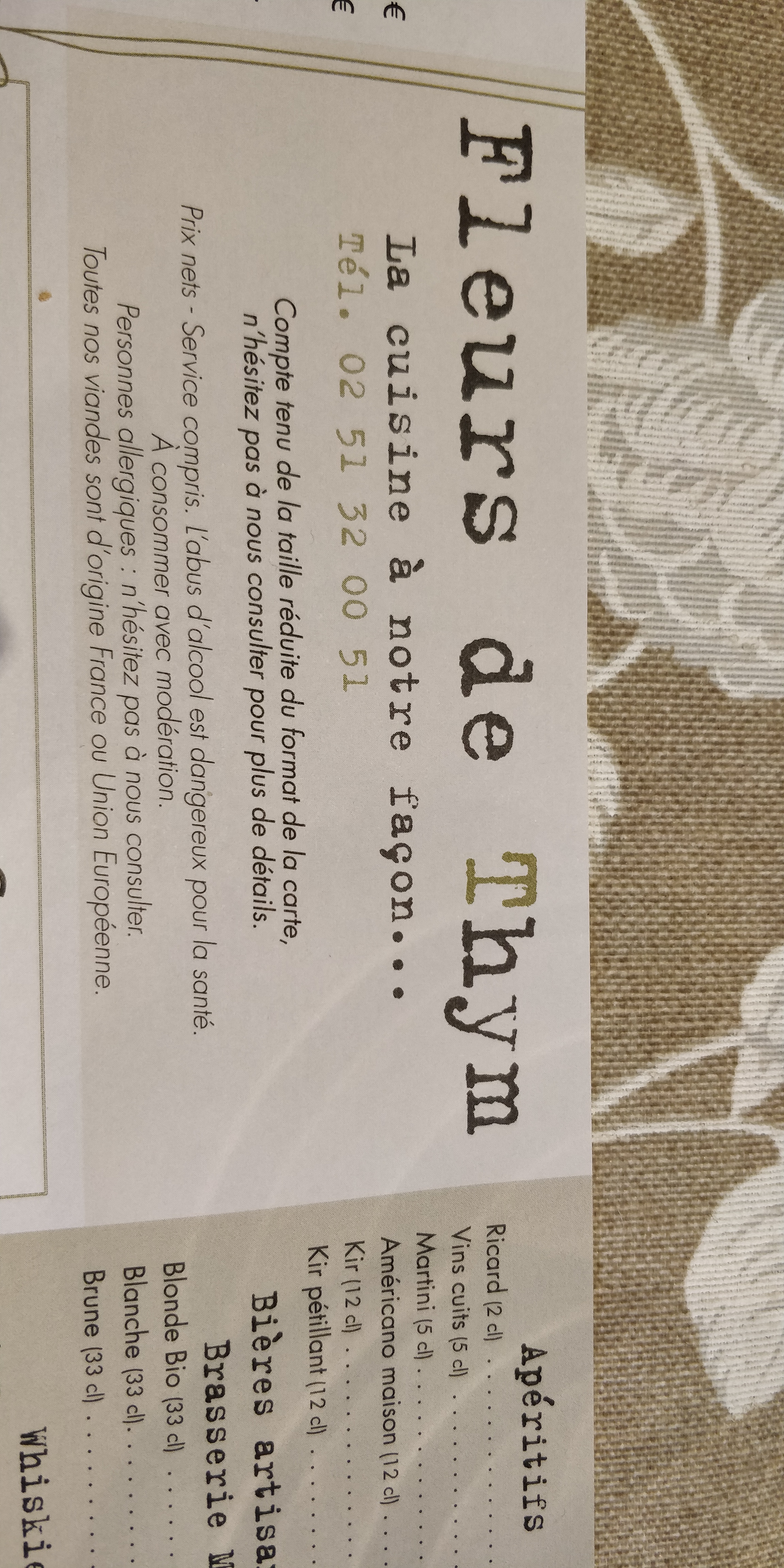 Accueil convenable, cuisine pas à la hauteur, hélas, ragoût de seiches digne d'un traiteur de restauration rapide... Saumon au reblochon et céleri d'une fadeur extrême. Tarte au citron destructurée ( non annoncée au menu) consistant en un biscuit rond coupé en deux, de larmichettes de crème aromatisée au citron et de petites meringues de confiserie. Les Fleurs de Thyms ont connue jadis leurs heures de gloire sur le quai du port de pêche. O tempora, O mores. Un point positif, un des rares restaurants ouverts en janvier au centre des Sables. Pour information : menu 36 €. Personnellement, à eviter sauf si vous êtes invités. NB: Mon premier avis défavorable de mes critiques sur Google.
