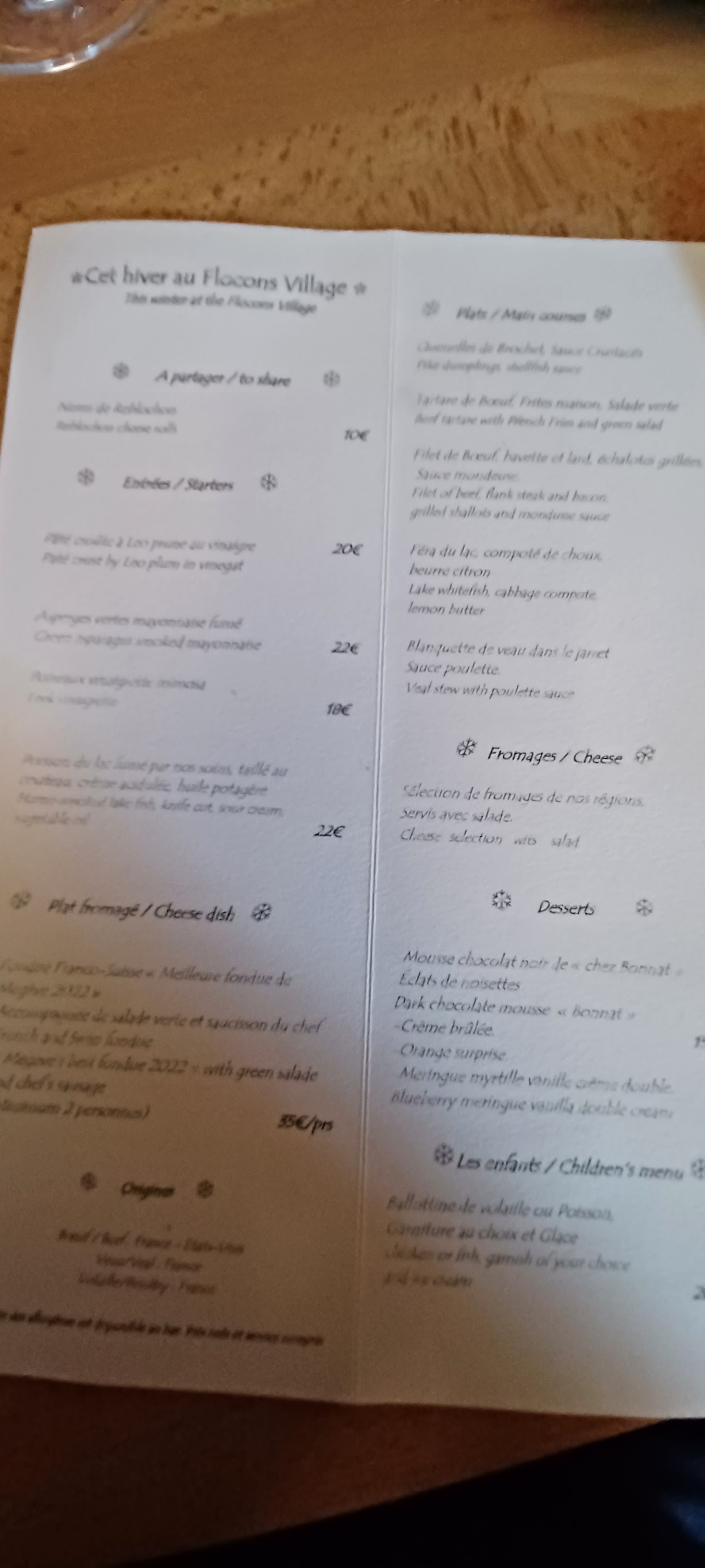 Nous avons dîné en juillet 22 au flocons village - quelle déception !! Entrée fade, fondue sans saveurs vin bouchonné … nous ny retournerons plus Alors que nous avions un bon souvenir de hiver 2019…