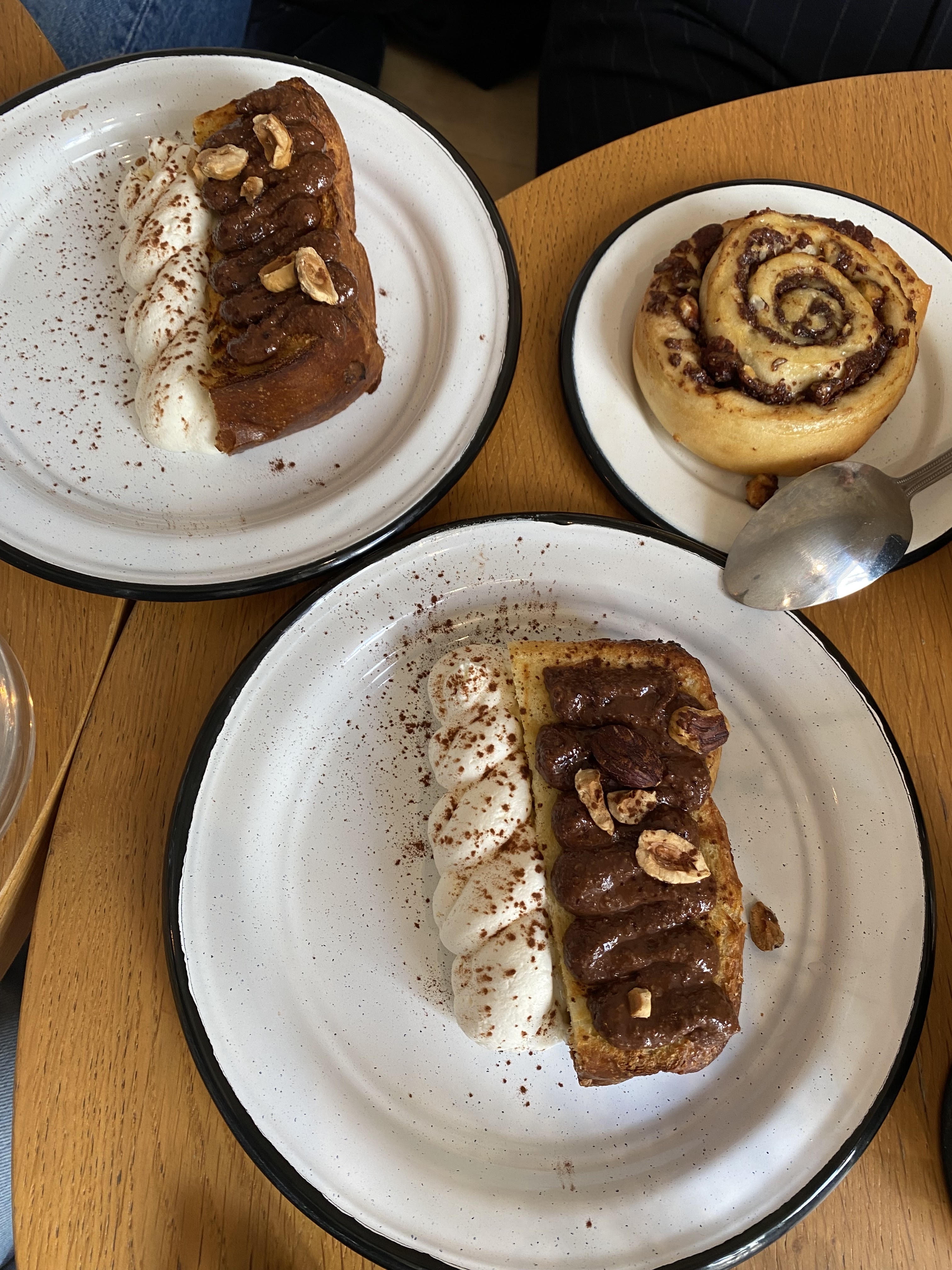 Plats : Formule 1 : Goat -toast, mini granola, à fleur de peau (thé) & citronnade de sureau, cinnamon roll. Formule 2 : French fluffy pancakes, mini granola, rehab (thé) & Iced tea et ramène ta fraise. Le goat-toast est bon. Les pancakes sont à mi-chemin entre un soufflé français et les pancakes japonaises et sont accompagnées de sirop d'érable. Cependant les nôtres étaient un peu trop cuite. Les thés sont pas mal et les boissons homemade. Difficile de donner son avis sur les mini-granolas 😅: globalement il apporte de la fraîcheur et son servis avant les desserts. Le cinnamon roll est une tuerie. Je vous le recommande vivement ! Le pain perdu était très fluffy, le pesto qu'il l'accompagne se compose de menthe verte (pas assez fraîche) ciselée avec du sucre et en tooping de la chantilly faite maison (délicieuse). Cependant je trouve la part de pain perdu peu généreuse pour un brunch. Comme son nom l'indique c'est très fluffy. La formule est certe complète mais pourrait être plus copieuse à mon avis. Sinon, c'est le meilleur cinnamon roll qu'on a testé 😍. On a beaucoup aimé la signature de la maison : le fluffy bread 🍞. Rapport qualité prix : raisonnable
