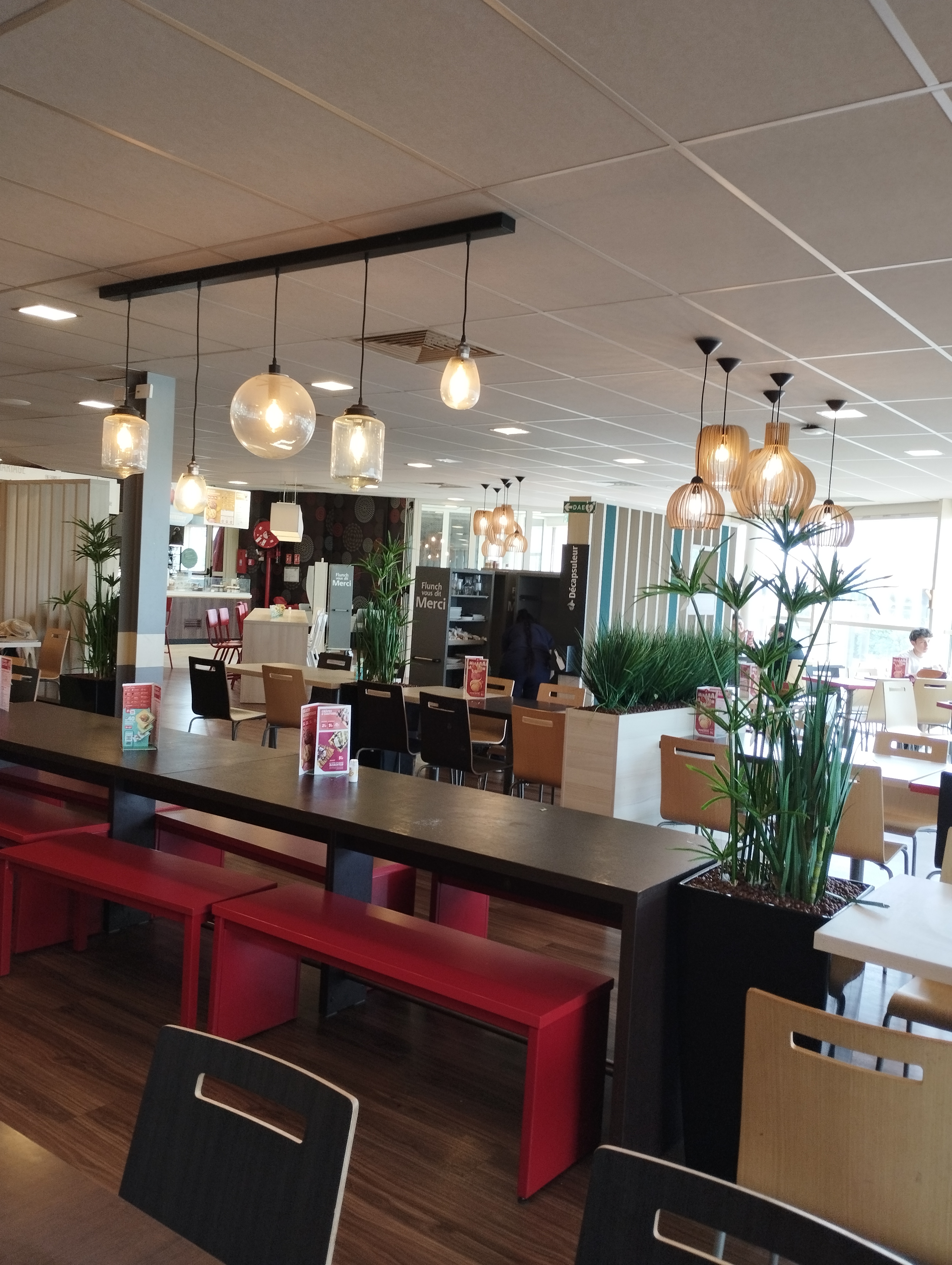 L'endroit est grand et lumineux. Le personnel est courtois et souriant, la nourriture est bonne et bien chaude. Dommage que le manque de civisme des clients sois si flagrant... Il y a des présentoirs pour ranger son plateau !!! Petit bémol sur le Pepsi à la fontaine qui été vraiment sans goût et sans bulles, privilégiez la bouteille a la place..