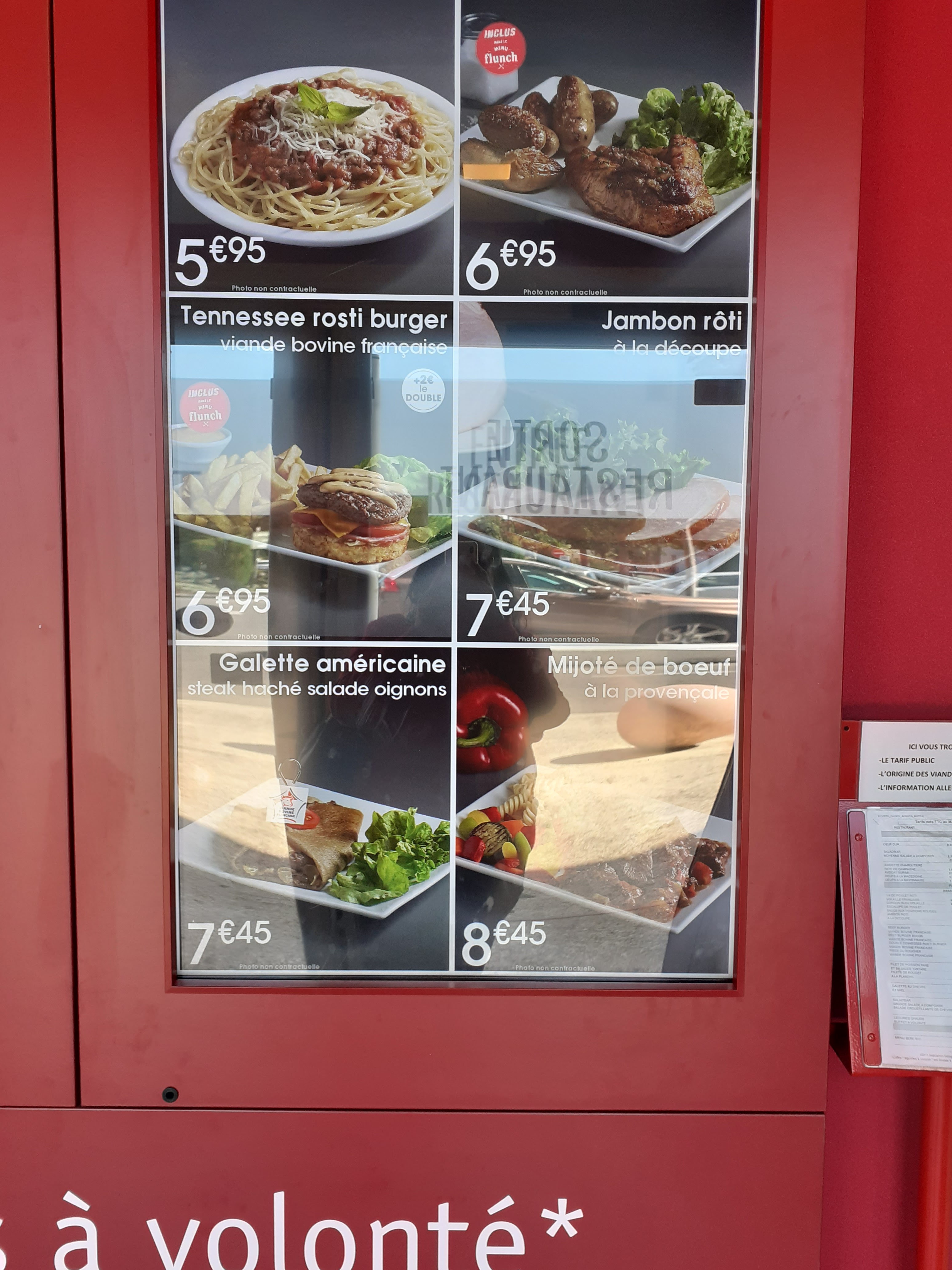 Un Flunch mais en version bas de gamme. On ne peut manger ce que l'on désire si l'on a dépassé une certaine heure (plus de 14h30), les couverts étaient encore sales à l'entrée en prenant le plateau. Un coup de rajeunissement ne serait pas de trop à cet endroit ! Dommage car il y a de meilleurs Flunch. Edit suite à la réponse du propriétaire : À notre arrivée, (donc avant 14h30) les entrées étaient en train d'être retirées. Nous avons pris des F menus. Quand nous sommes passé en caisse on nous a dit ils ne restent plus que 2 Tennessee burger, nous avons hésité quelques minutes, nous étions 4, dont un menu enfant qui n'avait de choix que les nuggets, et mon ami n'a donc pas pris de plat car pas assez de Tennessee burger pour 3.