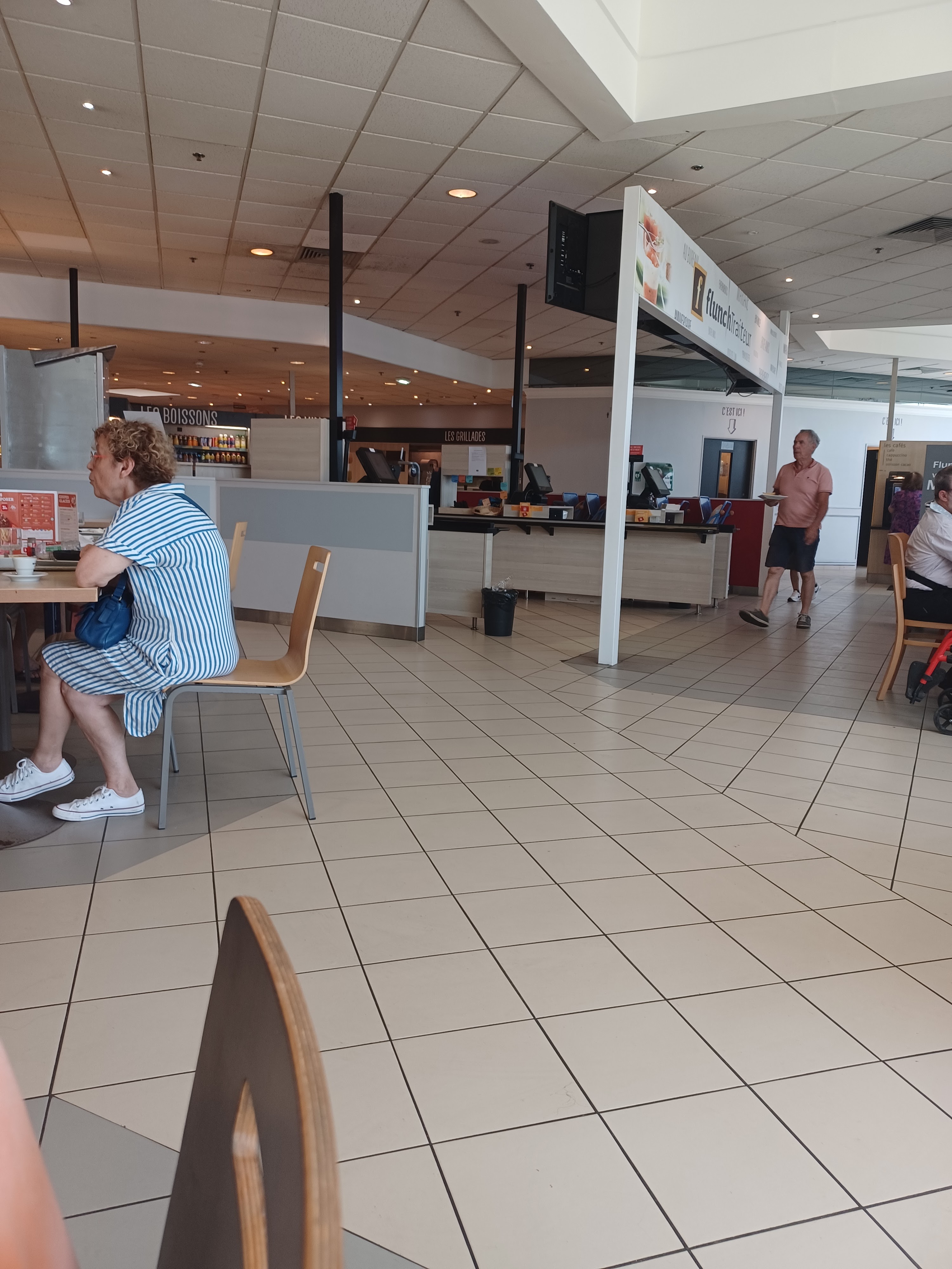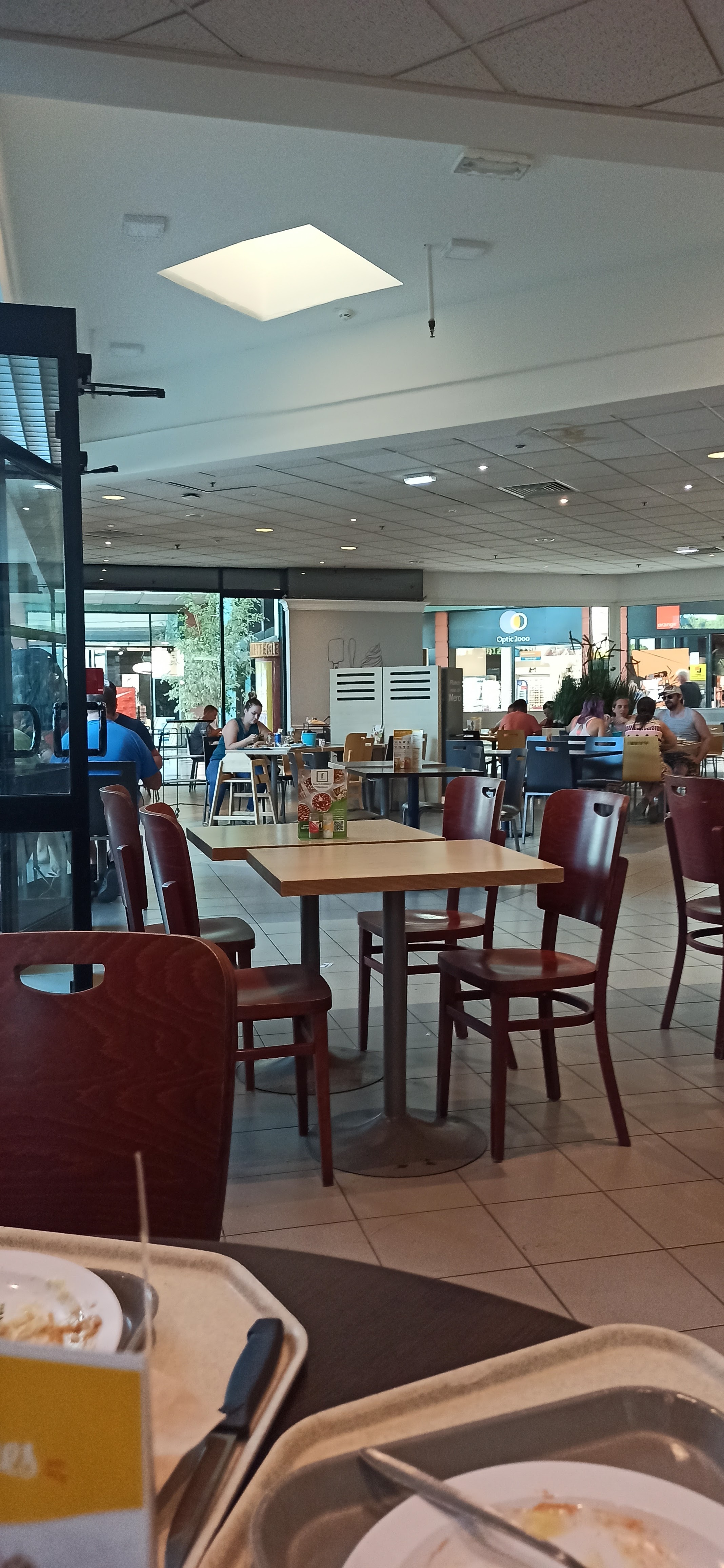 D'entrée, excellent point: les horaires ! Top! Nous cherchions un endroit pour manger un dimanche , vers 14h....et c'est un des seul lieux encore ouvert, nous avons trouvé l'endroit agréable, la salle est bien agencée, le menu nous a tt à fait convenu, avec un large choix , et le personnel était sympa et agréable, autant à la caisse, dans la salle que derrière les comptoirs, une dame a même remercié chaleureusement mon mari qui debarrassait les plateaux ( alors qu'il me semble que c'est normal.. ) , en nous souhaitant ensuite une bonne après-midi, trés gentiment:) le seul petit hic, mais ça c'est dans ttes les cafétérias, c'est la climatisation aux plafond, j'ai toujours trouvé que c'était pas très agréable de manger avec de l'air froid dans le cou, mais c'est vraiment très personnel comme remarque et cela n'entache en rien au bon moment que nous avons passé