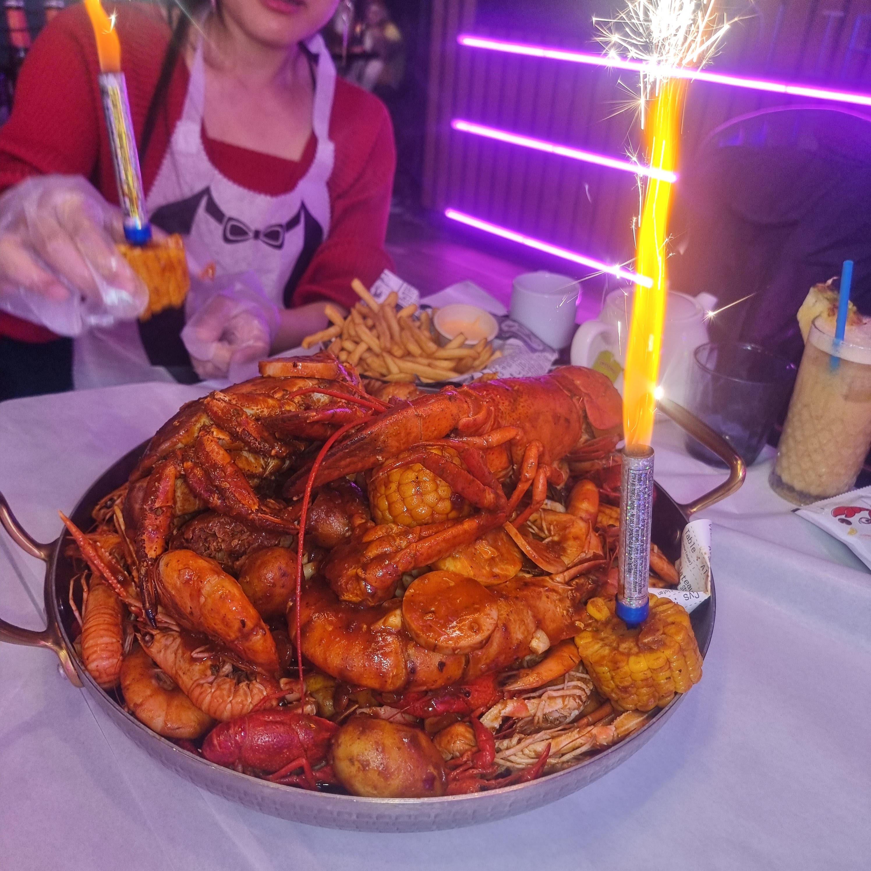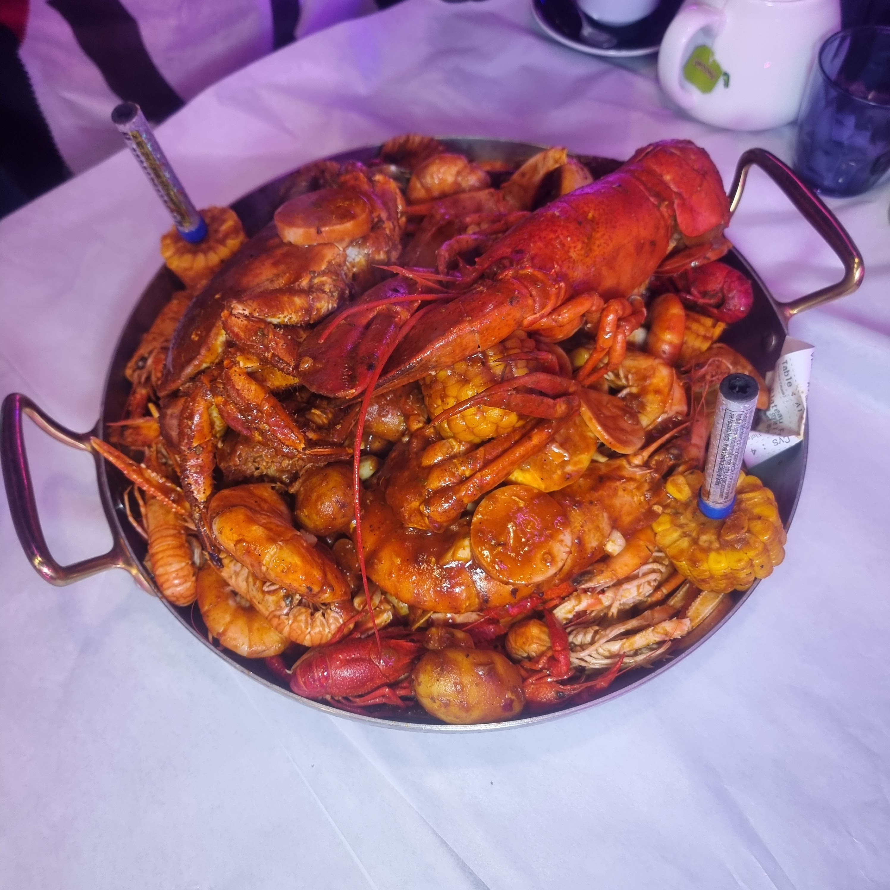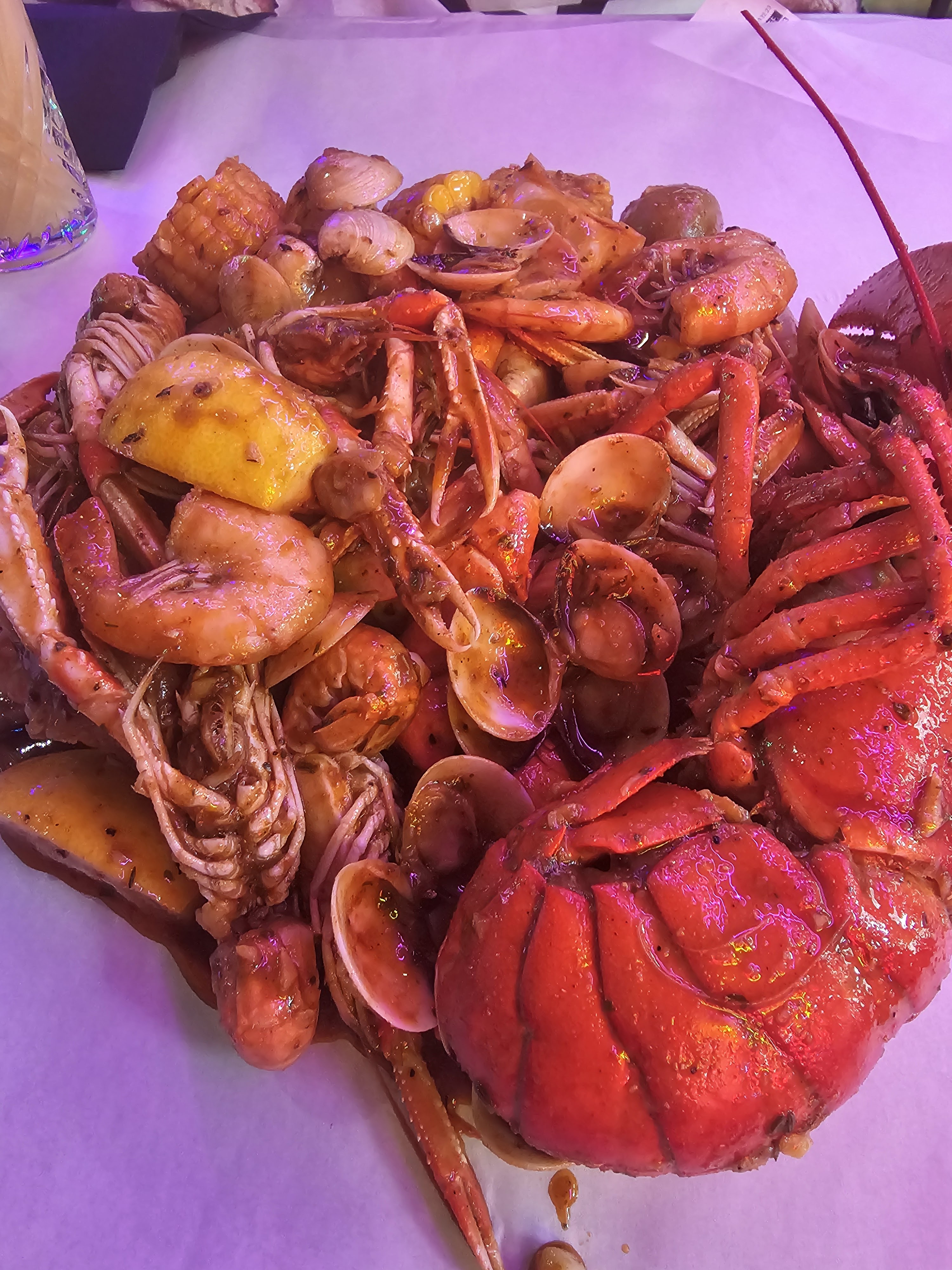 Ce fut une expérience spéciale ma commande du homard des écrevisses des crevettes 🍤 accompagnés de pomme de terre et de mais tt ça debalé à même sur ma table 🙄 gants et tabliers fournis idéal pour un resto entre potes mais pas pour un dîner romantique 😄 autrement pas mal du tt