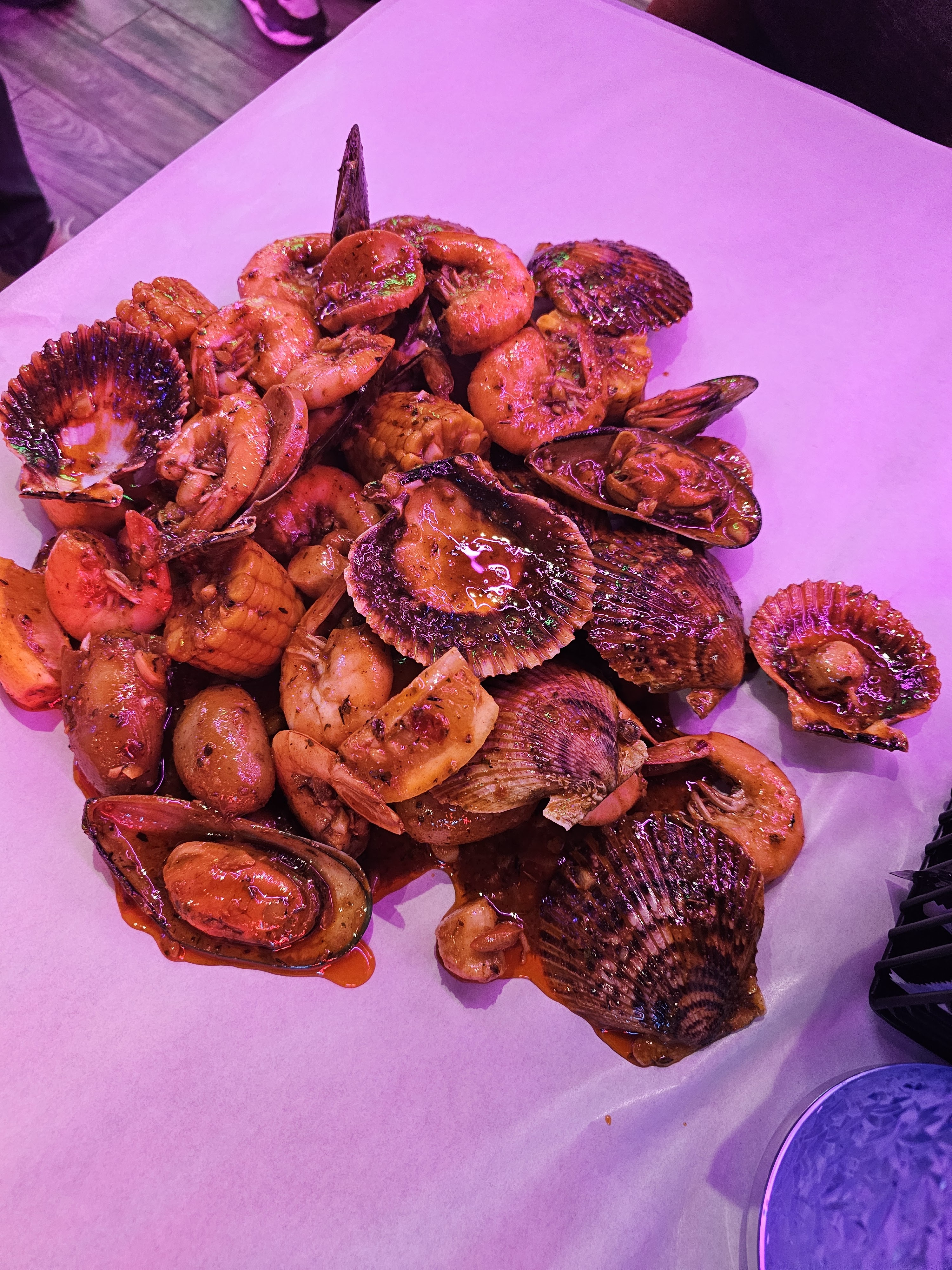 Je ne suis pas un grand fan de Sea Food, Je préfère tout déchirer en viande Mais honnêtement, je trouve le concept plutôt pas mal hormis les millions de coquillages qu’on peut trouver en décoration dans le plat Sur la photo, on a pris le plat 4-6 personnes à 219€. Je trouve qu’il est peu garni sur la photo on dirait qu’il est immense, mais une fois versé en vrai c’est pas si grand quand on est à 6 personnes. Sinon pour le coup Sea Food, pour moi j’trouve que la plupart on le meme gout qu’une crevette. Cependant, il y en a certains où je n’ai pas du tout kiffer le gout (celui qui m’a le plus marqué: écrevisse rouge) Pour l’ambiance, c’est en musique, on dirait un bar bien animé au couleur bien animée