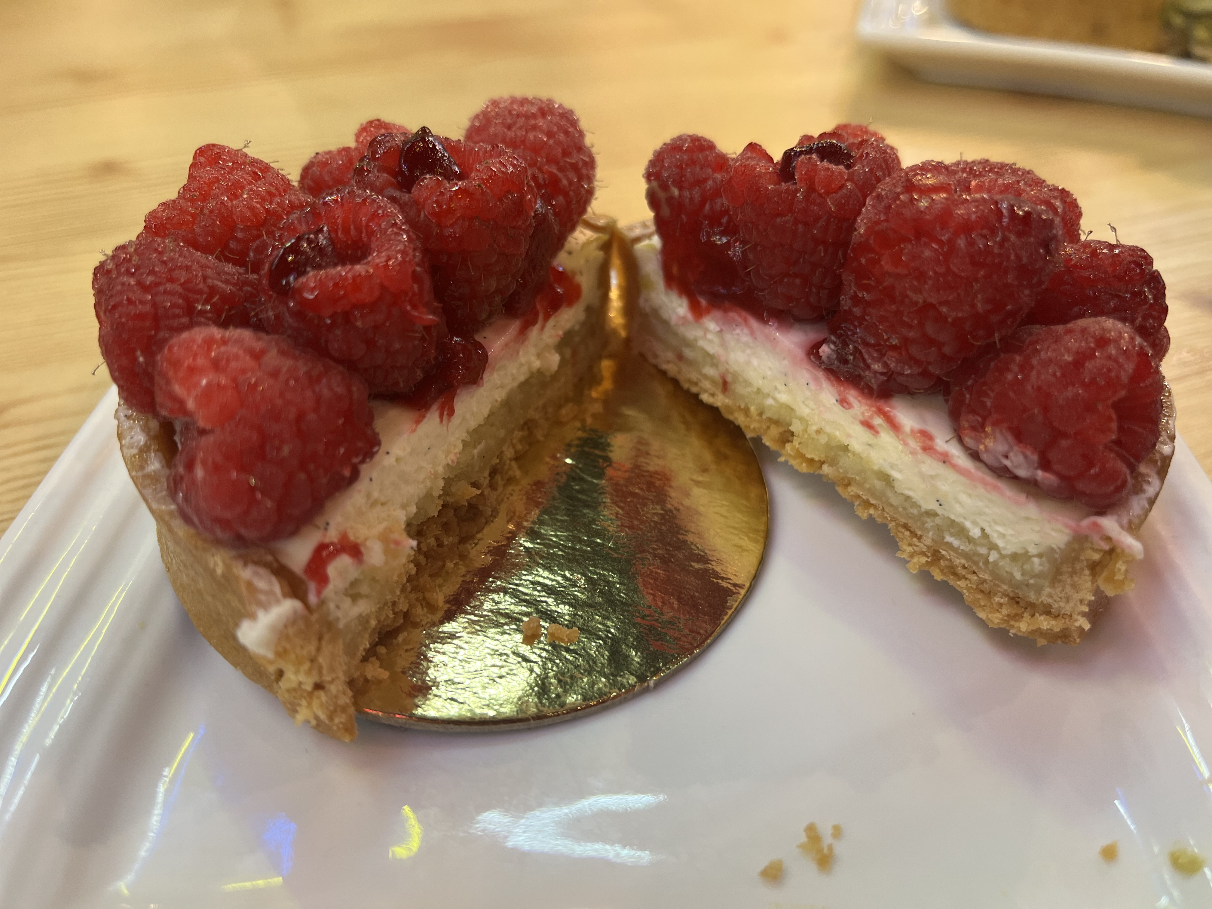 Pardon ??? 10e une tarte aux framboises une personne ? Par principe et pour tester j’ai pris 3 gâteaux, mais les prix sont exorbitants et ne justifient absolument pas le goût ni le travail. Tarte aux framboises insipide Gâteau vanille fade et sans intérêt gustativement Gâteau citron sesam noir réellement infecte J’ai testé je ne reviendrai plus