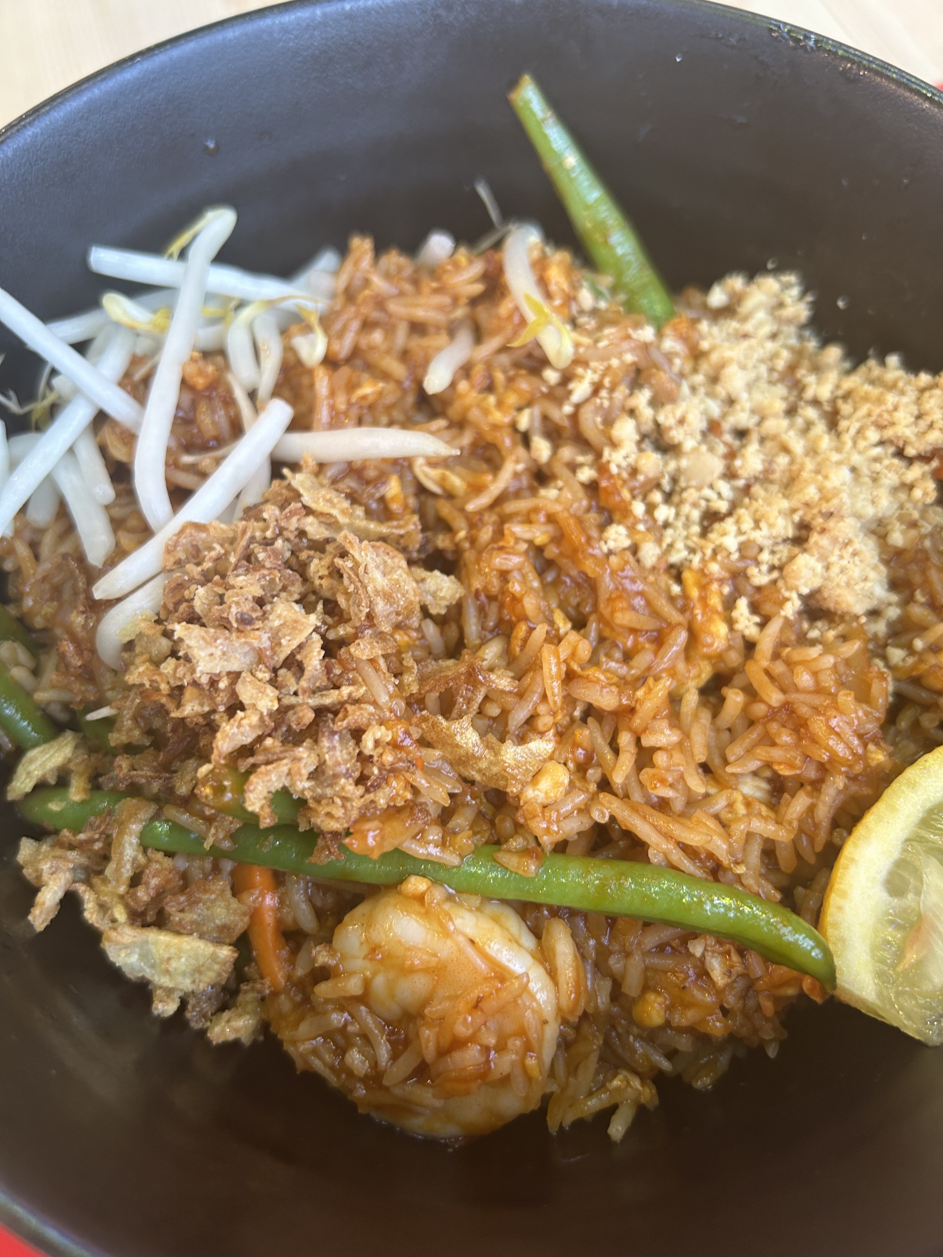 Pad thai pas bon. Pâtes collantes simplement cuites à l'eau (et non sautees) et bien trop cuites. Il manque plein d'ingrédients comme noté dans d'autres avis. C'est fade et juste piquant. Samossas végétariens (en forme de nems !) immangeables, farce pâteuse indéterminée. D'autres restaurants de même catégorie (fast foods) à quelques km aux alentours proposent les mêmes plats dans la même gamme de prix et pour une bien meilleure qualité. Dommage pour le quartier.