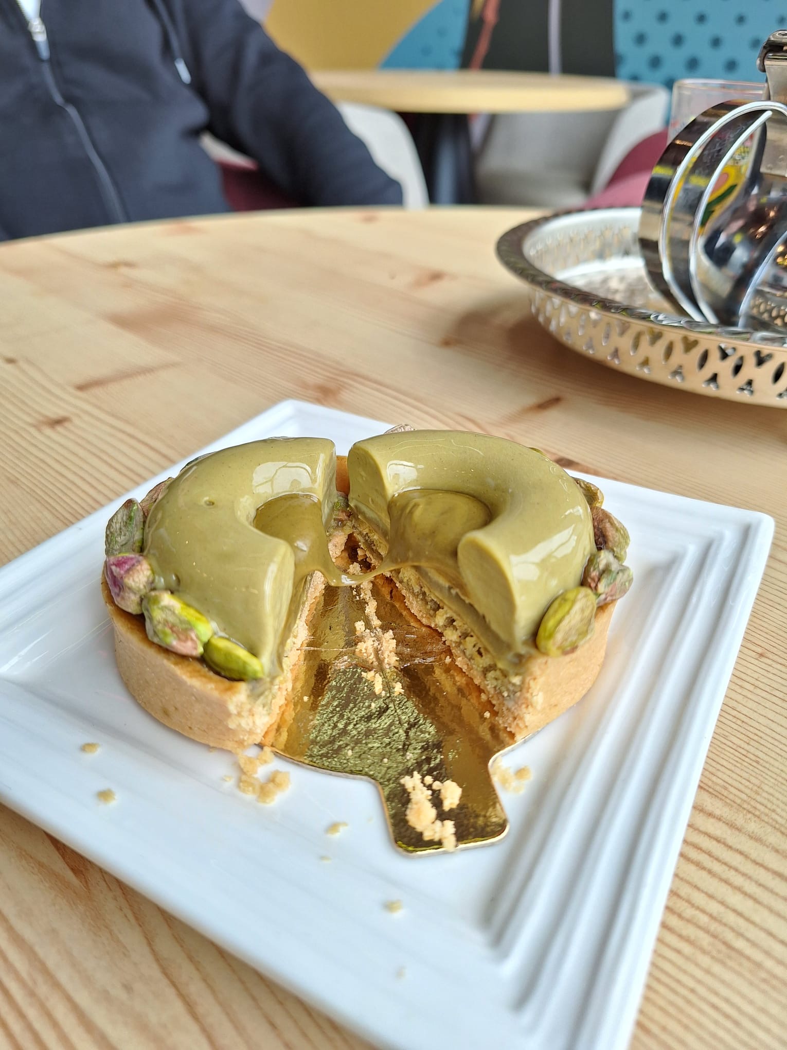 La tarte à la pistache est bonne et la petite touche de coulis excellente 😍. Parfait pour ceux qui n'aiment pas les pâtisseries hyper sucrés 👌🏾. Ce lieux sympa dynamise le quartier. A voir ce que cela va donner au fil des mois.