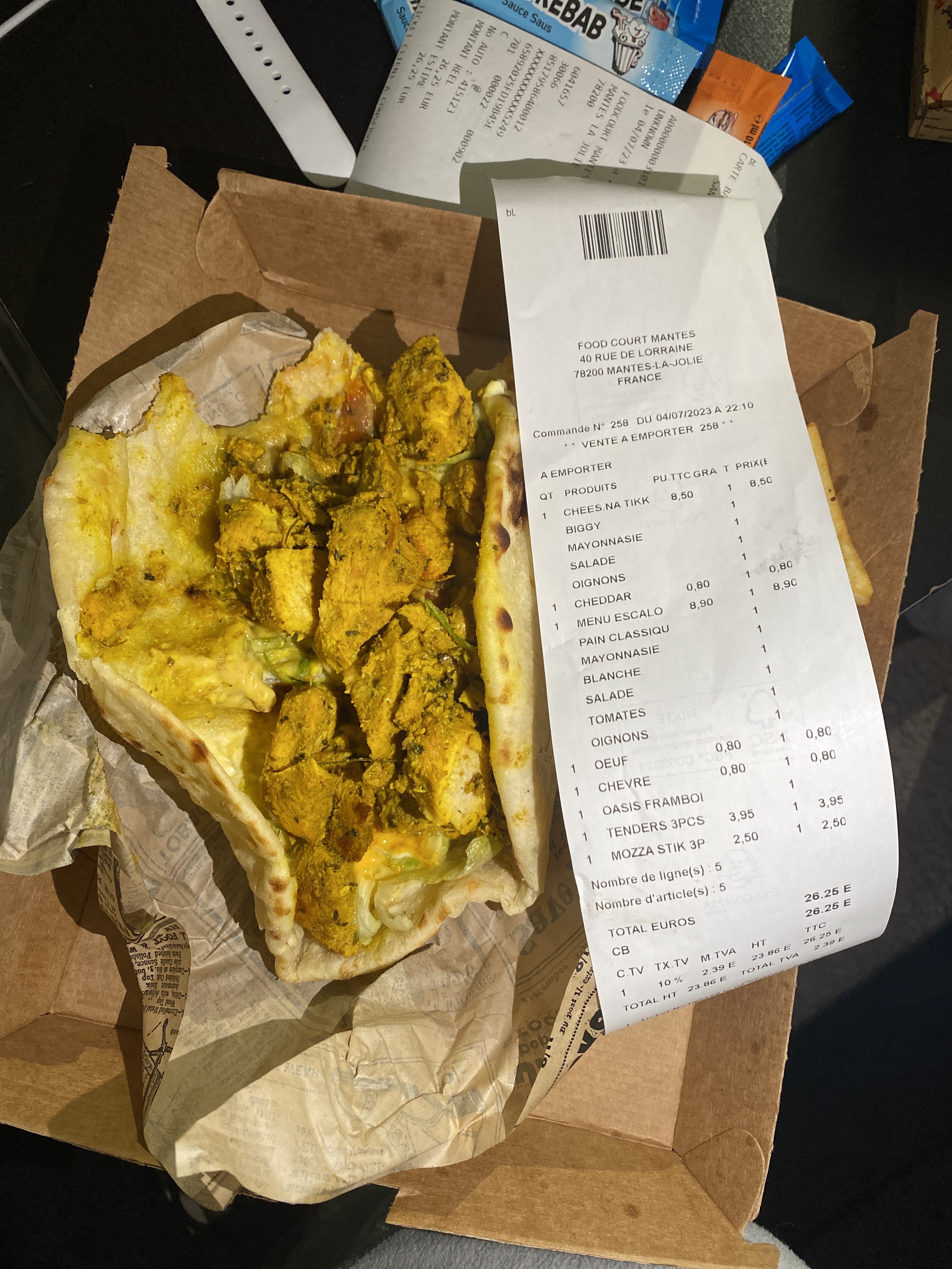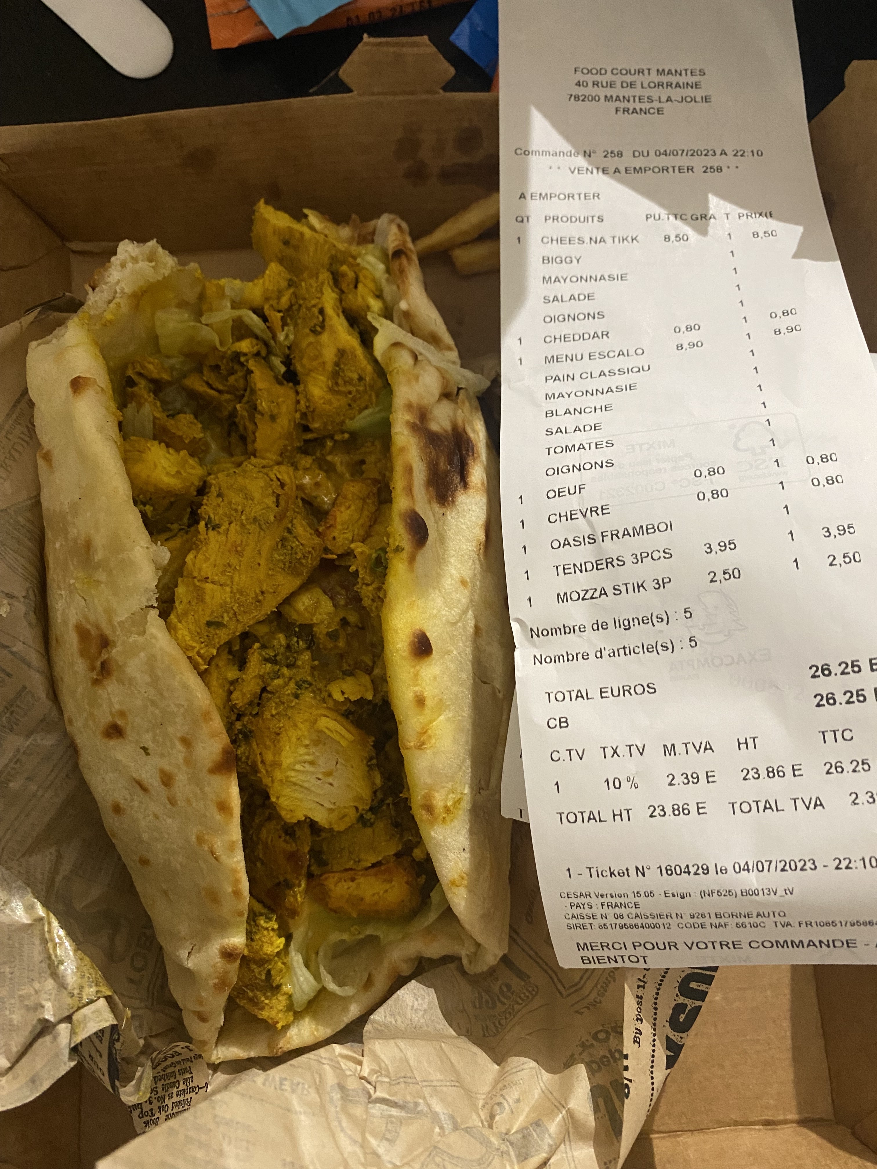 Je suis venu à 20h pour 1 Samdwich tikka et une salade 🥗 césar à emporter frites servi froides
