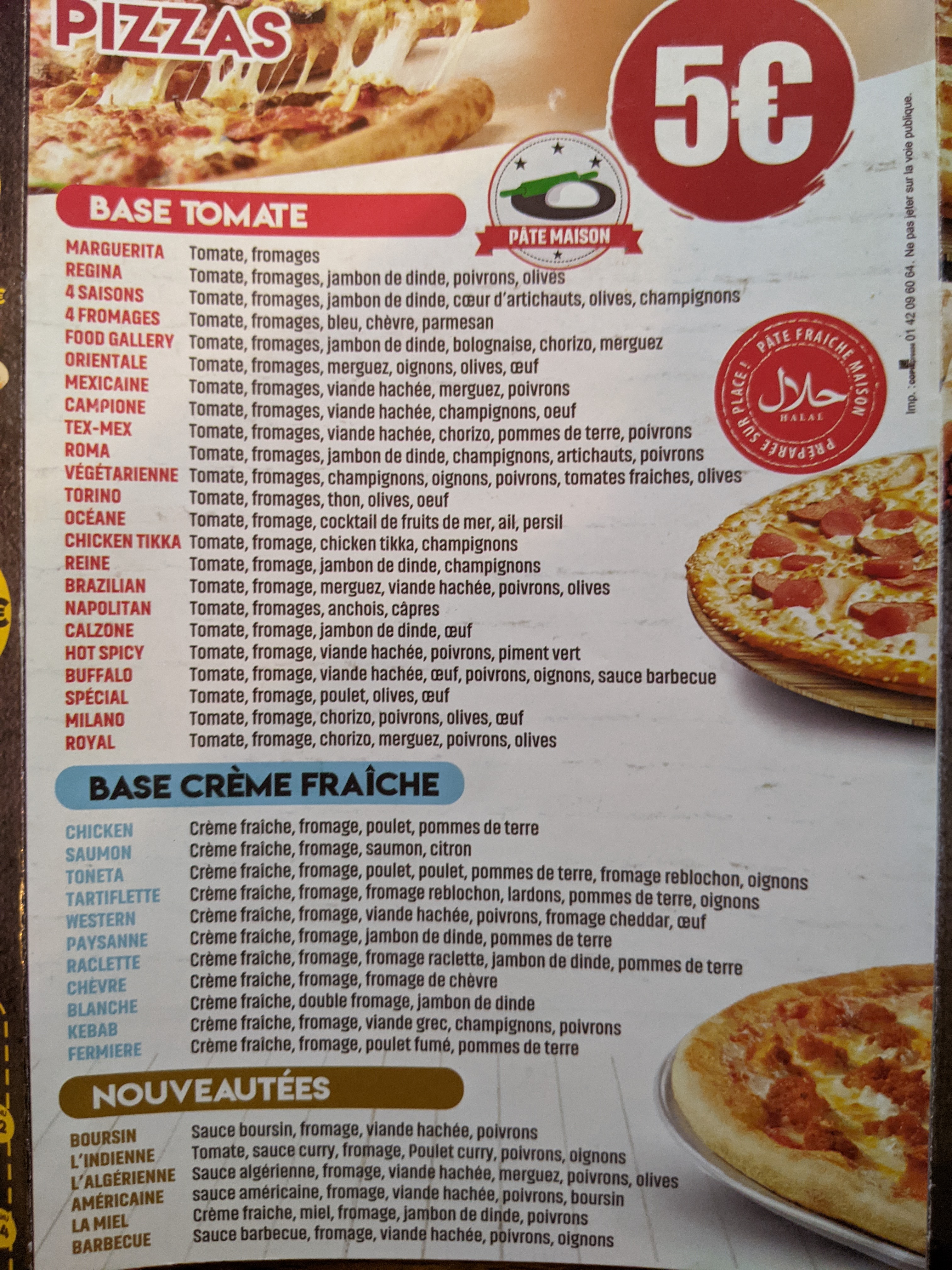Large choix de pizzas menus divers prix correct pas cher pour de la restauration rapide wrap Burger nan dessert boissons