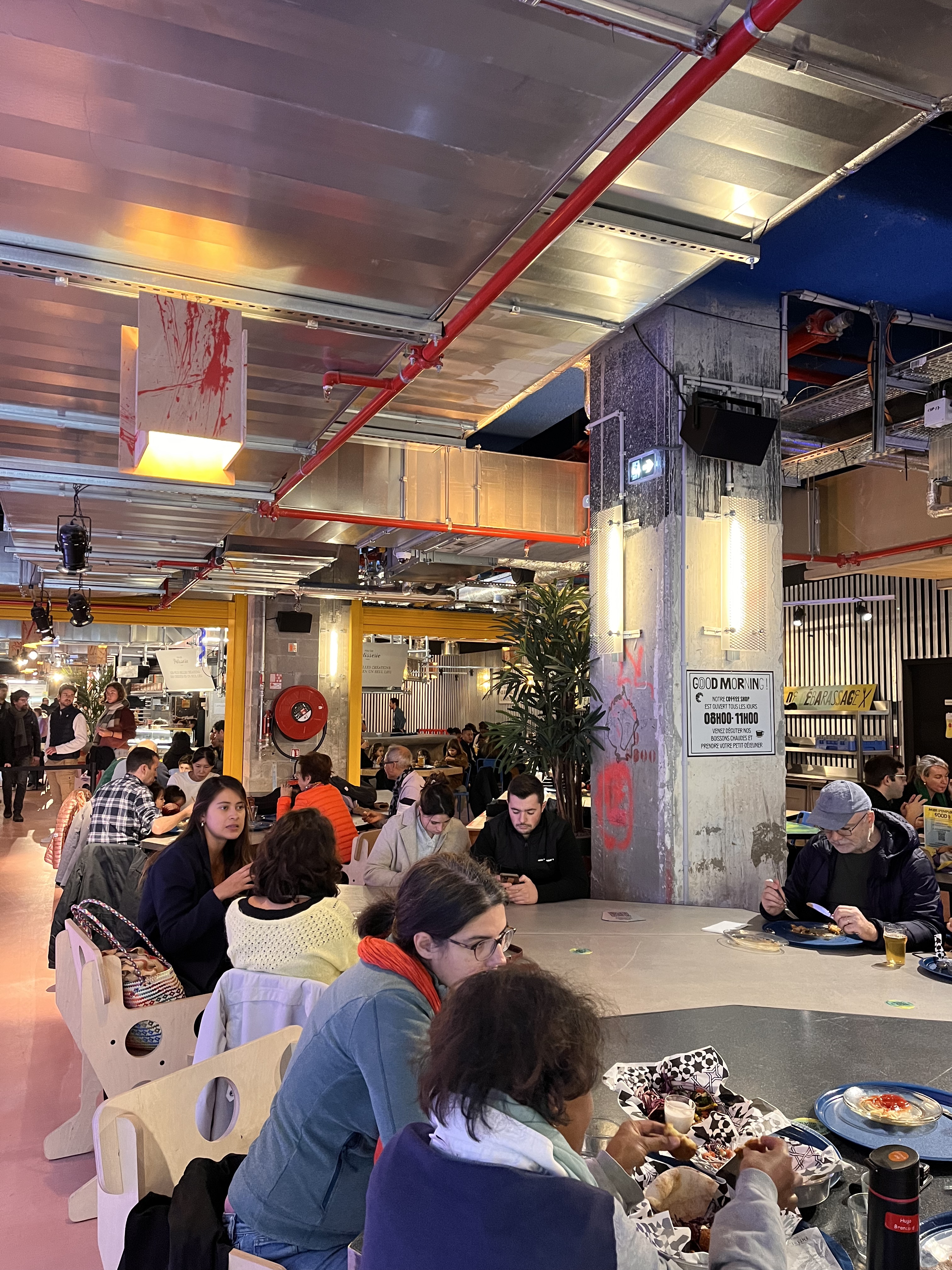 Super concept ou chacun peut manger un plat différent. Il y a des cuisines diverses et variées. Ambiance industrielle, chaleureuse et beaucoup de places assises.