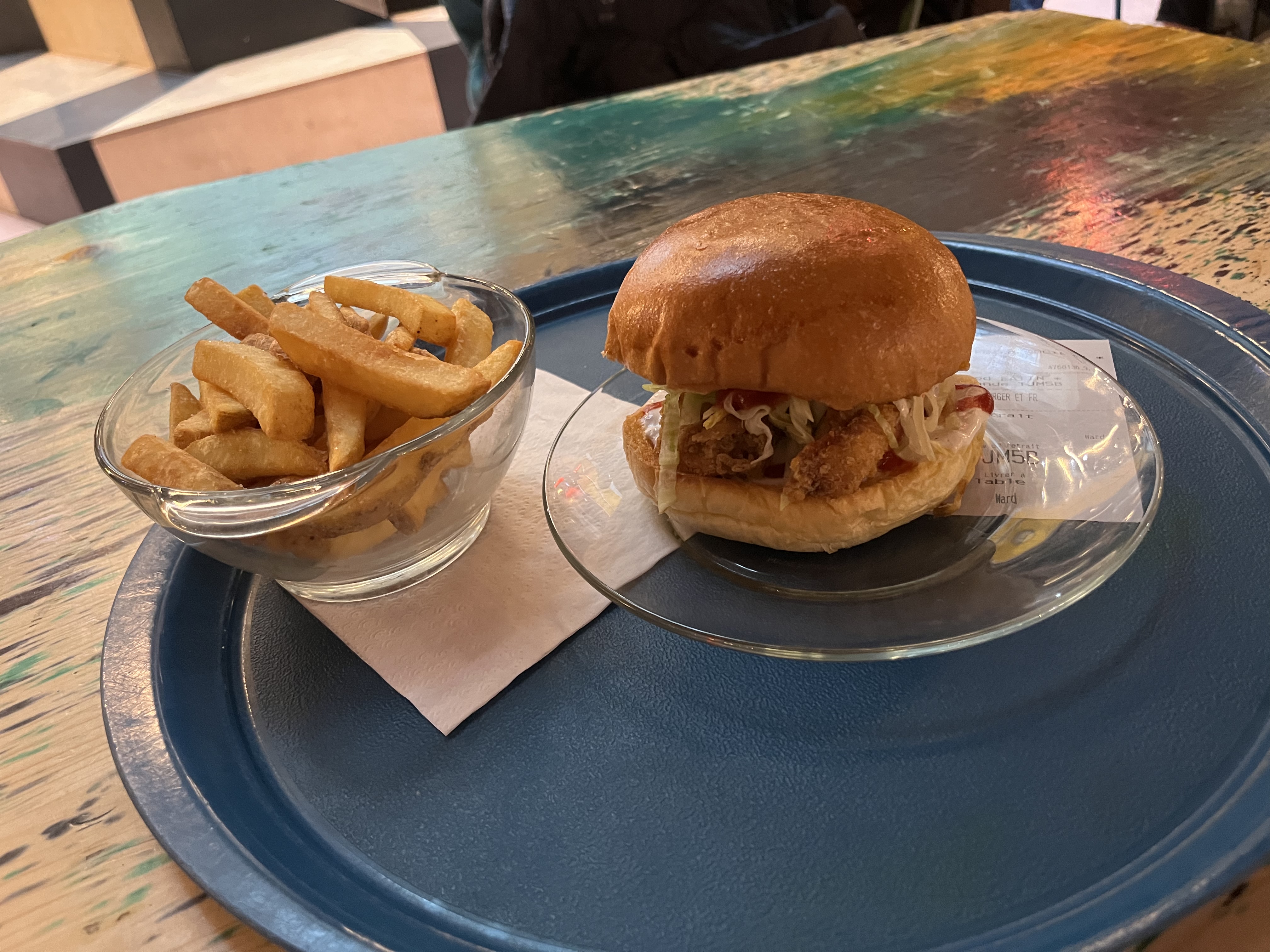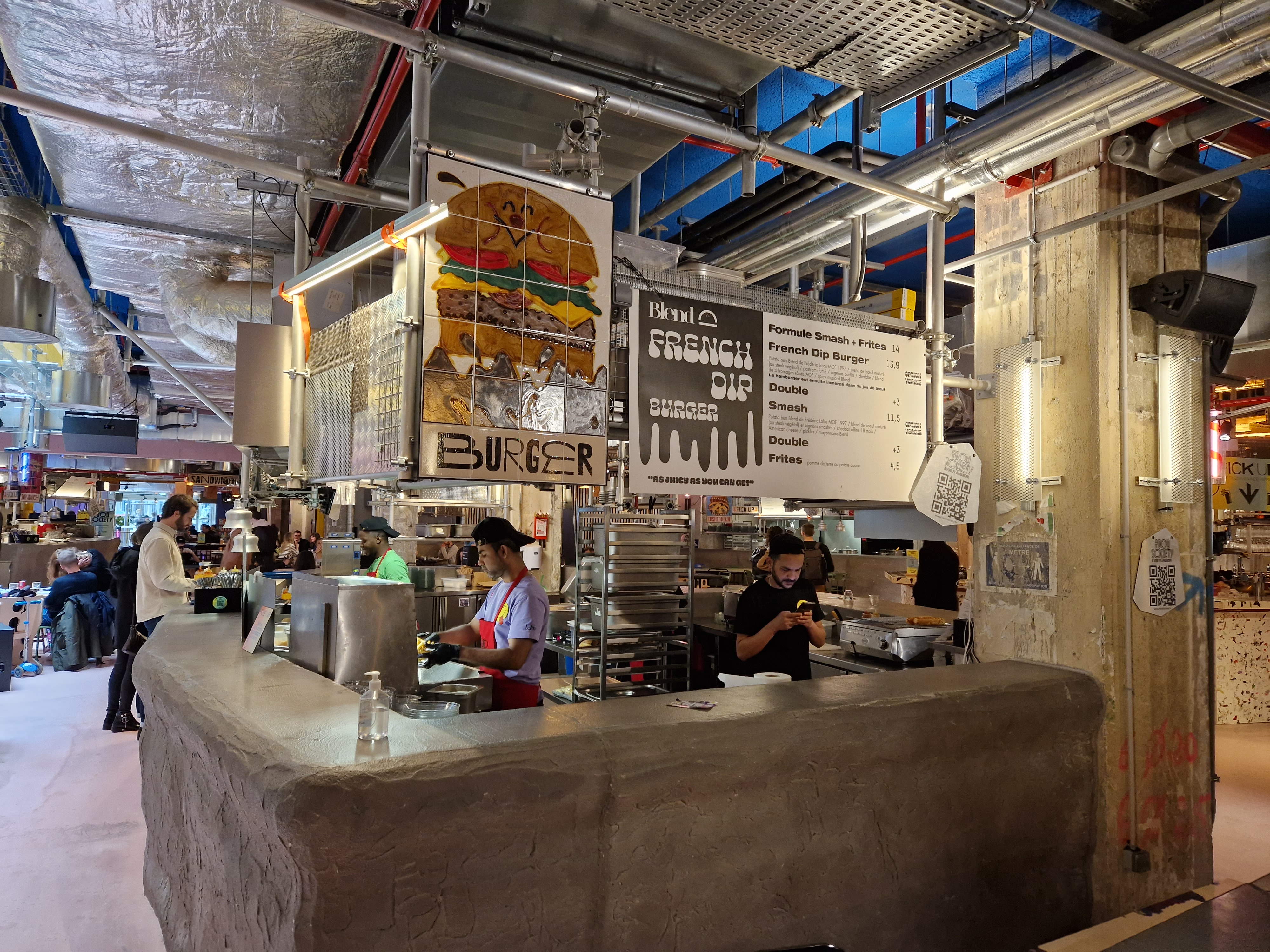 J'ai visité plusieurs halles/aires de restauration à Paris, et celle-ci ressemblait le plus à une aire de restauration telle que je l'ai connue et utilisée dans le passé. Vous scannez un code QR et créez un compte pour parcourir les menus parmi une sélection décente de différentes cuisines culinaires, puis commandez en conséquence. Vous recevez une notification sur votre téléphone lorsque la nourriture est prête. J'ai opté pour un cheeseburger double smash, comme le montre la photo. Un peu petit peut-être, mais c'était sacrément savoureux. Je ne suis généralement pas fan des cornichons et je prends mes hamburgers sans eux, mais cette fois, les cornichons ont été incorporés dans une sauce avec autre chose, et c'était en fait très bon. Les frites étaient également très bonnes, super croustillantes et elles ont une saveur subtile sur l'enrobage que je n'arrivais pas vraiment à situer. La collecte réelle de la nourriture pourrait cependant être bien améliorée. Il y avait des zones dans chacun des stands de nourriture pour récupérer la nourriture une fois prête, mais dans la pratique, notre nourriture n'y arrivait jamais et nous devions aller la chercher. C'était aussi la même chose avec les boissons. Bonne nourriture, la collection actuelle pourrait être meilleure.