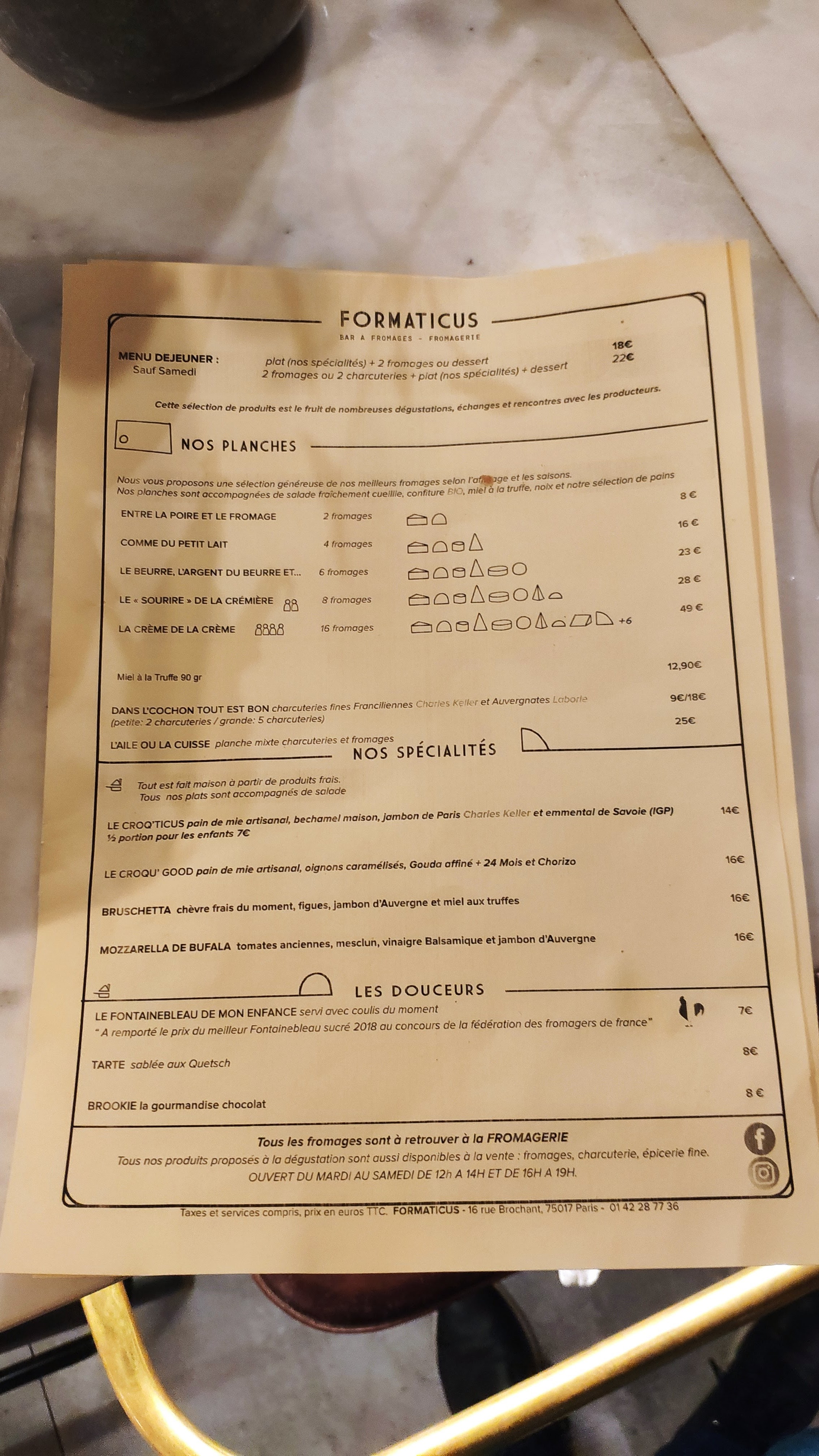 Le bar à fromages boutique est installé dans une ancienne boucherie. Certains détails de déco sont d’époque, et confèrent une certaine authenticité au lieu. Côté boutique, on trouve du fromage, mais aussi des confitures, du miel, du vin… Tout ce qui peut accompagner le fromage. Côté restaurant, la carte propose forcément du fromage. Vous avez le choix entre plusieurs planches, aux sélections de fromages plus ou moins larges. Ou encore des spécialités fait maison à base de produits frais, comme le Croq’ticus, un croque-monsieur version Formaticus, servi avec salade de saison. J’ai opté pour la planche mixte. Le chef a servi la planche en détaillant l’origine de chaque fromage et charcuterie, et en indiquant l’ordre de dégustation. Mes papilles frétillent encore à l’évocation de ce dîner. Notamment au souvenir du miel à la truffe qui accompagnait le fromage de chèvre.