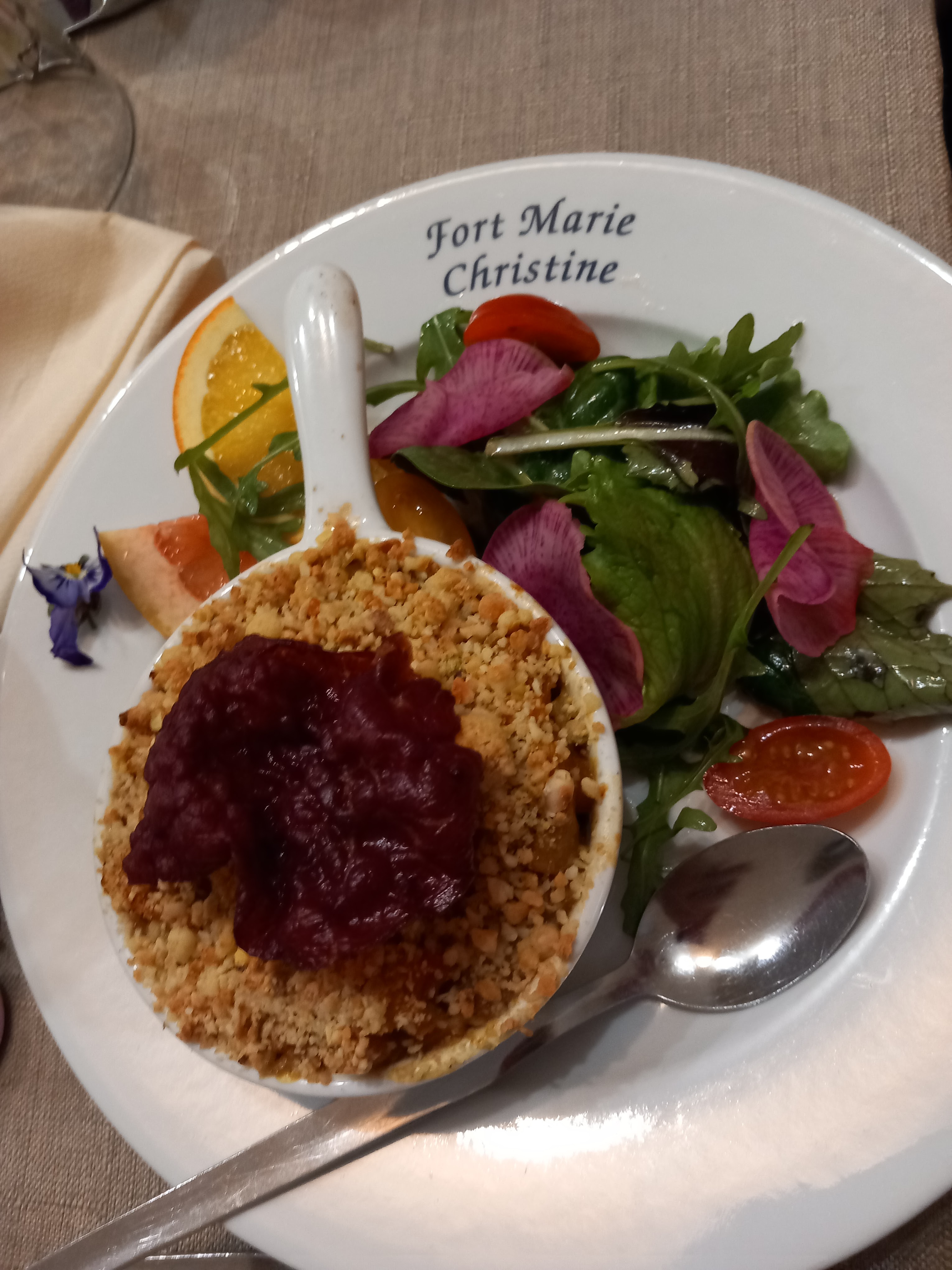 Un repas bien cuisiné avec de bons produits ,sauf le dessert qui paraissait chimique,Charlotte aux fraises sans fraises , qui en réalité était une mousse aux fraises,et une omelette norvégienne myrtille sans goût . Bel endroit et la dame qui nous a reçu était charmante et très professionnelle Nous y retournerons pour faire du VTT car nous avons encore beaucoup de chemins à découvrir et nous prendrons bien entendu nos repas dans ce fort magnifique.