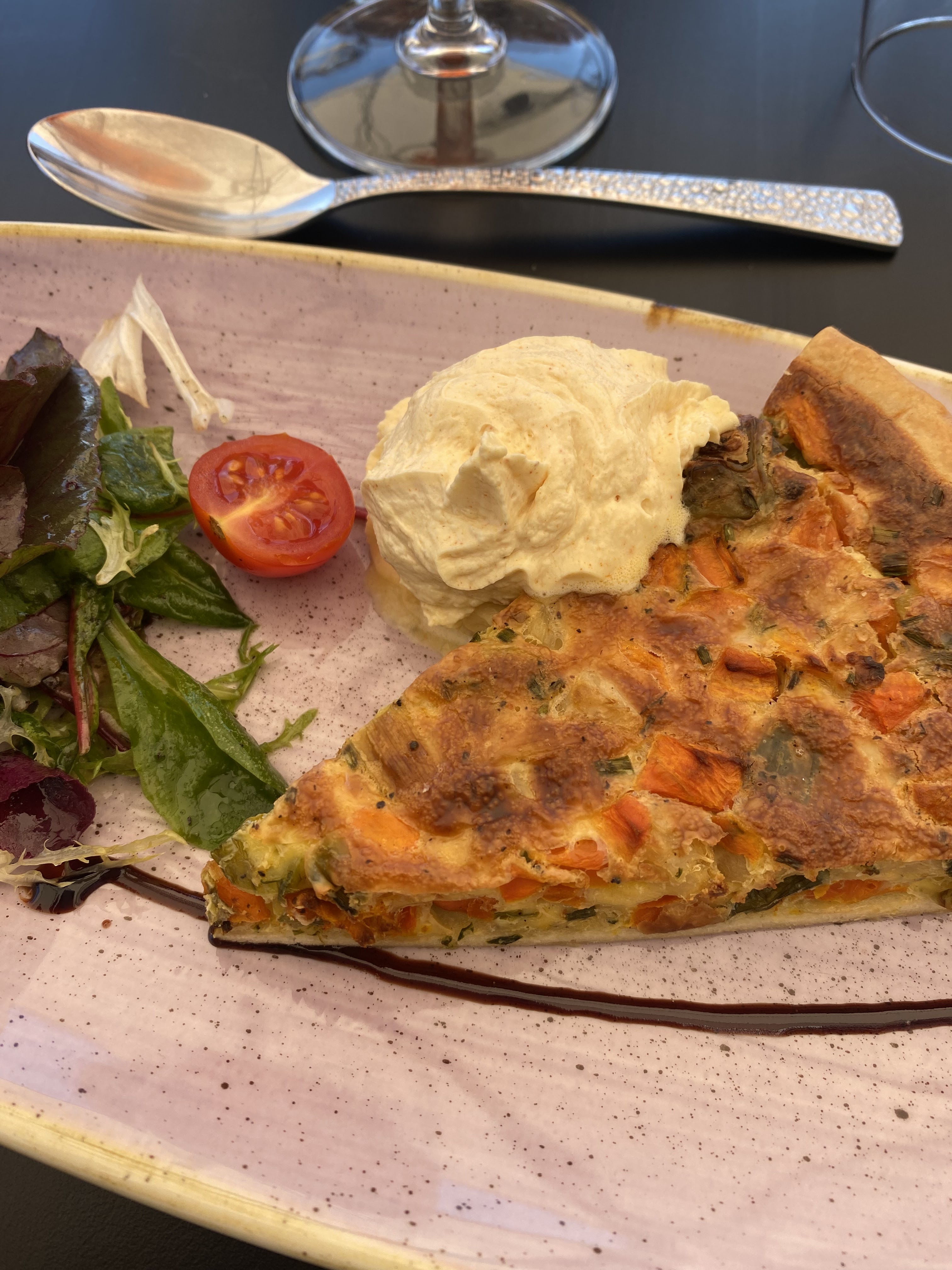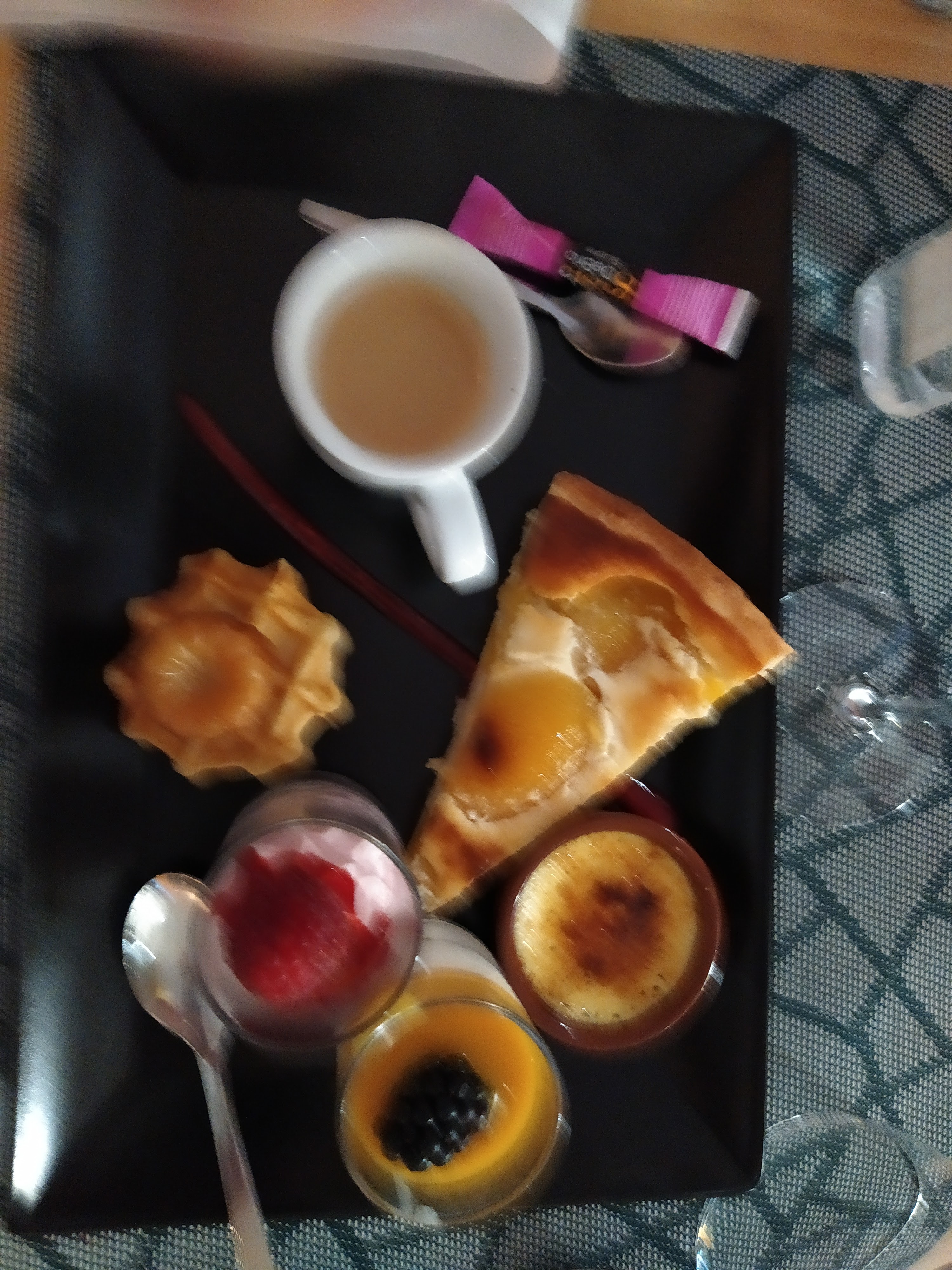 Superbe vue depuis la terrasse. Agréable. Côté cuisine, c'est moyen : une verrine moyennement assaisonnée en amuse-bouche, une quiche aux légumes en entrée correcte, une pintade un peu trop cuite avec un accompagnement à base de champignons un peu trop gras, et un dessert correct.